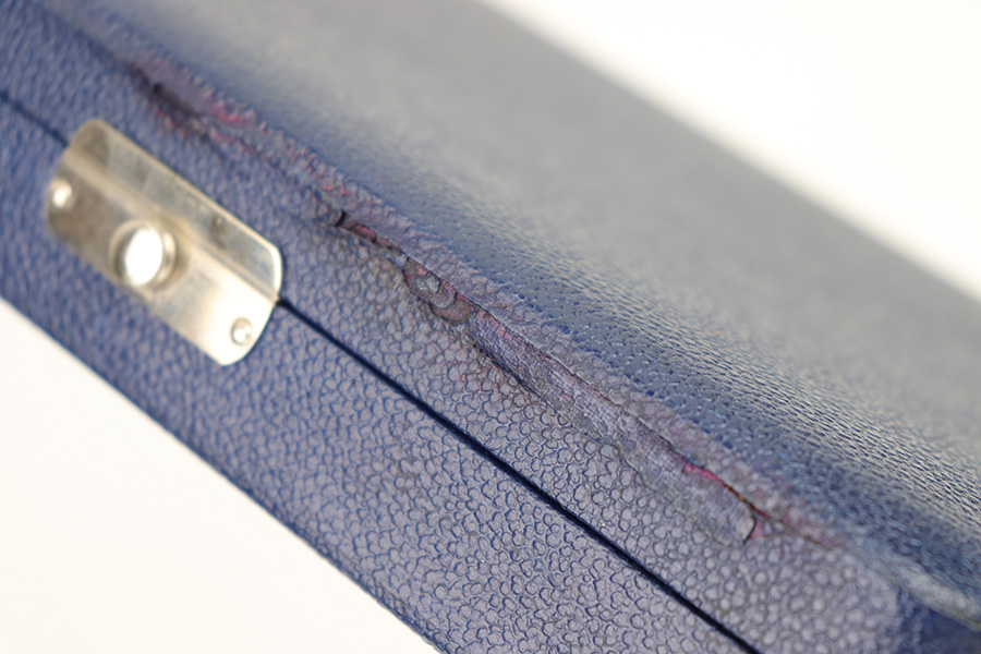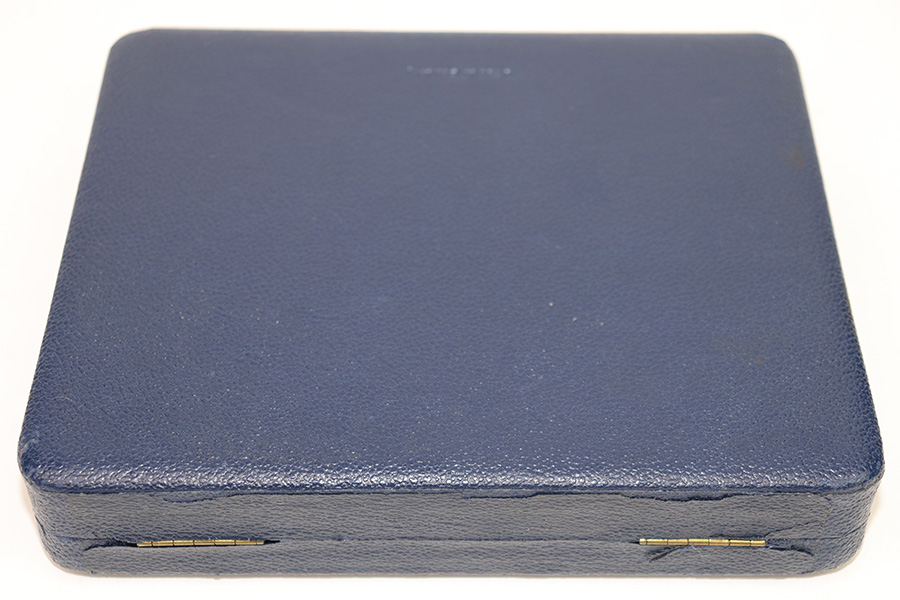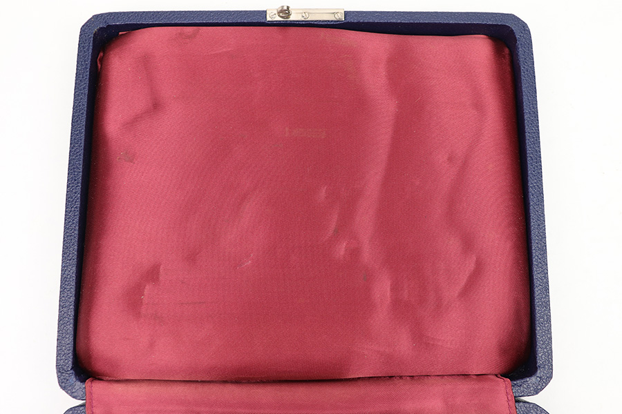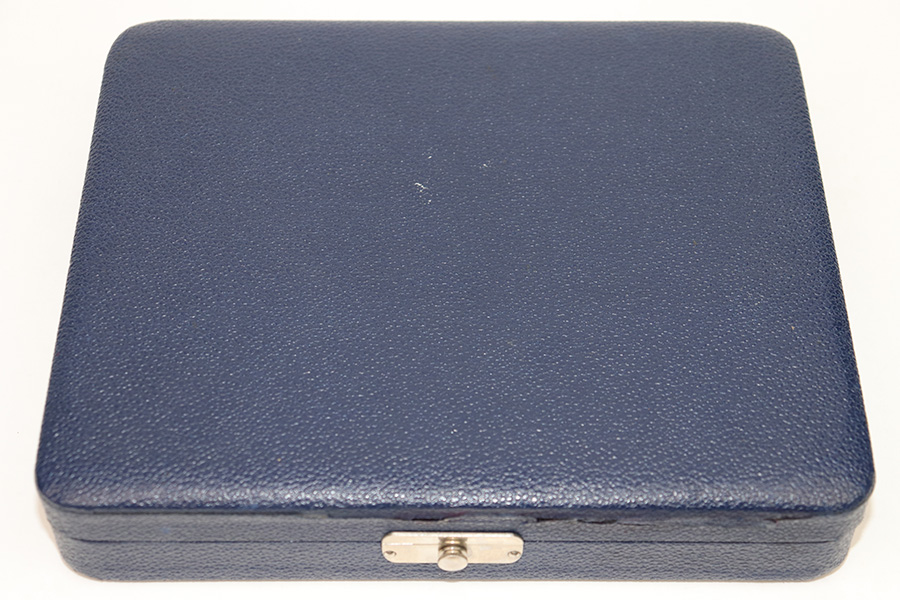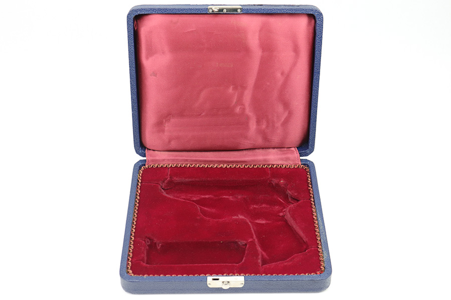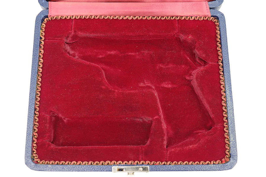 3/6/23 – This is a 1960s production Walther PPK presentation / display case. The case has a blue pebble-grain leather exterior and red cloth-lined interior. The lid interior padding has some mild padding loss, but this is typical and not excessive wear. The red velvet base interior is in great shape. The exterior is also in great condition although there is some cracking along the front of the case near the opening hinge, as shown in photos.
