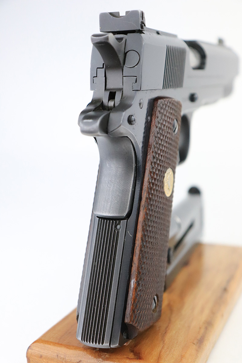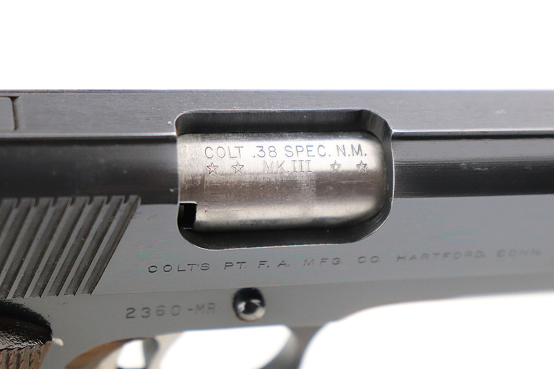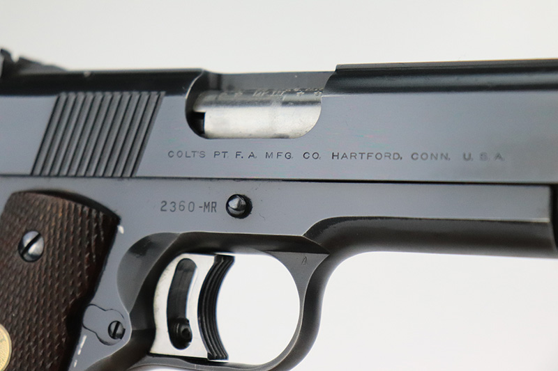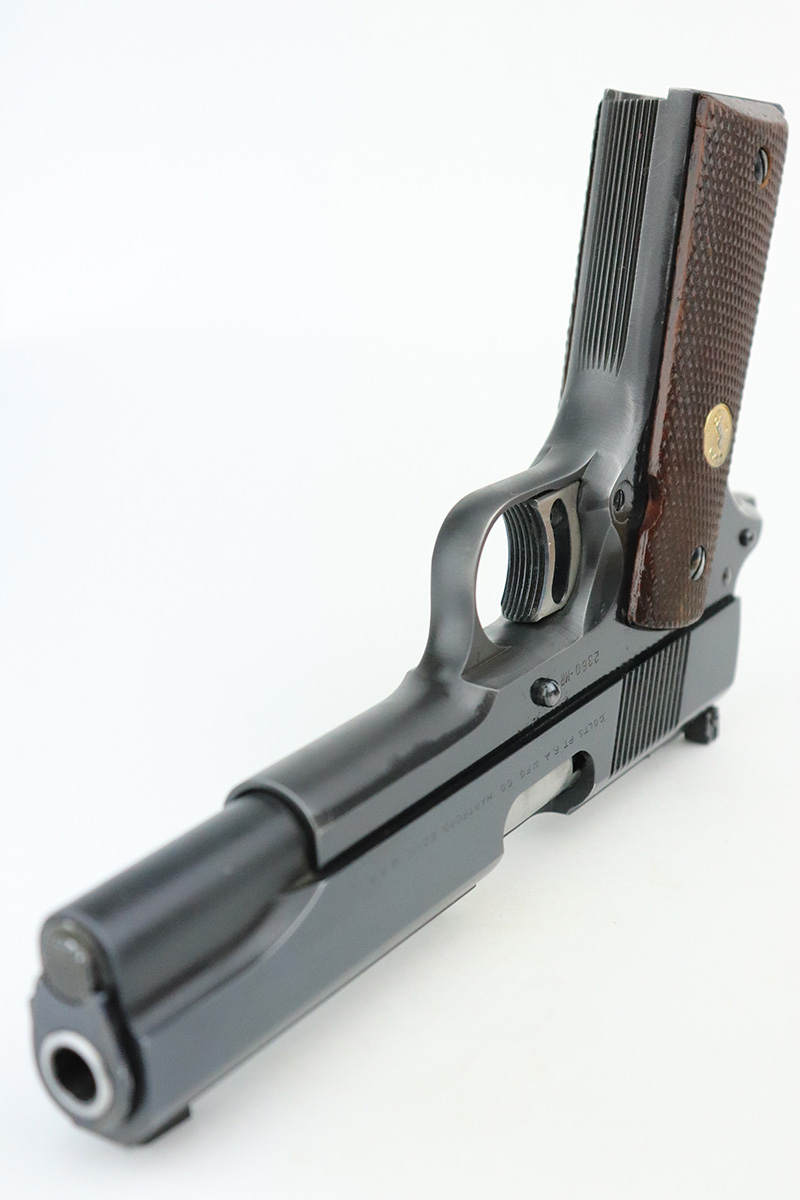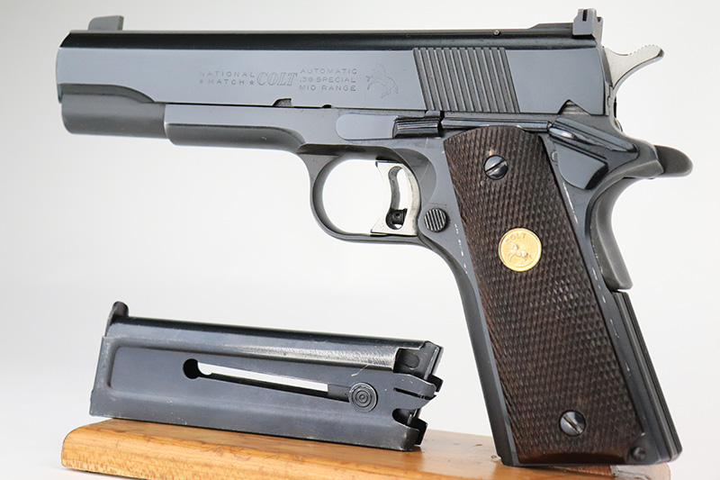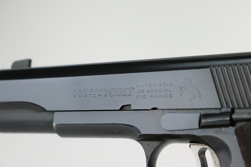 10/7/22 – This is a minty example of a Colt National Match Mid Range Model 1911, manufactured in 1961 and chambered in .38 Caliber. It is all matching and has retained nearly all of its original finish with just the faintest hint of thinning on both grip straps and some very light streaks of wear on the frame around the edges of the grip panels. Comes with excellent wood grips and one proper magazine. Mint bore. The action is incredibly smooth. The slide does not lock back on its own.