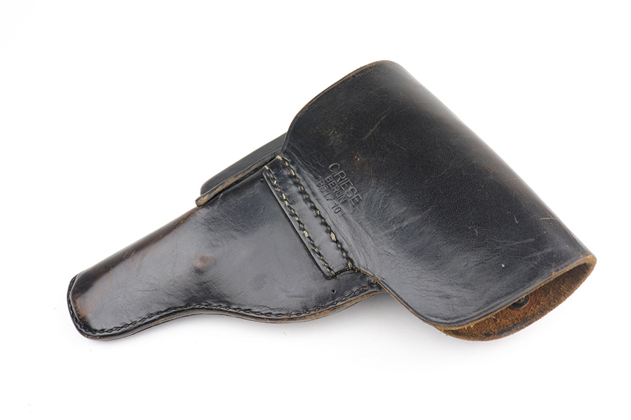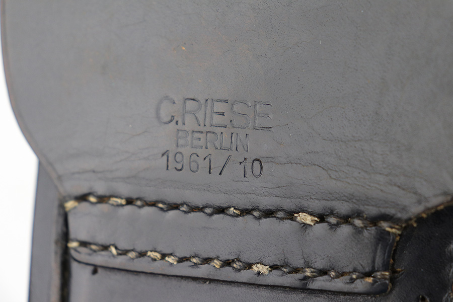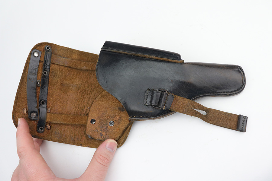9/20/21 – This is a post WW2 production P.38 holster. Dated 1961 and maker stamped on the back leather. All leather and stitching in great condition with no major issues. Mild use wear.