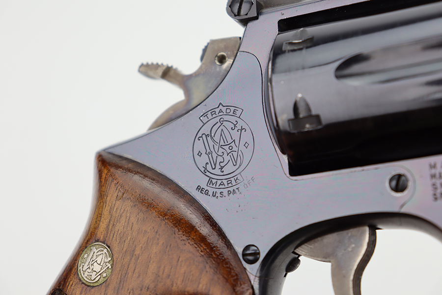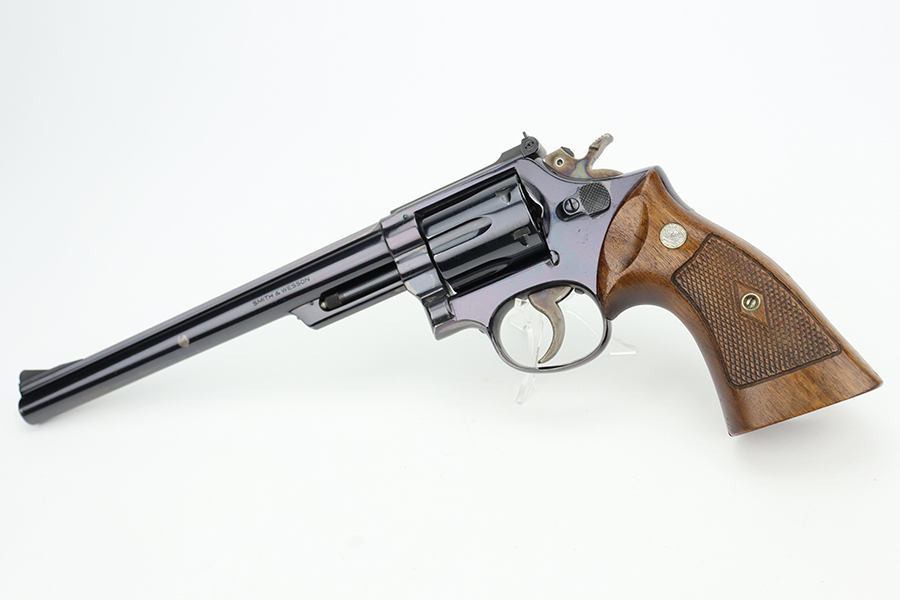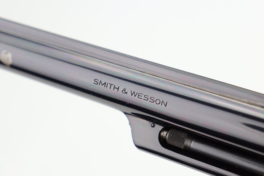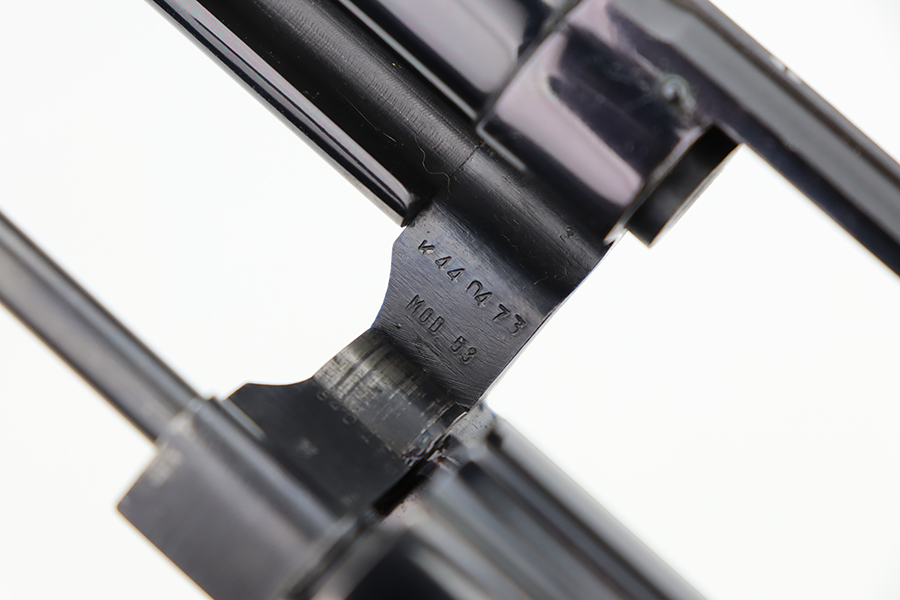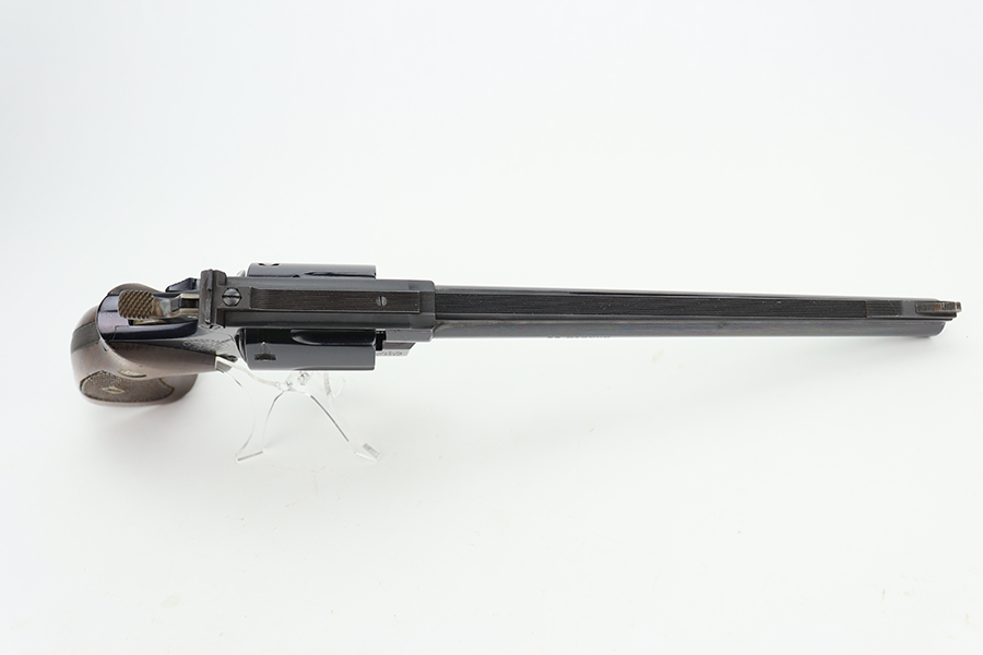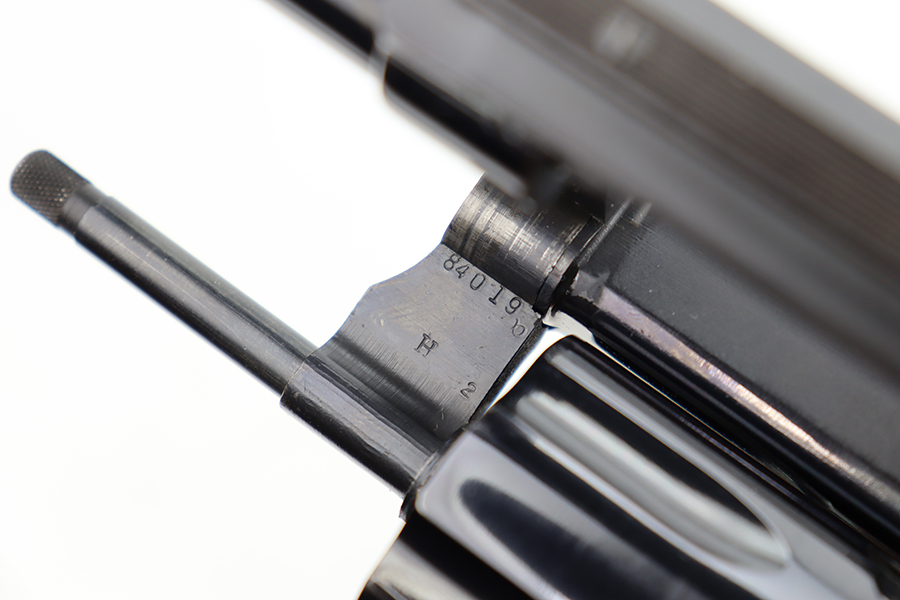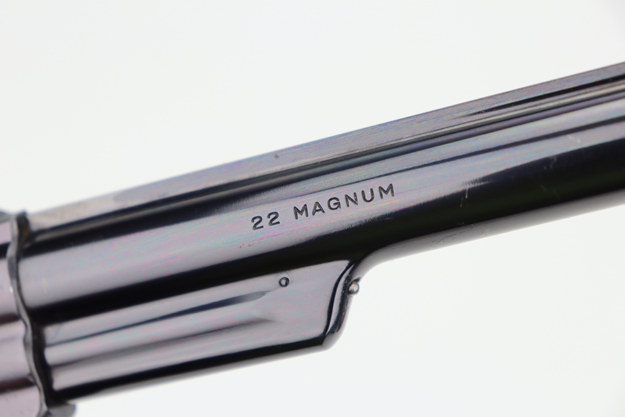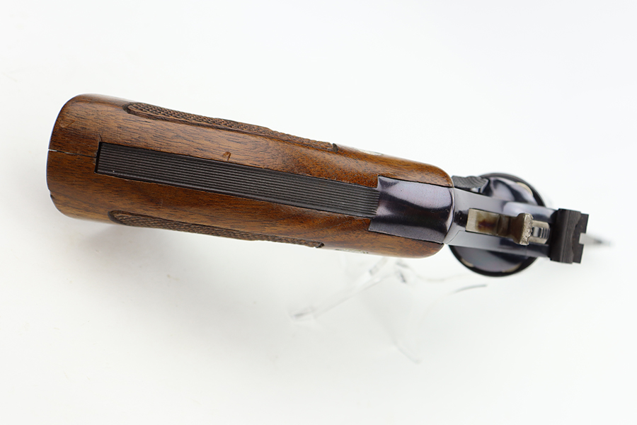 6/24/24 – This is an excellent example of a Smith & Wesson Model 53, manufactured in 1961. Chambered in .22 Jet with a 8 3/8″ barrel. It has retained about 97% of its original high polish finish. Very minor muzzle wear with a few small spots of discoloration on the barrel. Excellent case-hardening on the hammer and trigger. Fitted with excellent hand-checkered Walnut grips. Mint bore. The revolver has cylinder inserts to fit the necked .22 Jet cartridges.