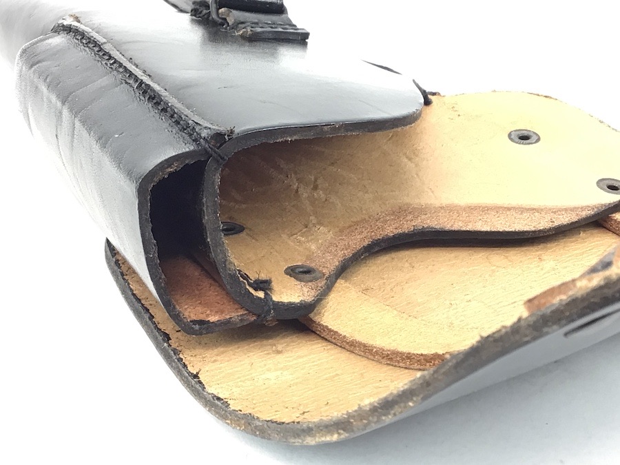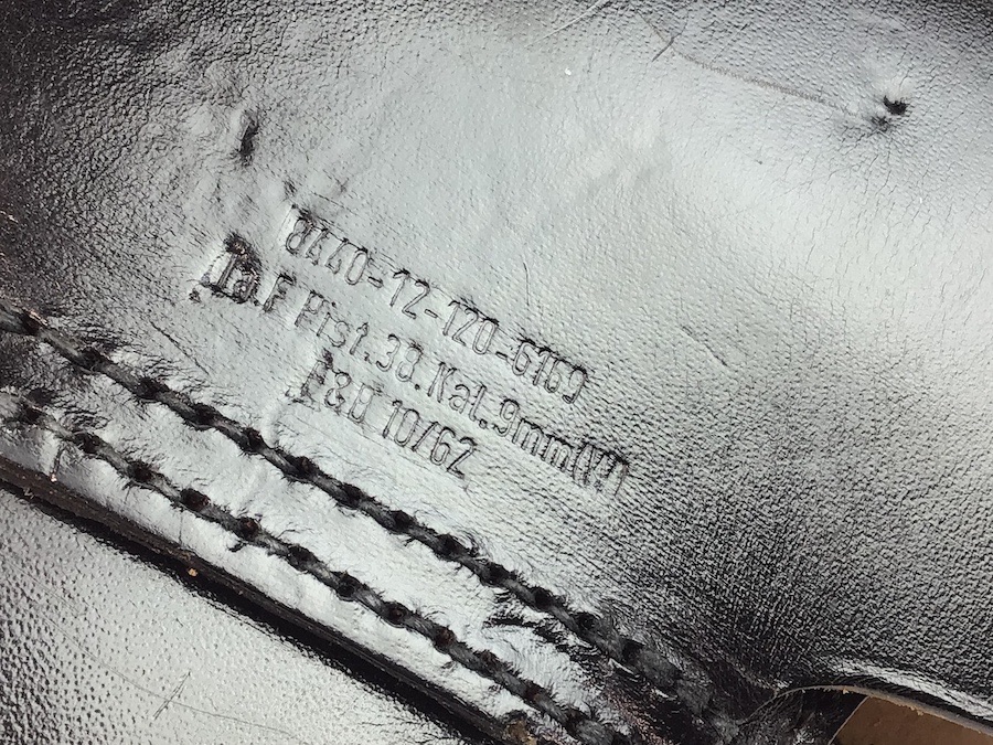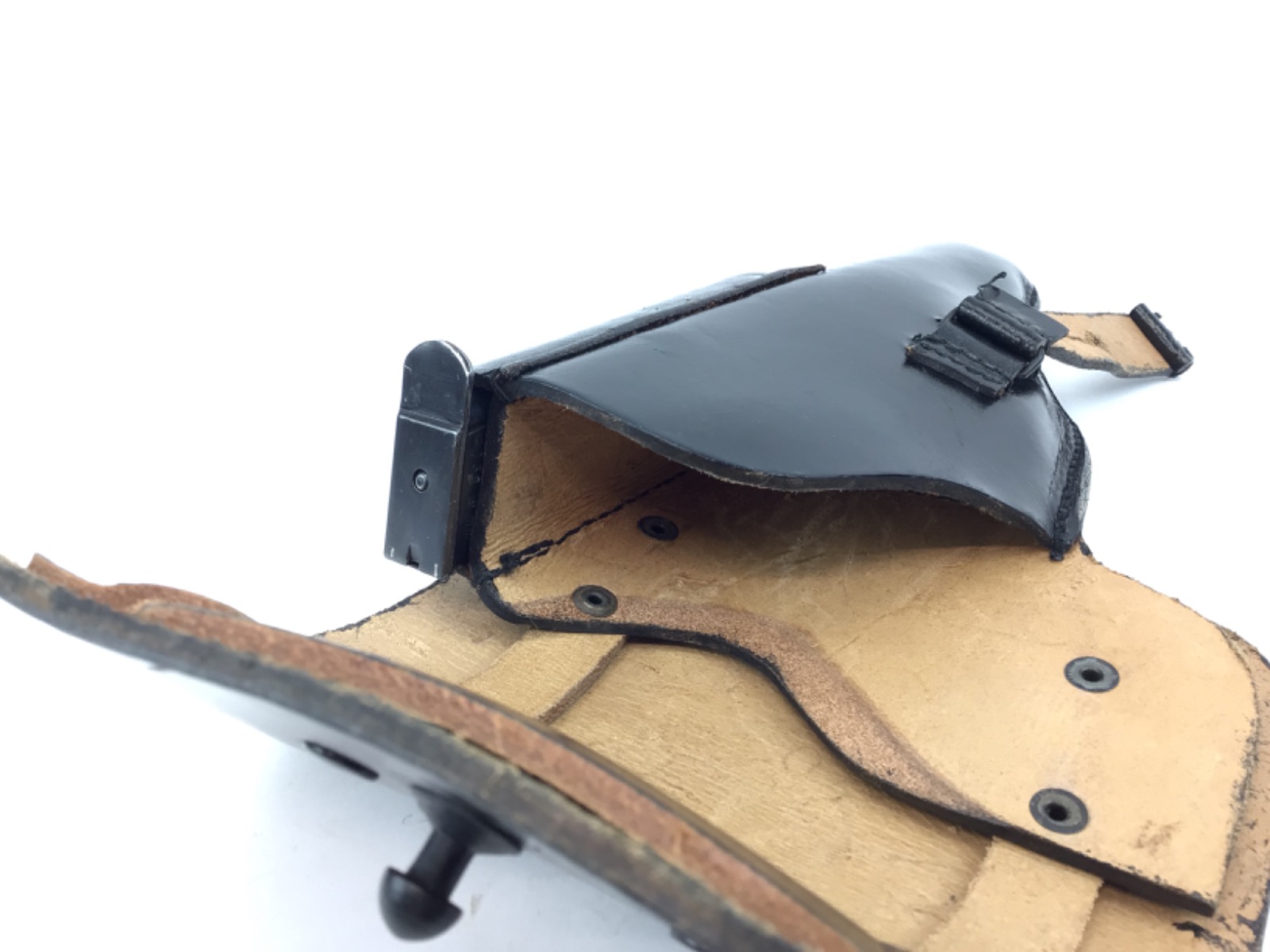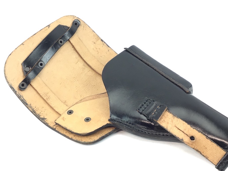 5/28/22 – This is a post WW2 production P.38 / P1 9mm holster. Dated 1962 and maker stamped on the back leather “F&B”. All leather and stitching in excellent condition with no major issues. The magazine is dated 1960 on the spine. Smooth strong spring.