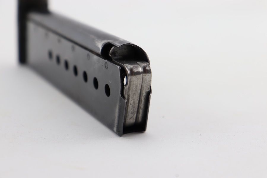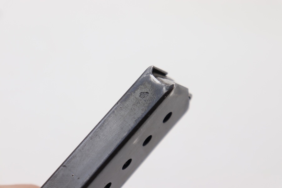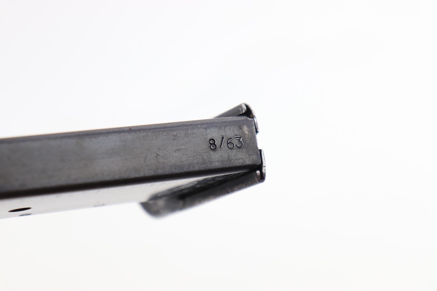 2/9/24 – This is a great condition 1963 Walther P.38 magazine. Most of the finish loss is on the front spine and footplate; otherwise, the tube retains 85+% % of its original finish. The foot plate is slightly bent upwards. The bottom left side shows the Walther banner with P38 9mm, and the spine is dated 8/63 with a proof stamp. Strong functional spring.