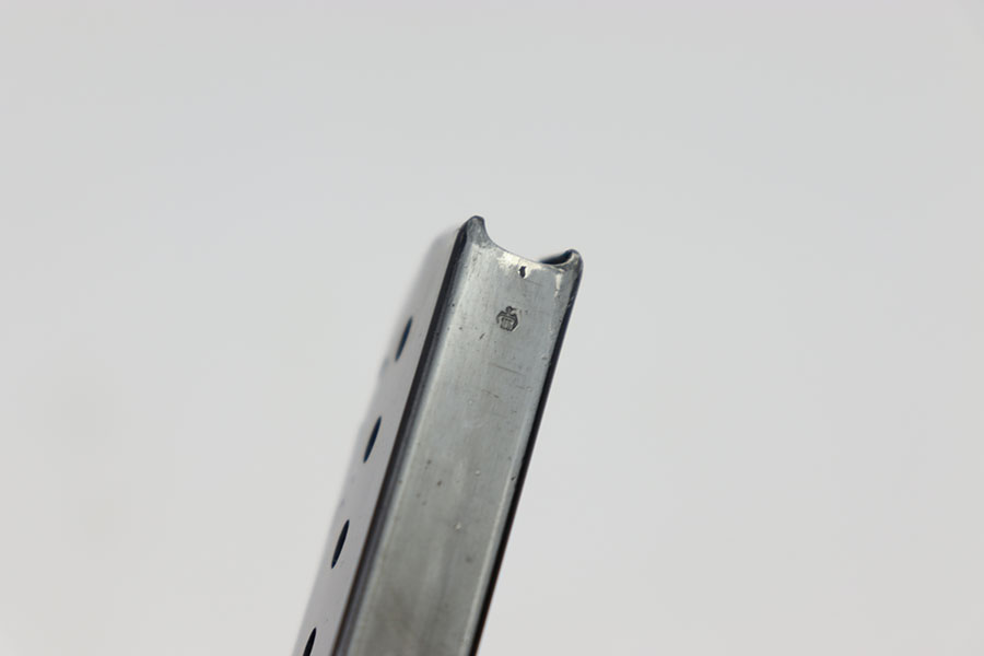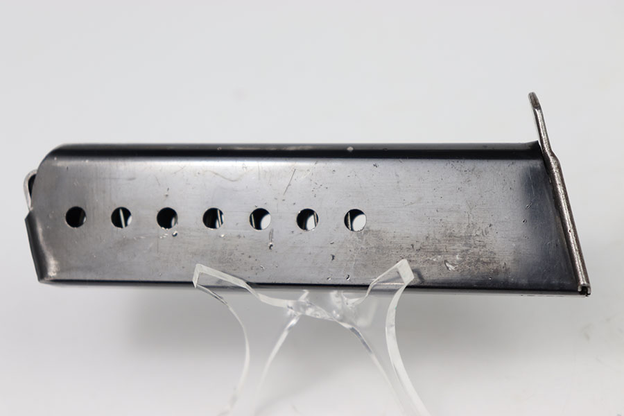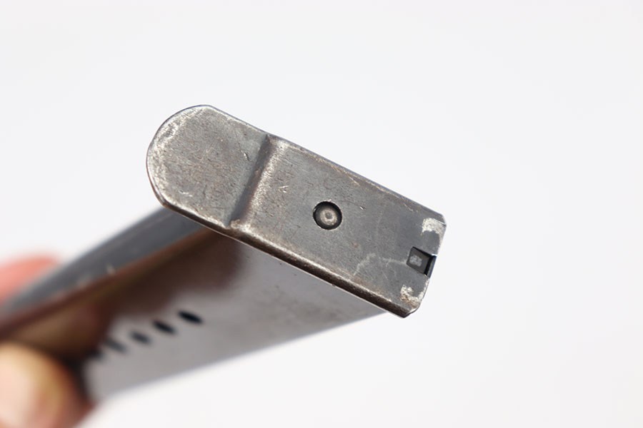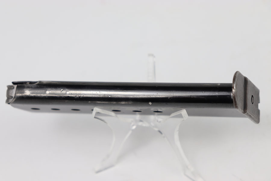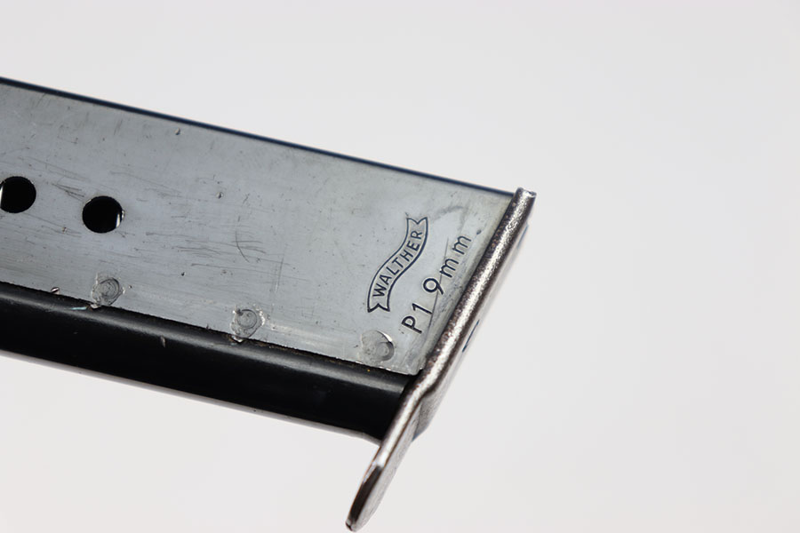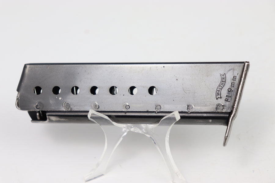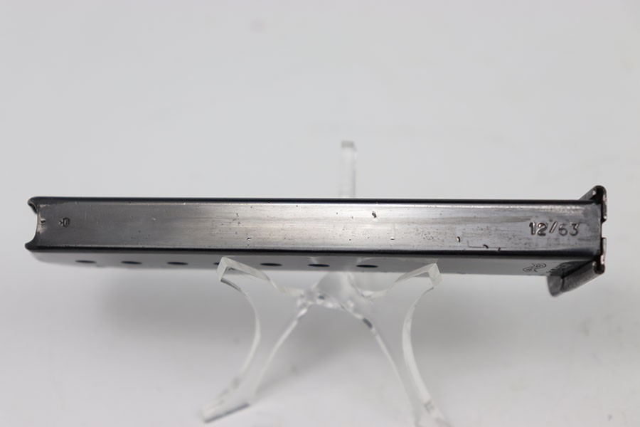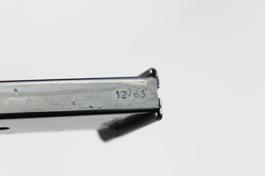 7/23/24 – This is an excellent 1963 Walther P1/P.38 Magazine. Spring has excellent retention with very smooth operation. The outer bluing show little to finish loss. Walther Banner is displayed on the bottom left side along with P1 9mm. Spine is dated 12/63.