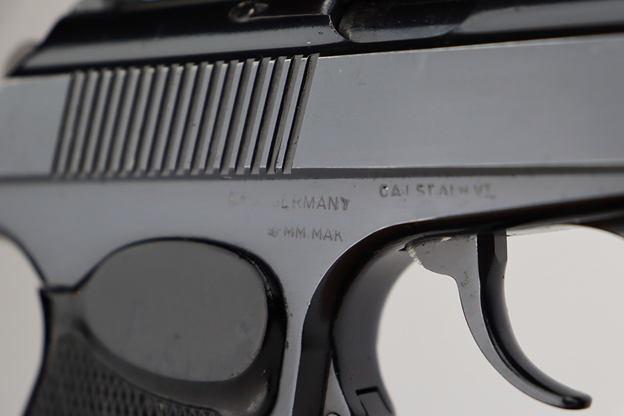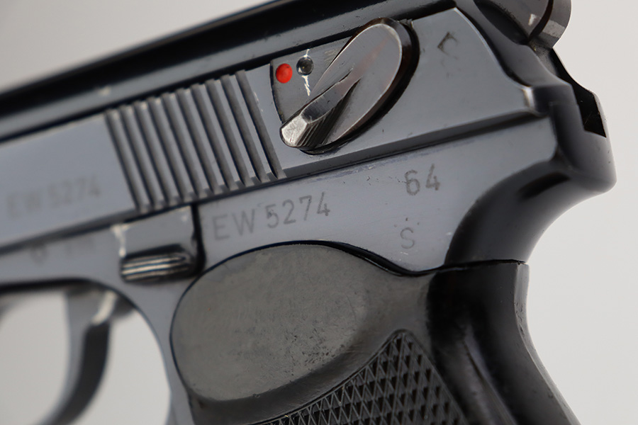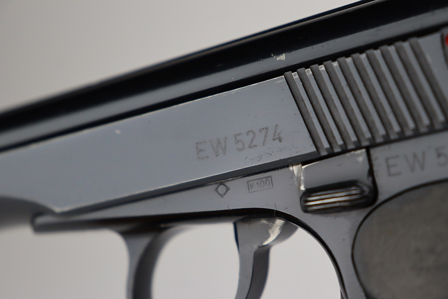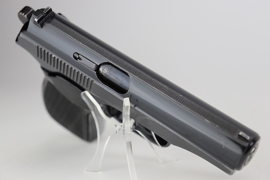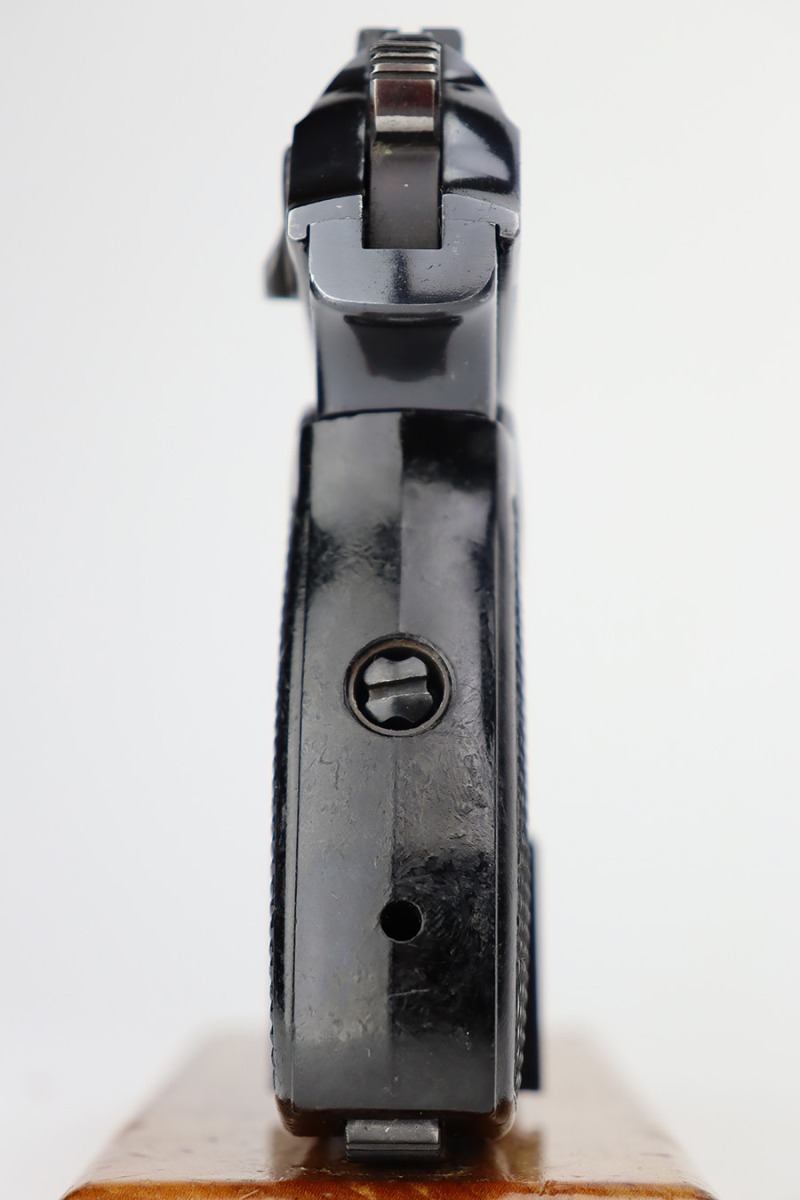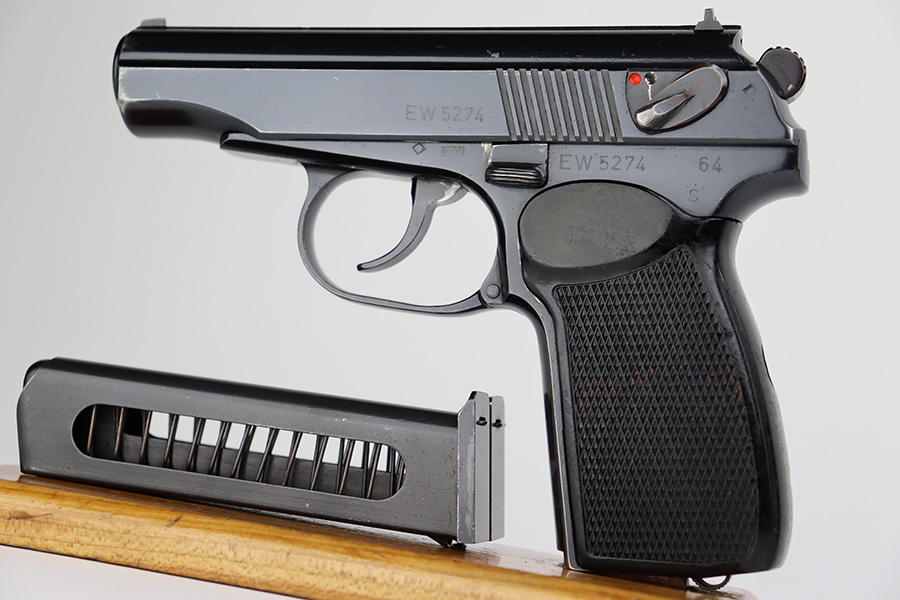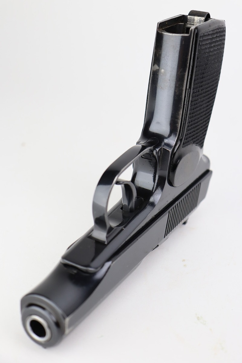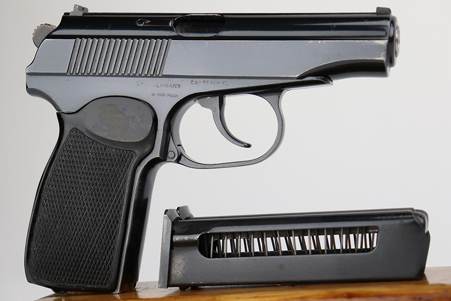 7/10/23 – This is a very nice example of a Makarov made in East Germany in 1964. It is all matching but has an import mark on the right side of the frame. It has retained about 94% of its high polish finish. Most of the finish loss comes in the form of light spotty wear on the front strap, but there is also minor muzzle wear and one tiny spot of discoloration on the left side of the slide. Fitted with an excellent black bakelite grip. Comes with two proper magazines. Mint bore.