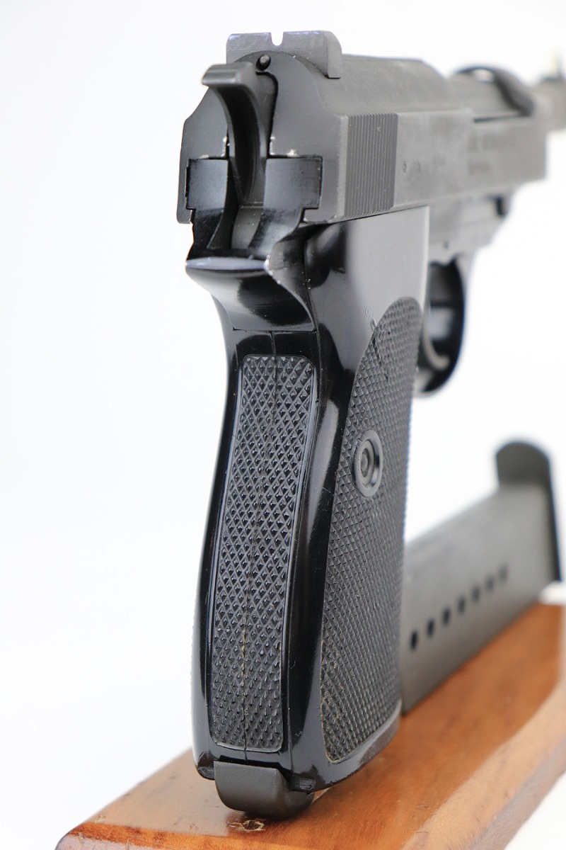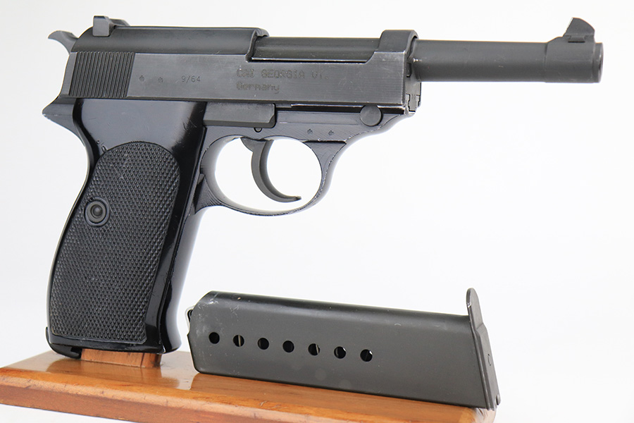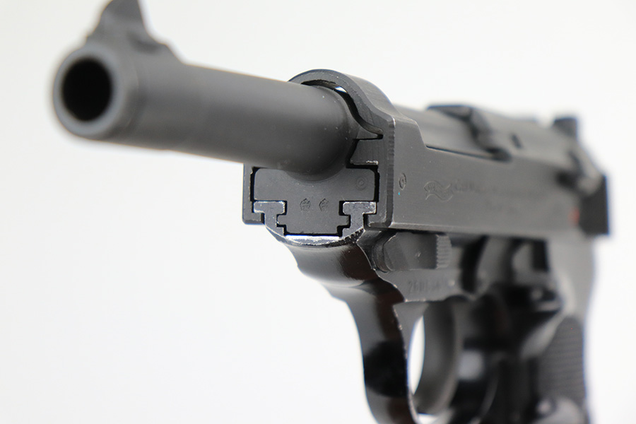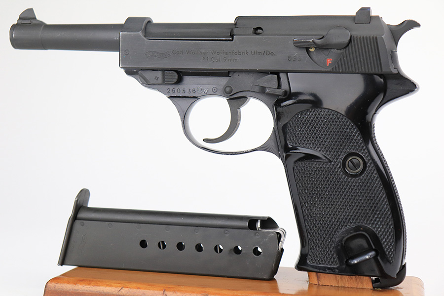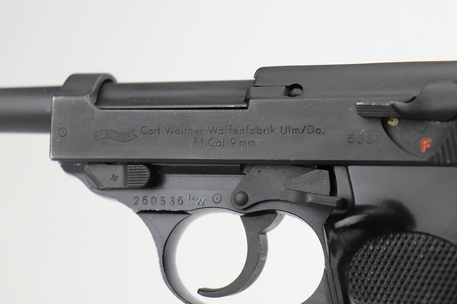 5/26/22 – This is a minty example of a Walther P1 manufactured in September of 1964. It is all matching and has the proper West German proofs throughout. Import mark on the right side of the slide. There is a “BW” marking on the left side of the frame for Bundeswehr or German military. There is a “536” number on the left side of the frame, which we assume to be a unit or rack number. It comes as a rig with a nice 1963-dated P.38 holster (gun fits well), a P.38 magazine (works well in the gun), and a proper P1 magazine. The gun itself has retained about 98% of its original finish with just a small spot of wear along the front edge of the frame and some very light scuffs here and there. Comes with a nice set of black plastic grips – a couple of scratches. The bore is near-mint. De-cocker is functional. The front sight blade is painted white.