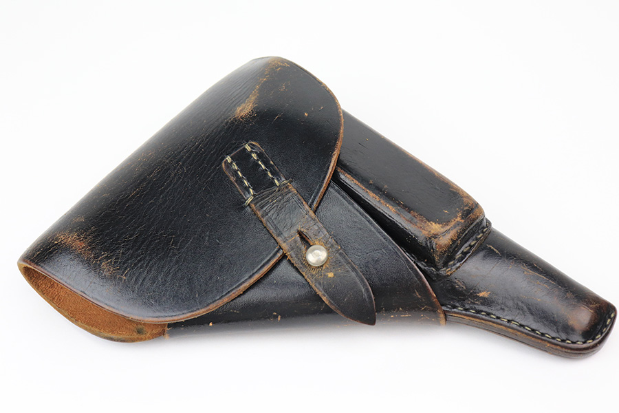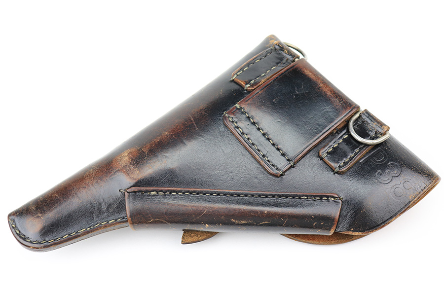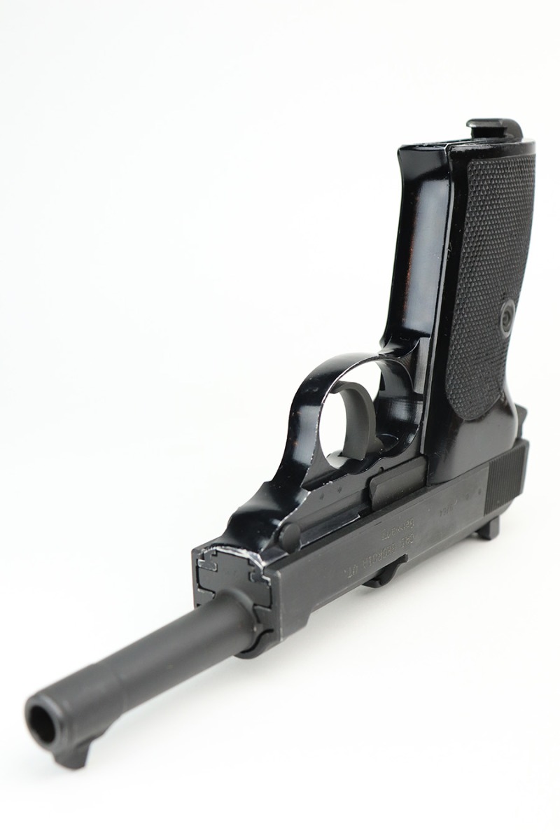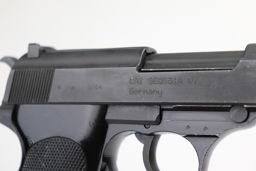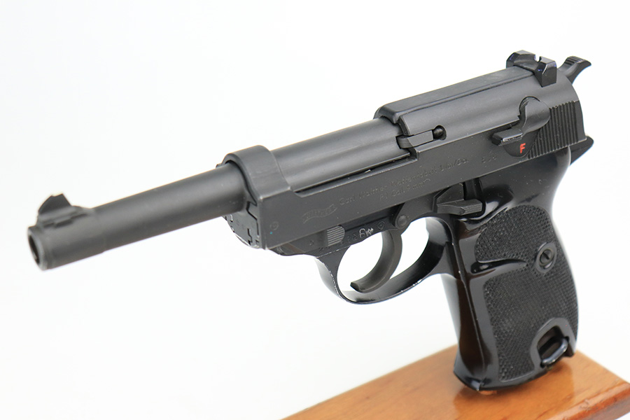 5/26/22 – This is a minty example of a Walther P1 manufactured in September of 1964. It is all matching and has the proper West German proofs throughout. Import mark on the right side of the slide. There is a “BW” marking on the left side of the frame for Bundeswehr or German military. There is a “536” number on the left side of the frame, which we assume to be a unit or rack number. It comes as a rig with a nice 1963-dated P.38 holster (gun fits well), a P.38 magazine (works well in the gun), and a proper P1 magazine. The gun itself has retained about 98% of its original finish with just a small spot of wear along the front edge of the frame and some very light scuffs here and there. Comes with a nice set of black plastic grips – a couple of scratches. The bore is near-mint. De-cocker is functional. The front sight blade is painted white.
