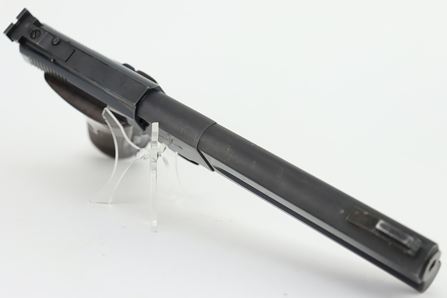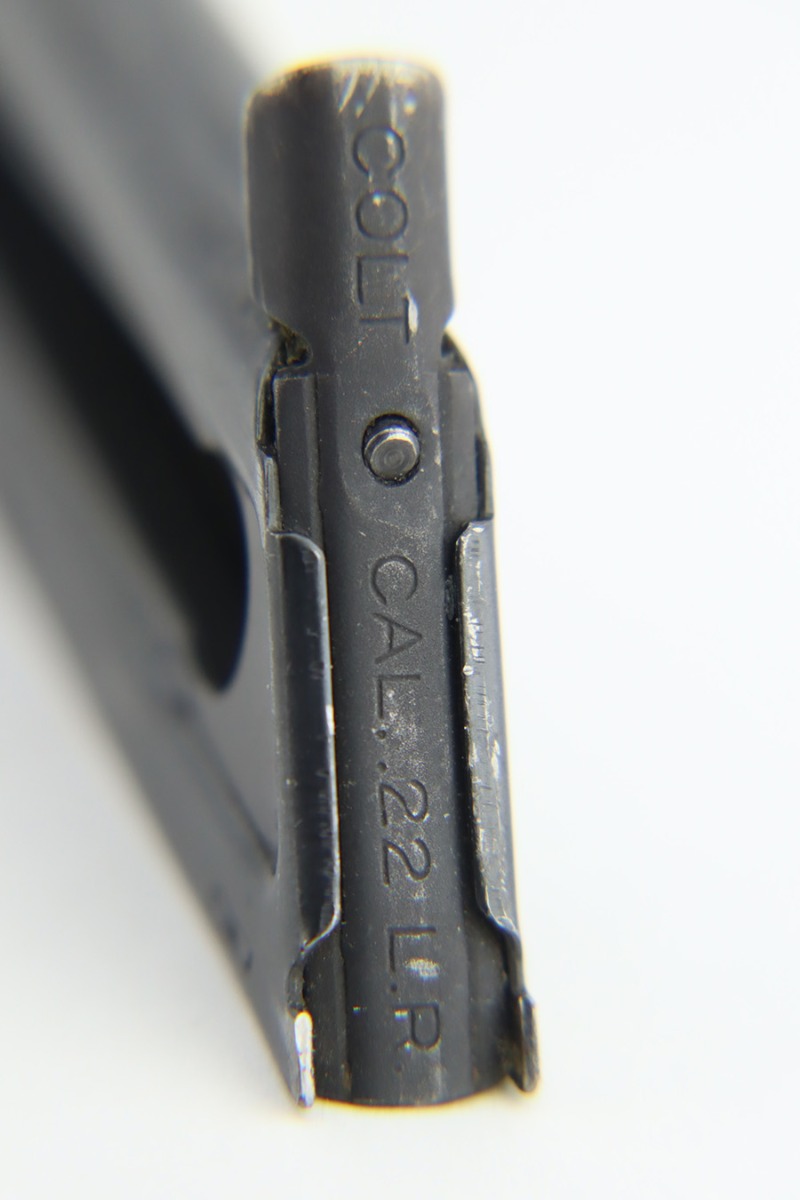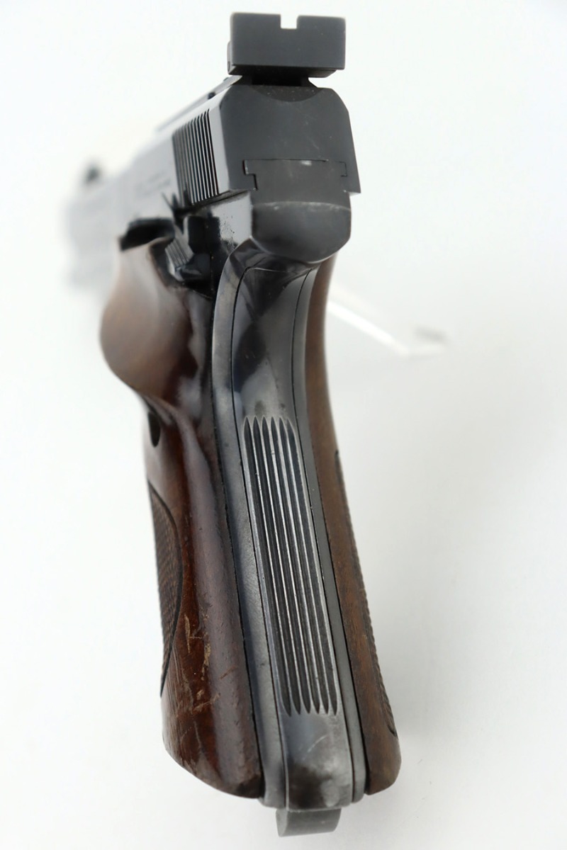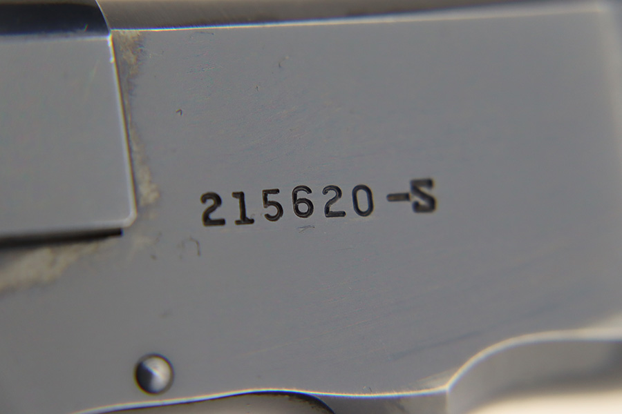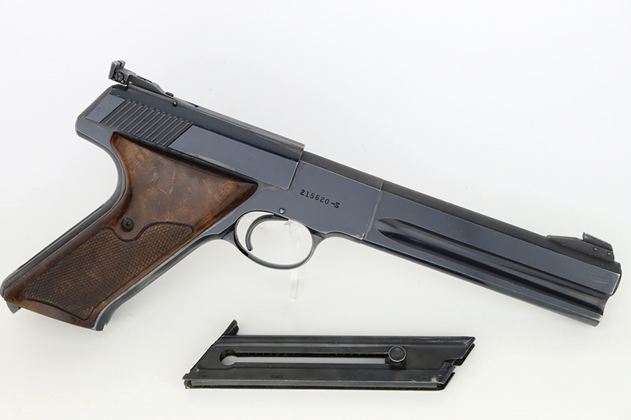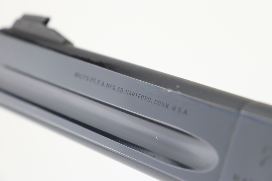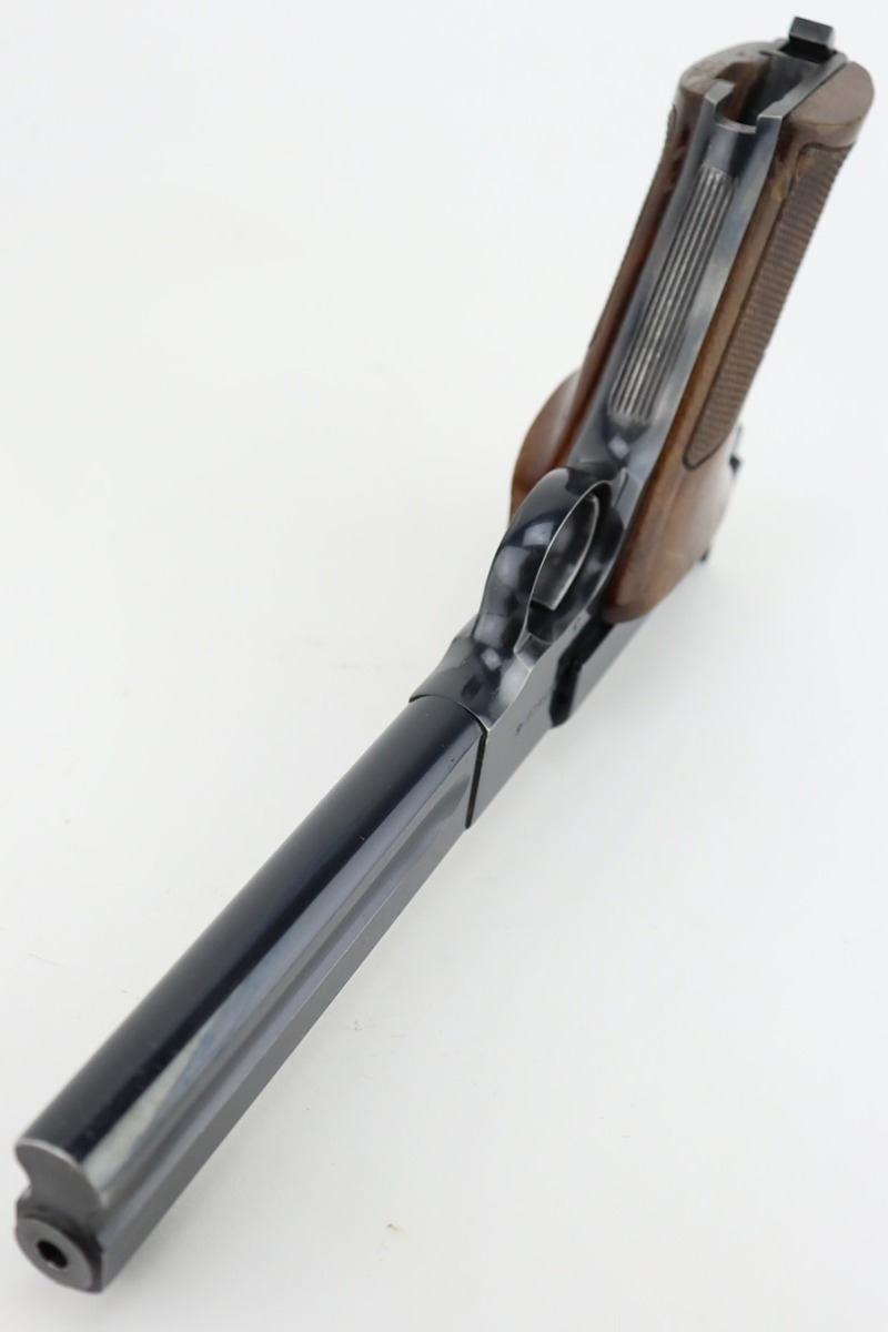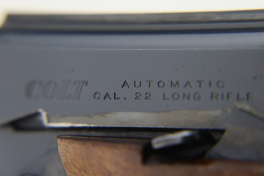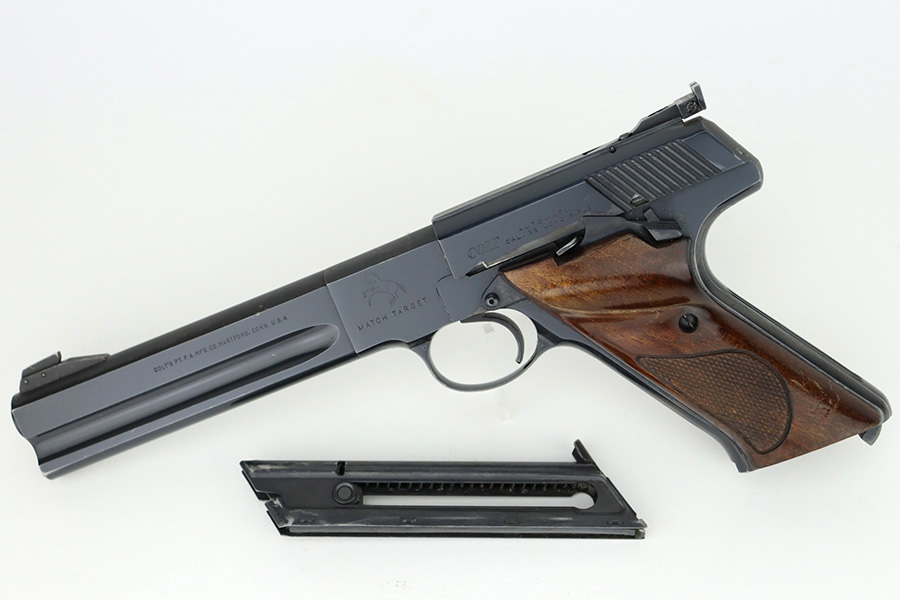 1/5/24 – This is a Colt Match Target from 1966, chambered in .22 LR. The original bluing rates about 92-93% with very minor thinning on the grip straps and one tiny ding on the left side of the barrel. Fitted with proper wood grips – some minor scuffing on both sides. Comes with one magazine. Mint bore.