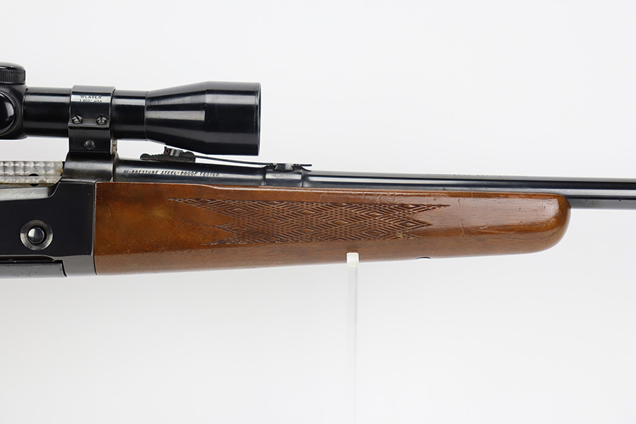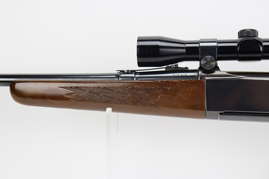 8/17/23 – This is a near-mint example of a Savage Model 99 Lever Action Rifle, manufactured in 1966 and chambered in .308 Winchester. It comes equipped with a very nice York 4x32mm rifle scope (excellent optics). The metal parts of the gun have retained virtually all of their original finish. There are just a few very light scratches on the receiver and some light freckling on the underside of the magazine. Excellent case-coloring on the lever. Very nice wood furniture, but there are some small handling marks and scratches here and there. Mint bore. Comes with a spare magazine.