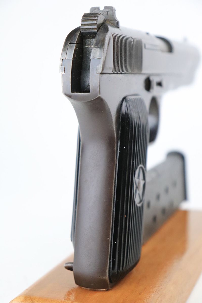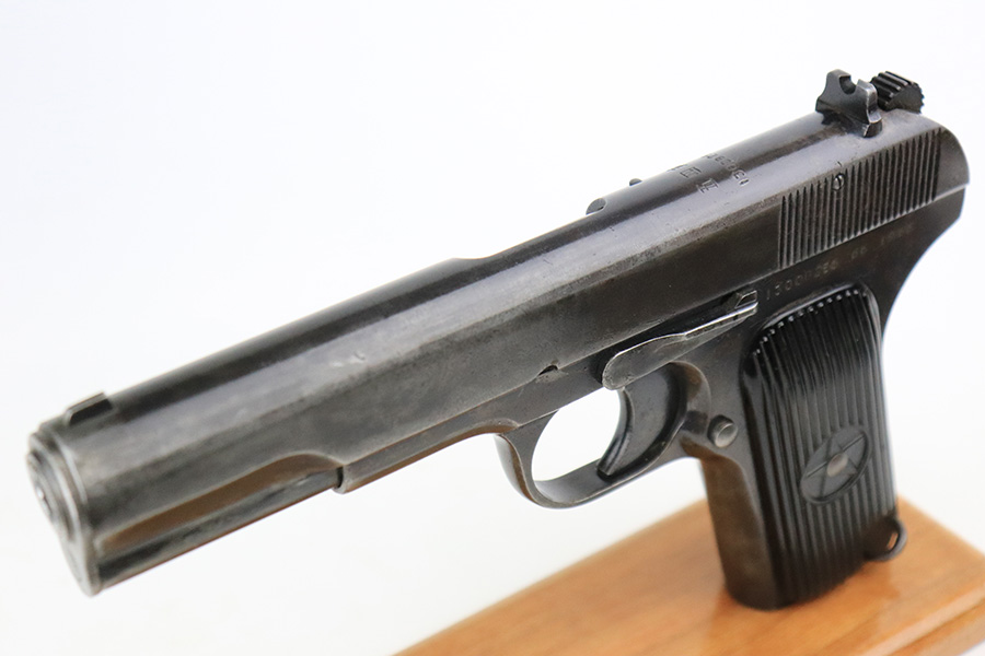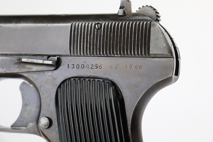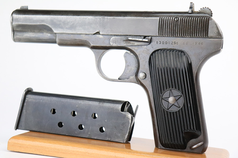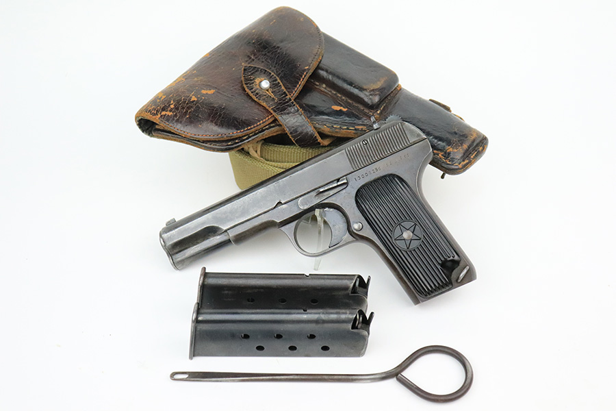 6/10/22 – This is a nice example of a Vietnam War-Era Chinese Tokarev Type 54 manufactured in Communist China in 1966. It is all matching and comes as a rig with a period-correct leather holster, two mismatched magazines, a cleaning rod, and a Communist Chinese canvas belt and brass belt buckle (with Chinese Star). The gun has retained roughly 60% of its original finish. In general, there is wear around the high edges and around the muzzle. Noticeable finish loss and pin-pricking along the slide. Splotchy discoloration on both sides of the frame. Noticeable brown patina on the grip straps. Comes with excellent period-correct bakelite grips. Mint bore.