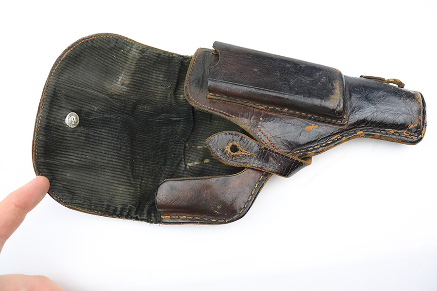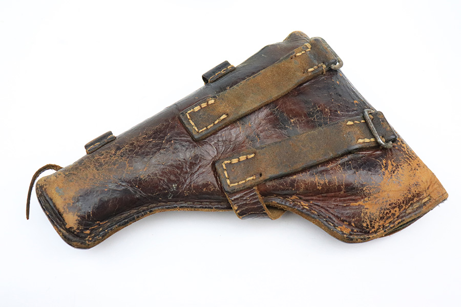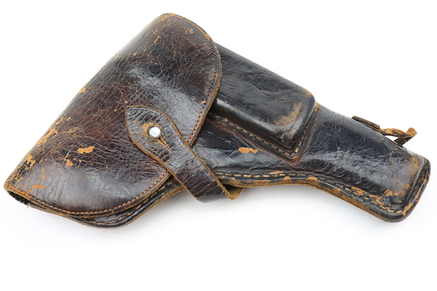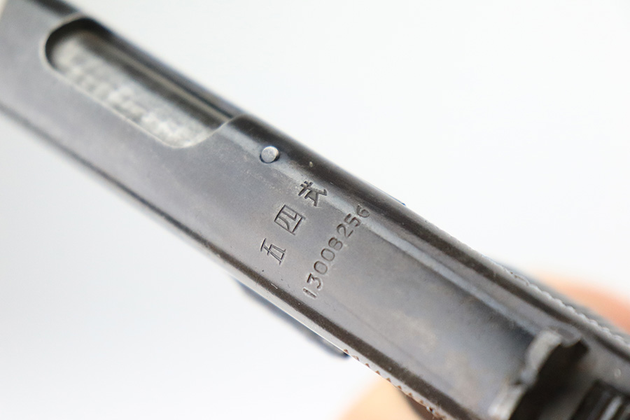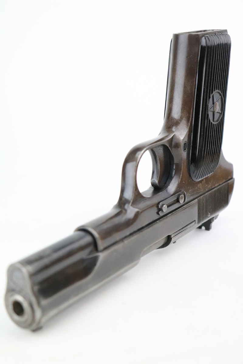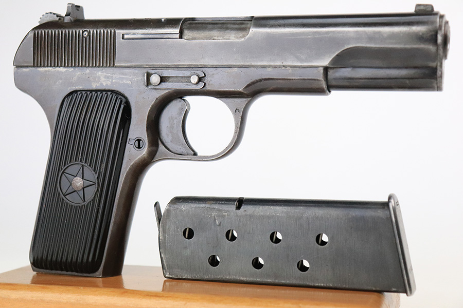 6/10/22 – This is a nice example of a Vietnam War-Era Chinese Tokarev Type 54 manufactured in Communist China in 1966. It is all matching and comes as a rig with a period-correct leather holster, two mismatched magazines, a cleaning rod, and a Communist Chinese canvas belt and brass belt buckle (with Chinese Star). The gun has retained roughly 60% of its original finish. In general, there is wear around the high edges and around the muzzle. Noticeable finish loss and pin-pricking along the slide. Splotchy discoloration on both sides of the frame. Noticeable brown patina on the grip straps. Comes with excellent period-correct bakelite grips. Mint bore.