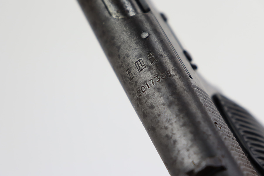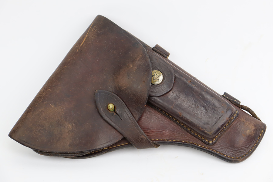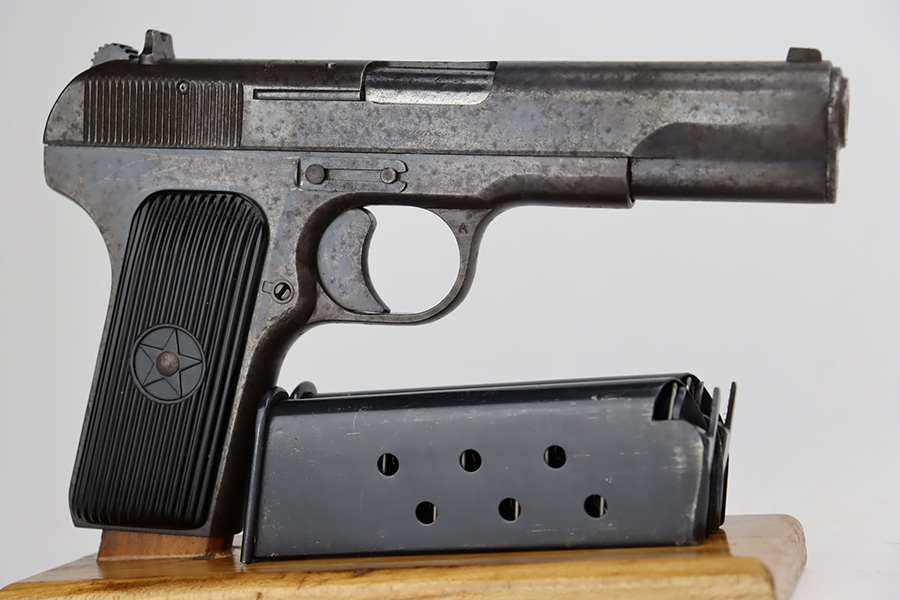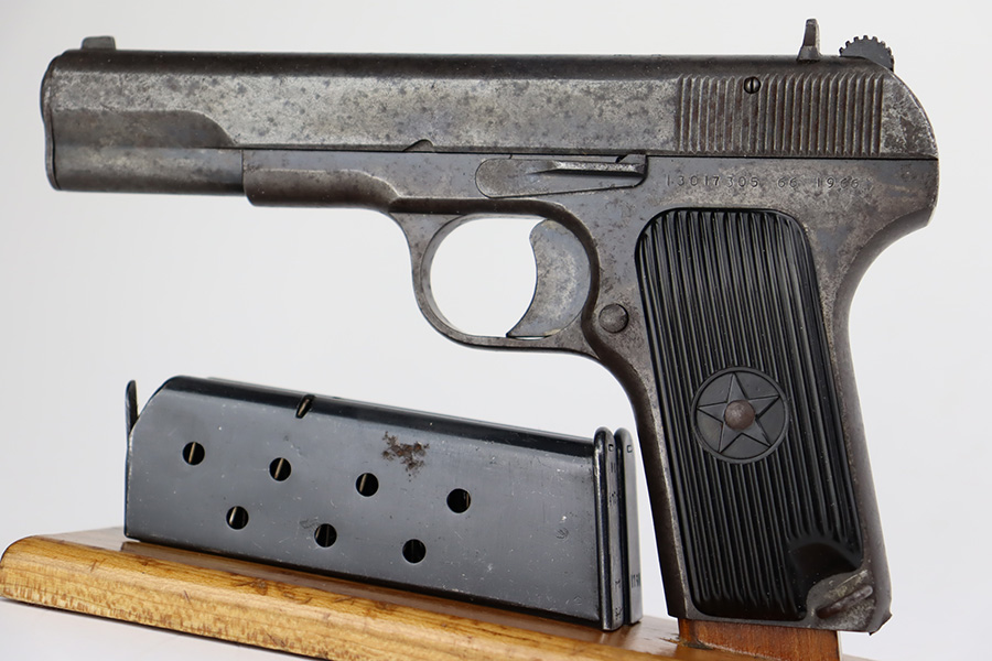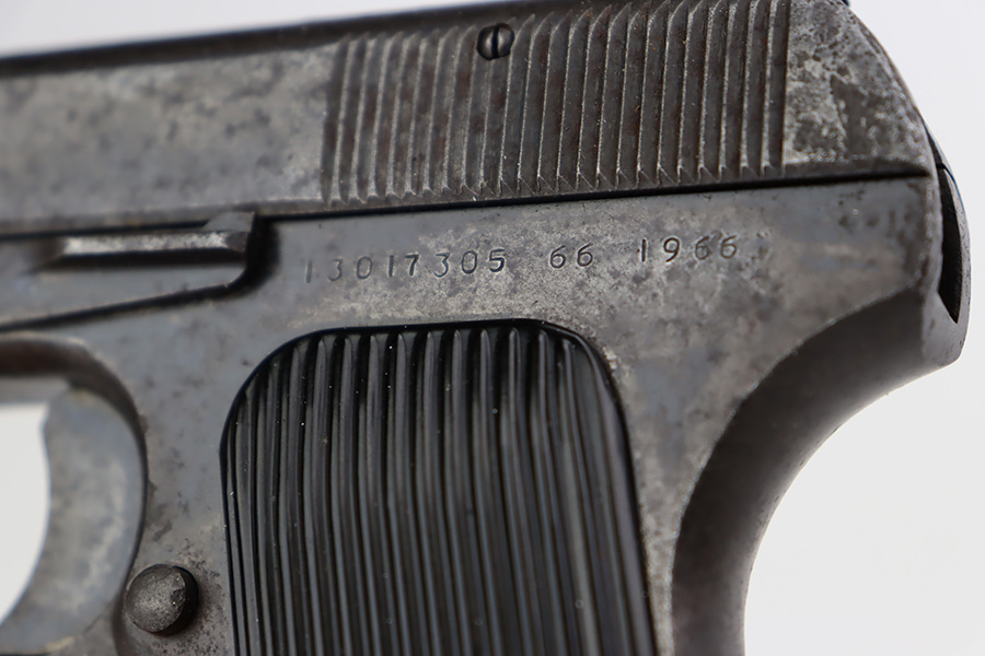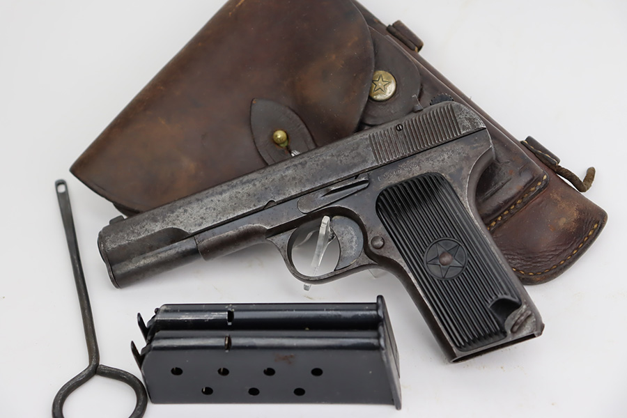 9/19/23 – This is a Vietnam War-Era Chinese Tokarev Type 54 manufactured in Communist China in 1966. It is all matching and comes as a rig with a leather holster, two mismatched magazines, and a cleaning rod. The gun itself has retained roughly half of its finish with obvious spotty oxidation and pin-pricking throughout. Fitted with period-correct black bakelite grips. The bore is shiny with strong rifling, but there are small dots of surface oxidation here and there. No import stamps.