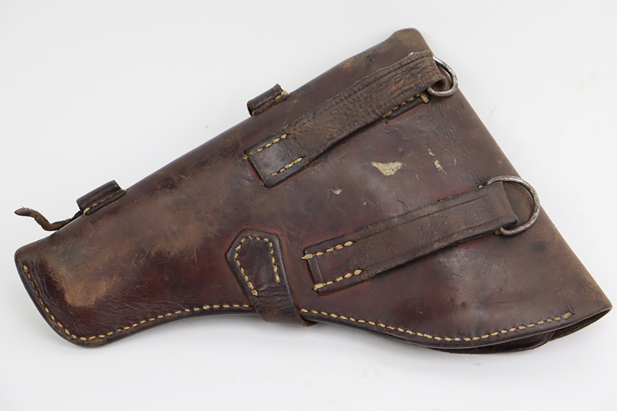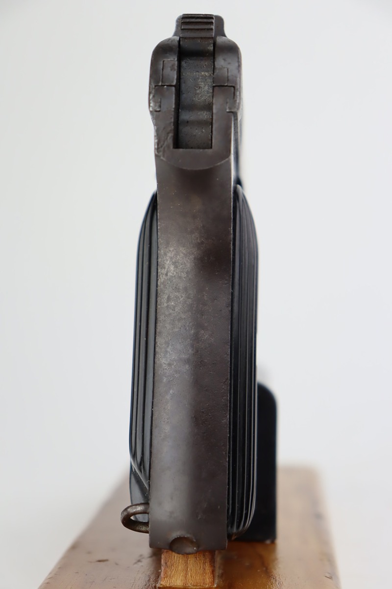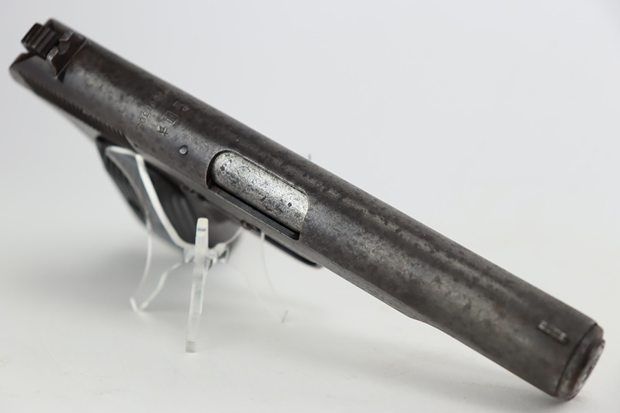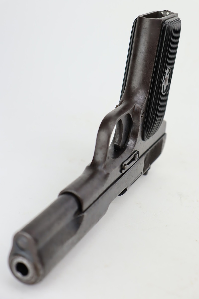 9/19/23 – This is a Vietnam War-Era Chinese Tokarev Type 54 manufactured in Communist China in 1966. It is all matching and comes as a rig with a leather holster, two mismatched magazines, and a cleaning rod. The gun itself has retained roughly half of its finish with obvious spotty oxidation and pin-pricking throughout. Fitted with period-correct black bakelite grips. The bore is shiny with strong rifling, but there are small dots of surface oxidation here and there. No import stamps.