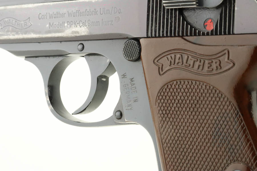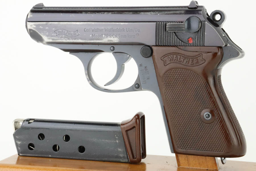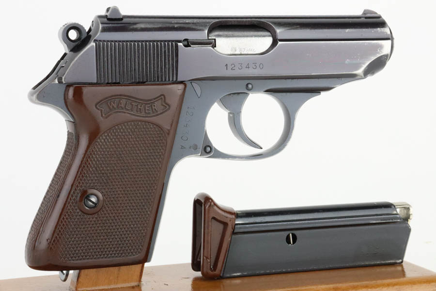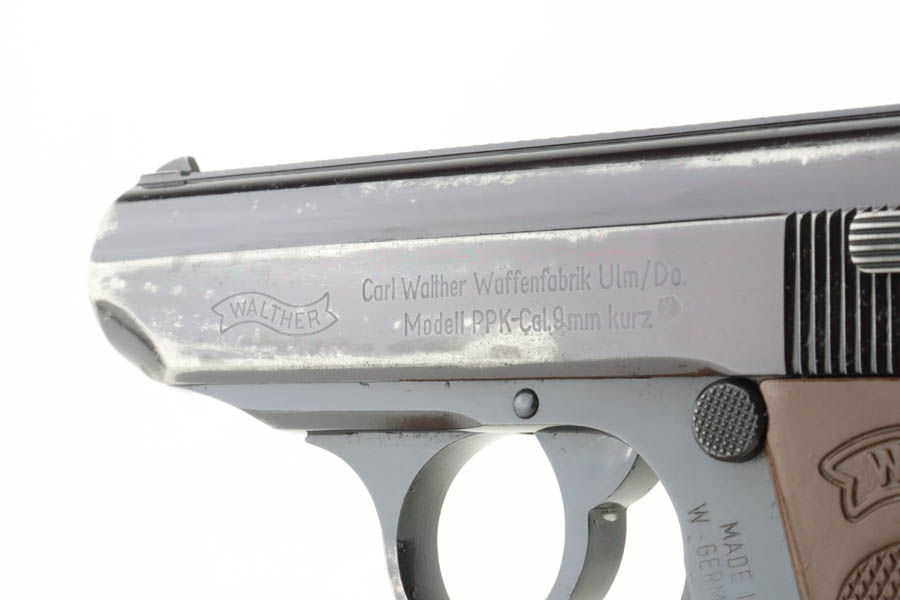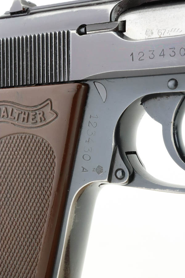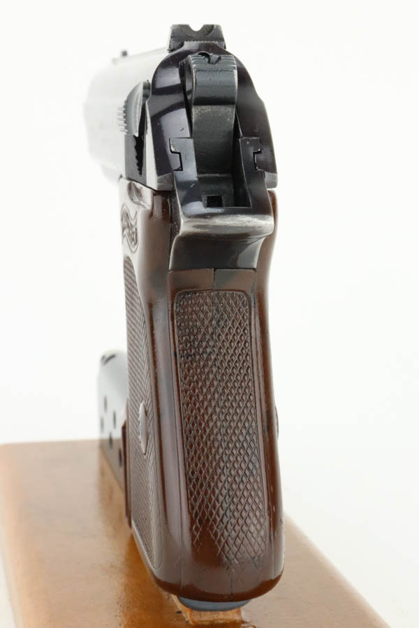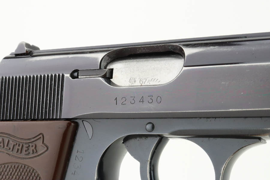 7/1/24 – This is a nice example of a Walther PPK manufactured in 1967 and chambered in 9mm kurz. All matching with no import marks. “Made in W. Germany” export marking on the left side of the frame. It has retained somewhere between 85-90% of its original finish. There is wear around the muzzle, along the slide, and on the front strap – mostly concentrated around the high edges. Fitted with brown plastic grips. Comes with a finger extension magazine. Minty bore.