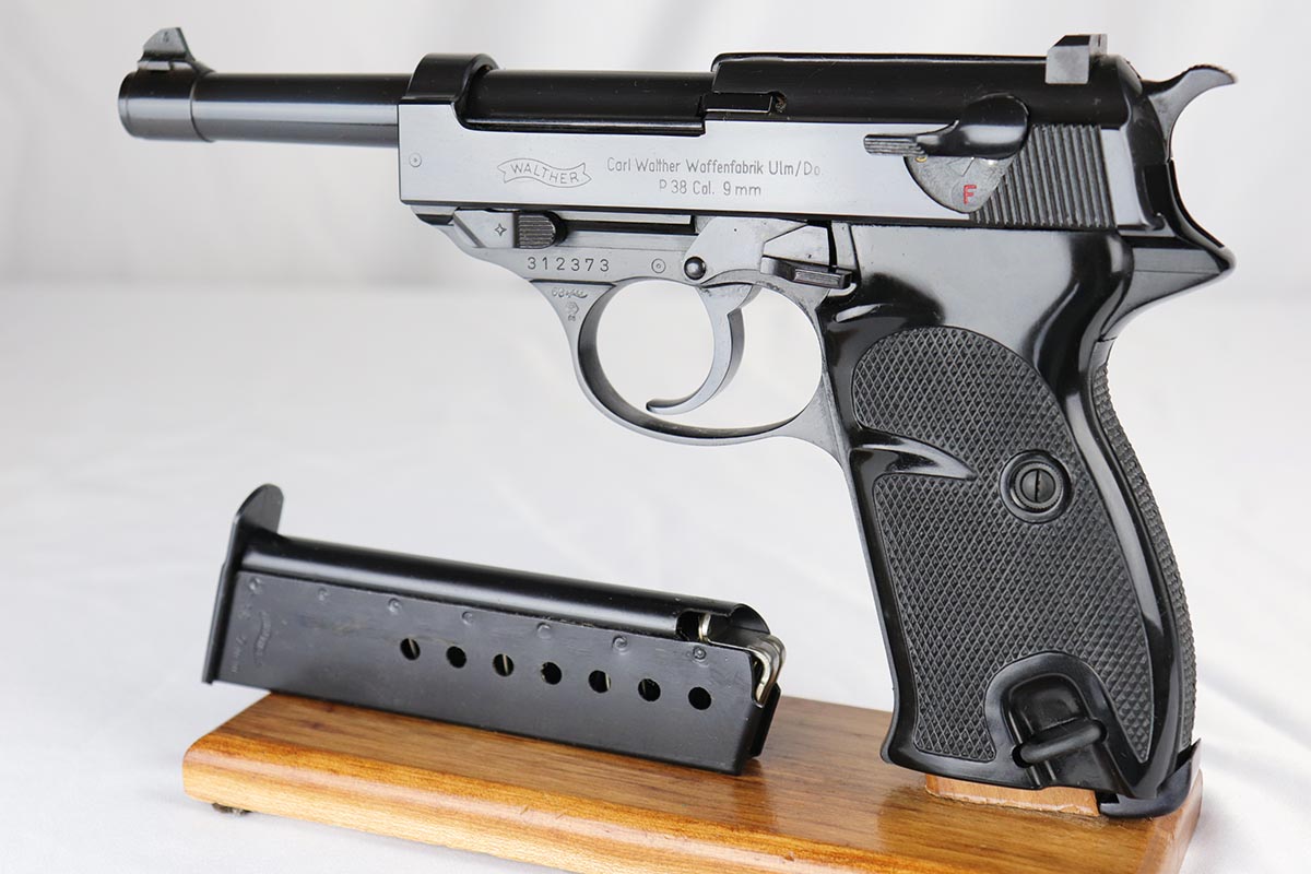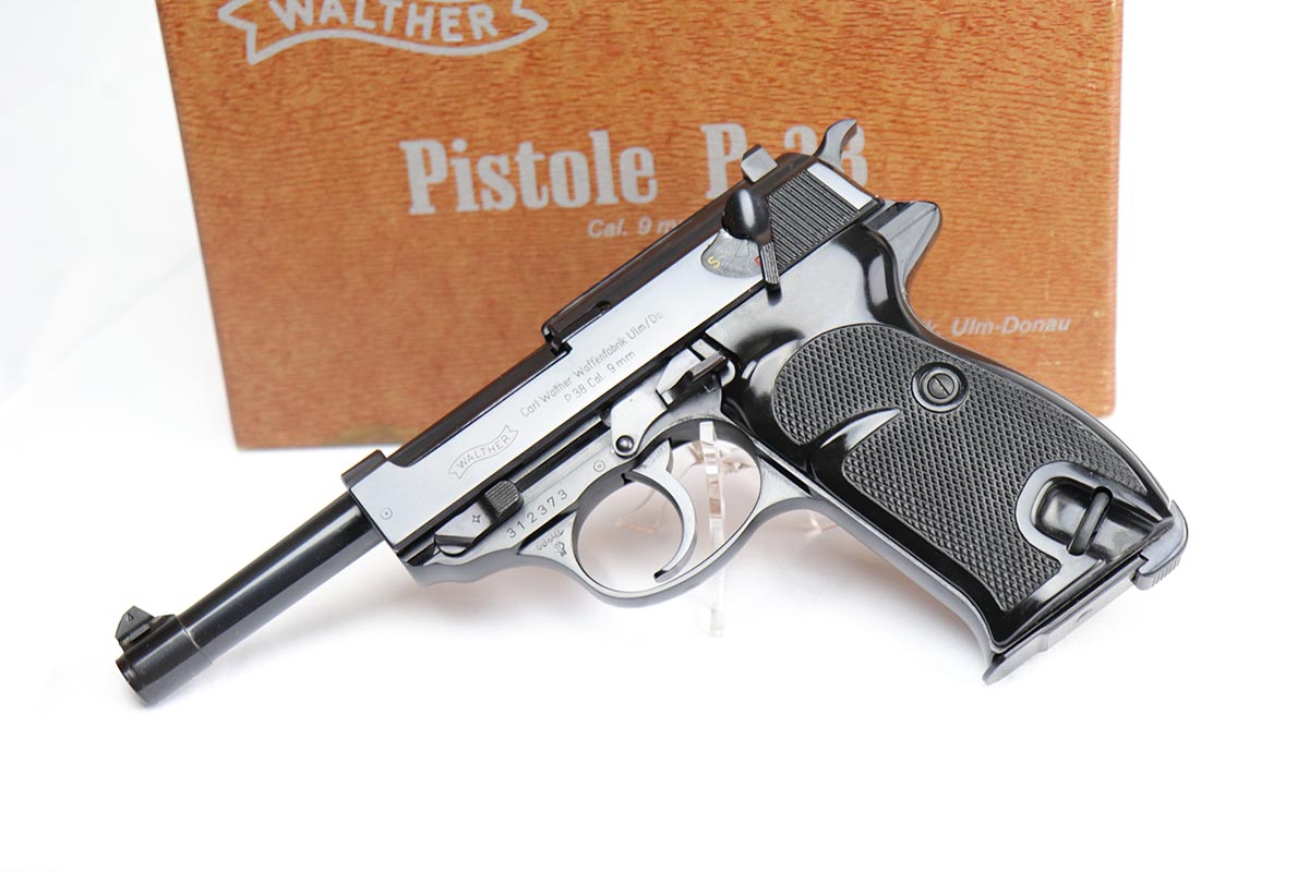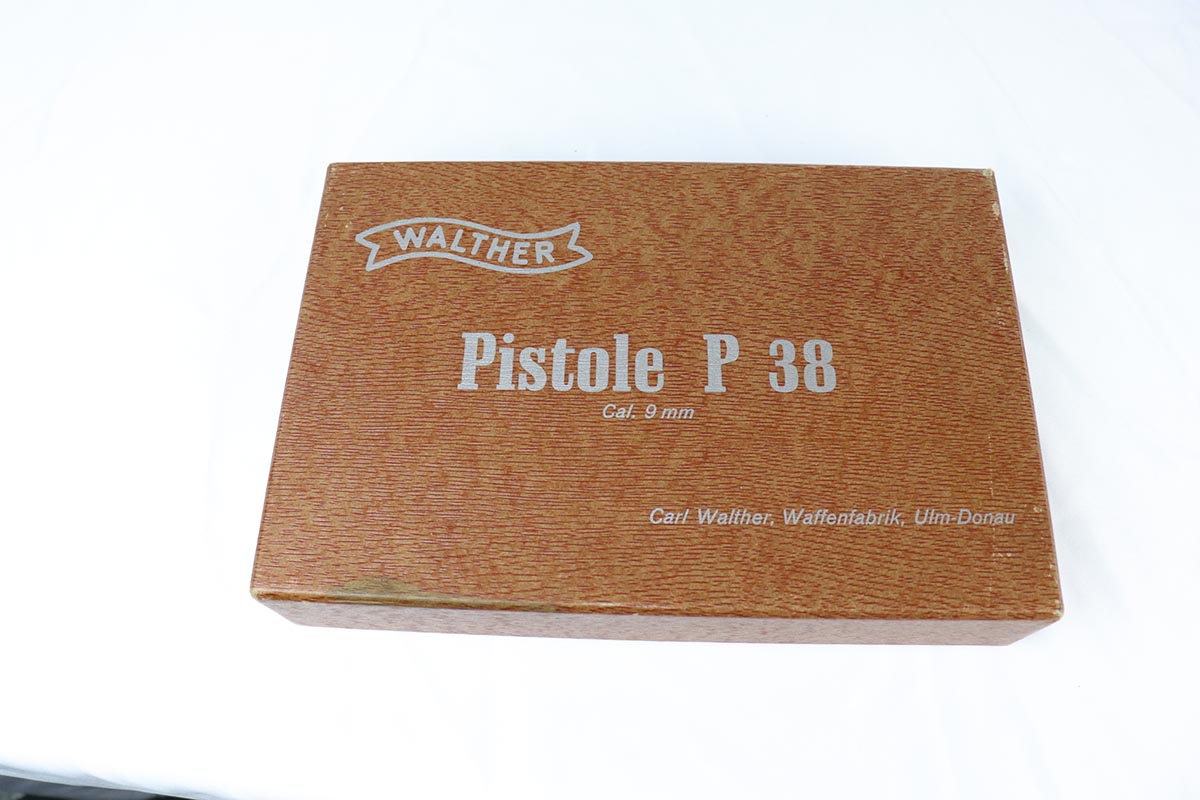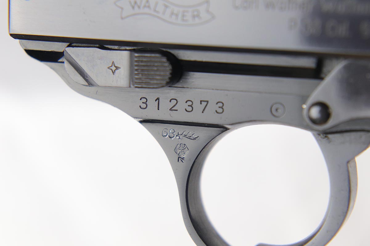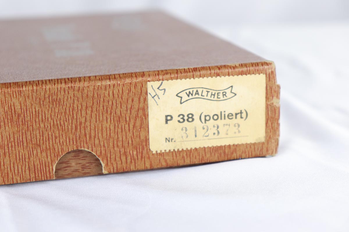 4/27/18 – This is a mint example of a post-war Walther P.38, made in 1968, that is complete with an original matching box, test target, extra magazine, and paperwork. The gun was made in 1968 and is West-German proofed. This is a very uncommon high polished (POLIERT) variation. The bluing shows no wear. Perfect bore and grips. This gun is C&R eligible.