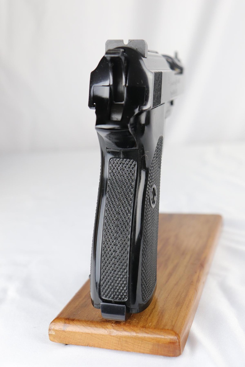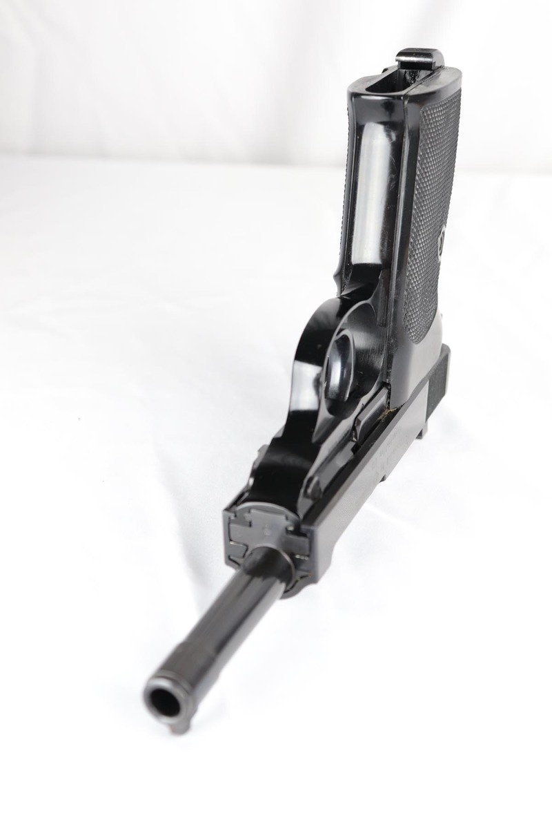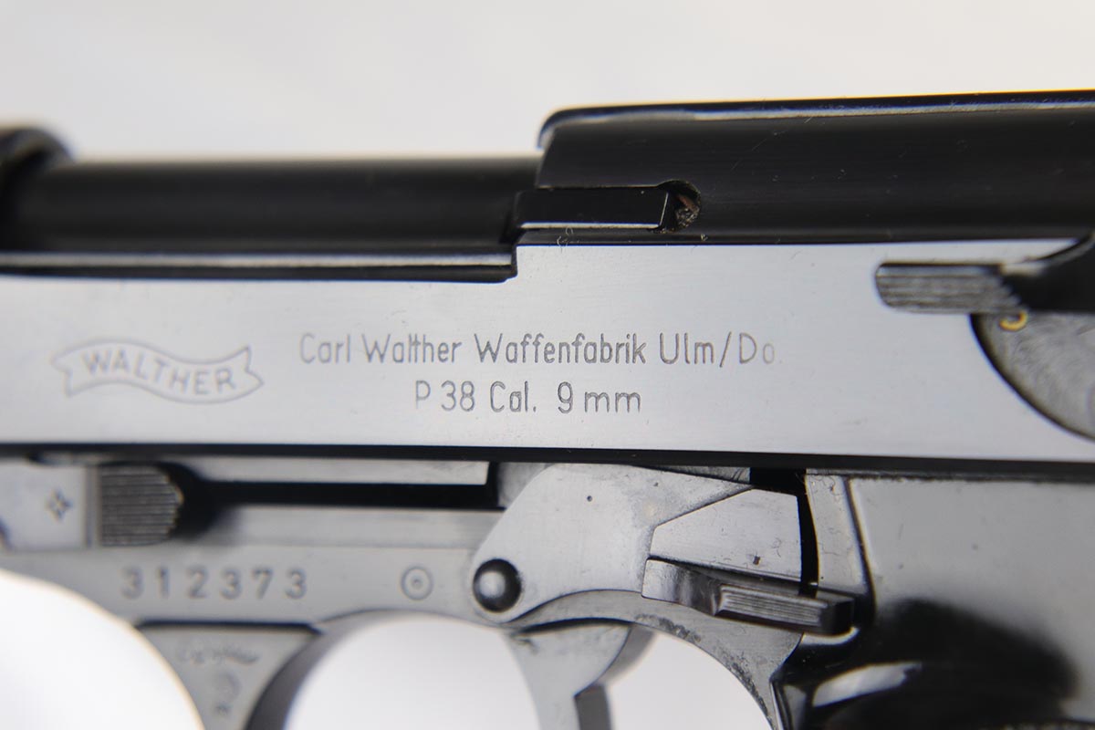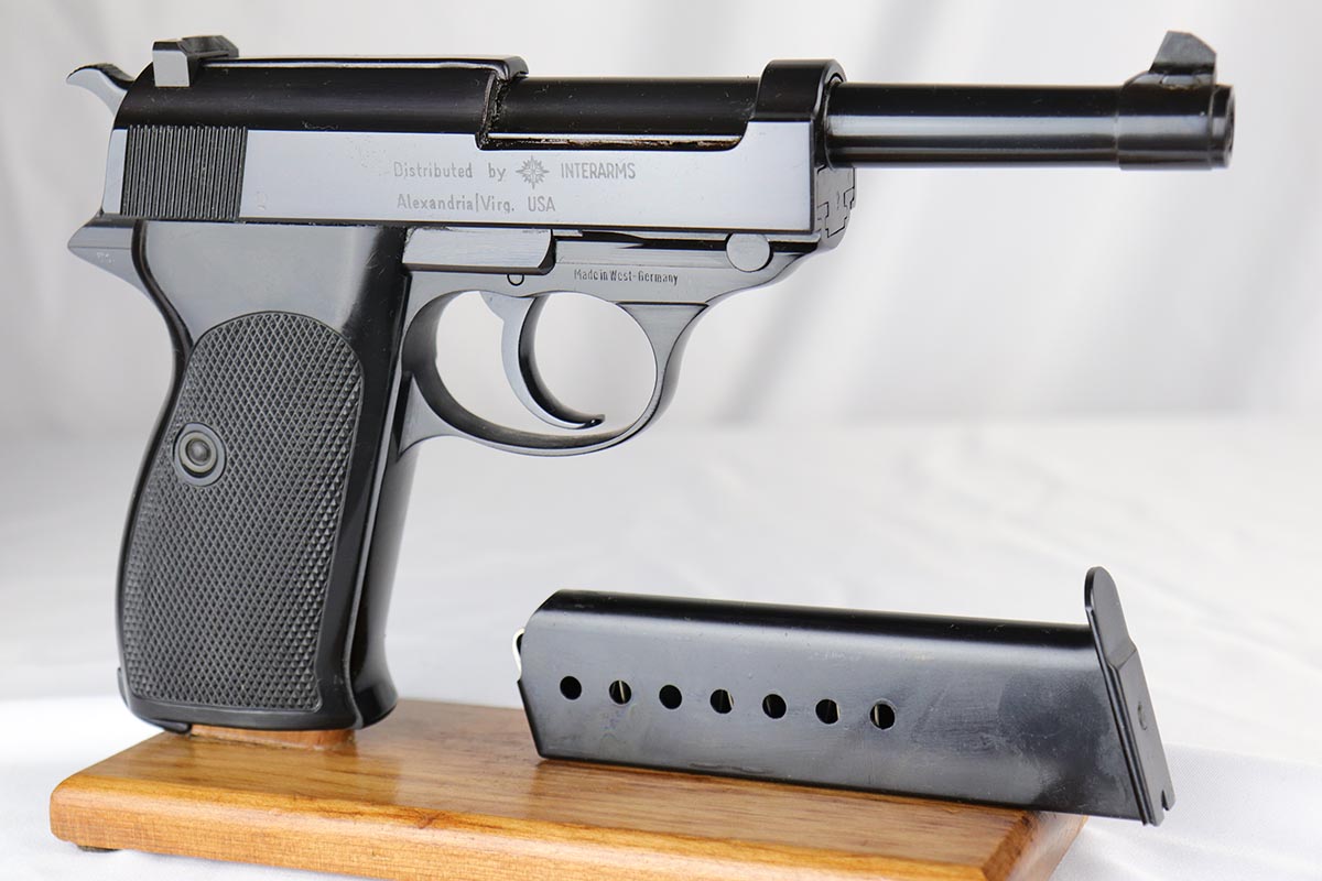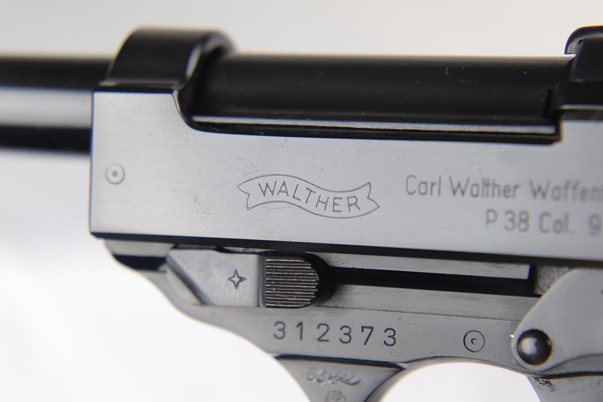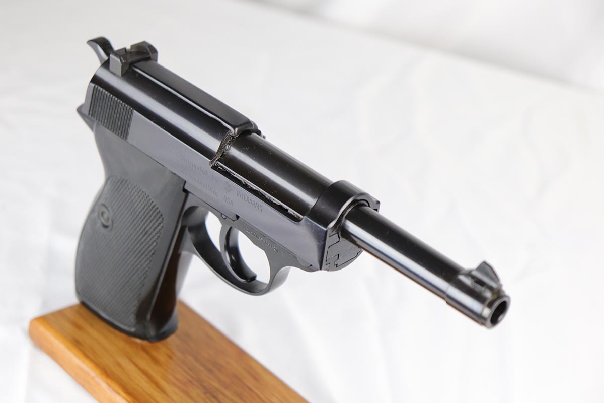4/27/18 – This is a mint example of a post-war Walther P.38, made in 1968, that is complete with an original matching box, test target, extra magazine, and paperwork. The gun was made in 1968 and is West-German proofed. This is a very uncommon high polished (POLIERT) variation. The bluing shows no wear. Perfect bore and grips. This gun is C&R eligible.