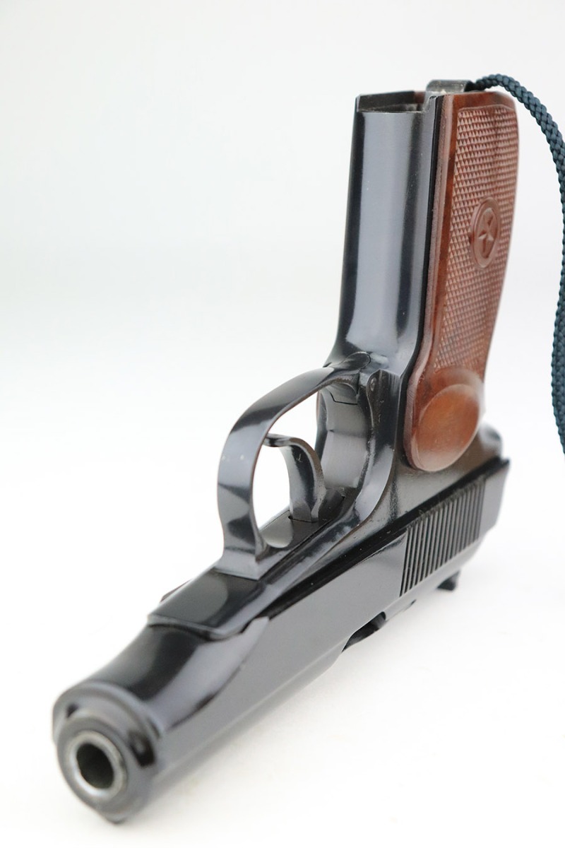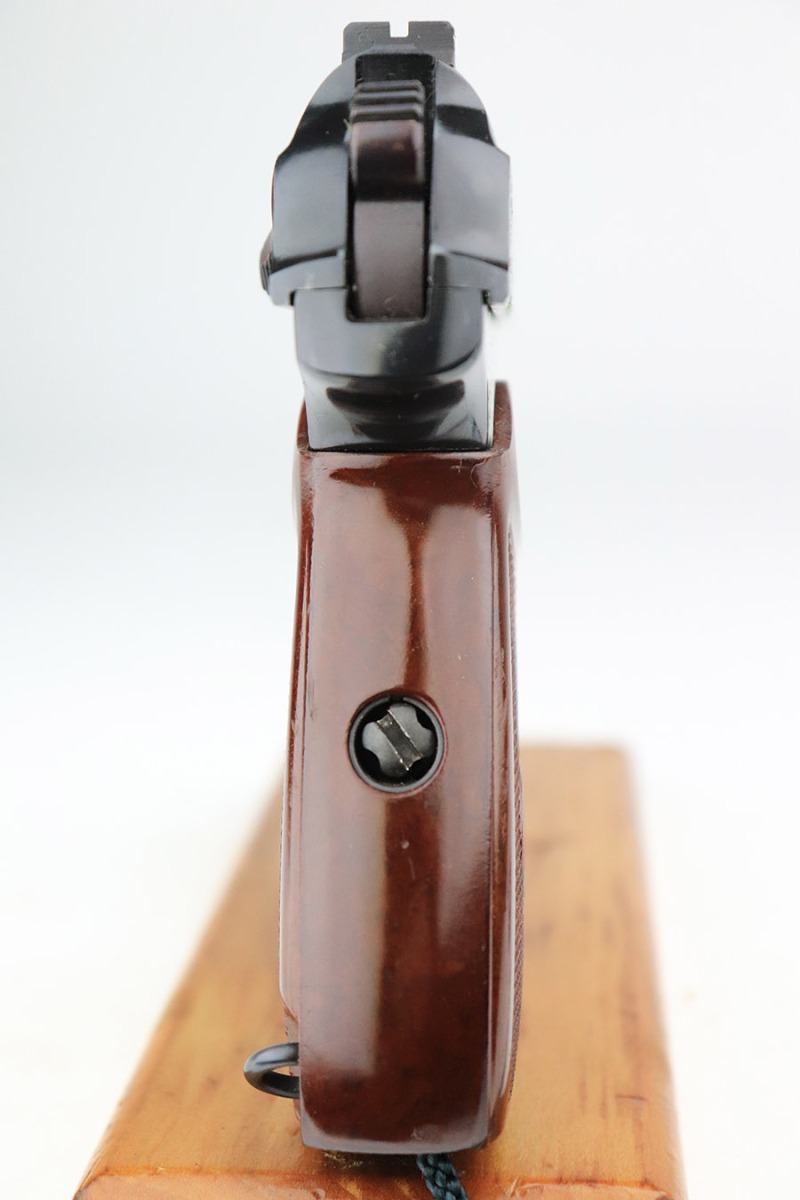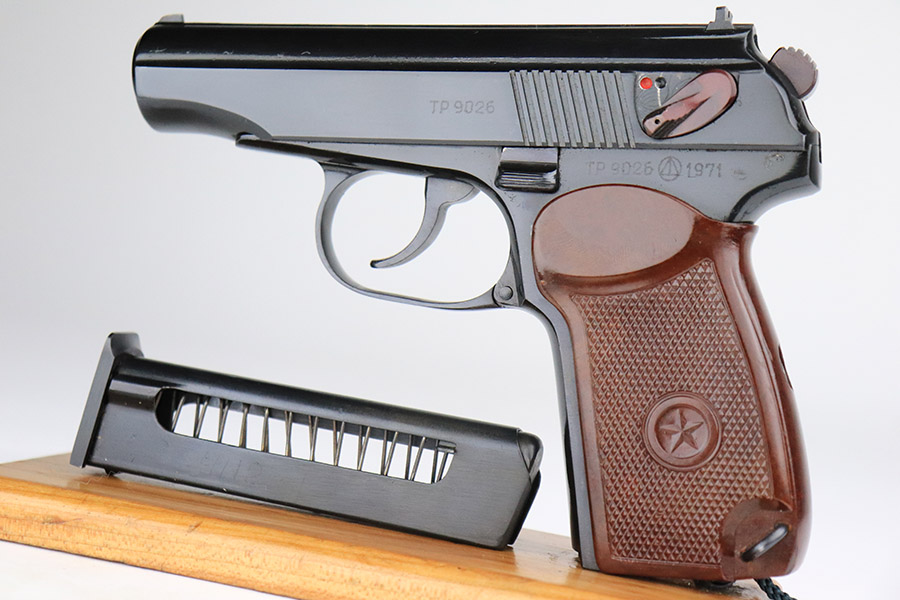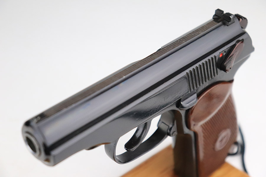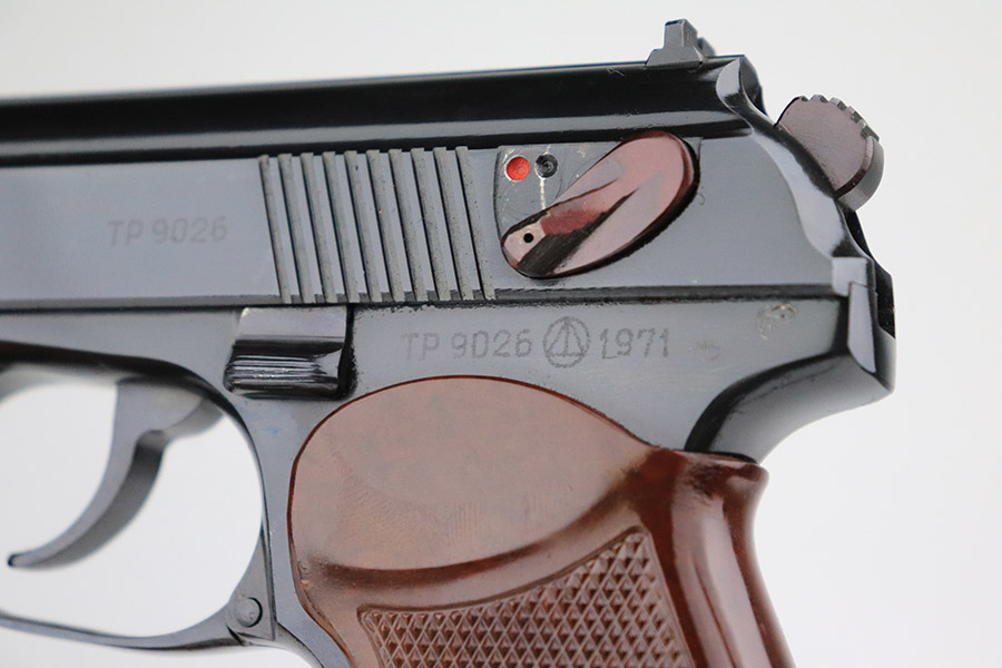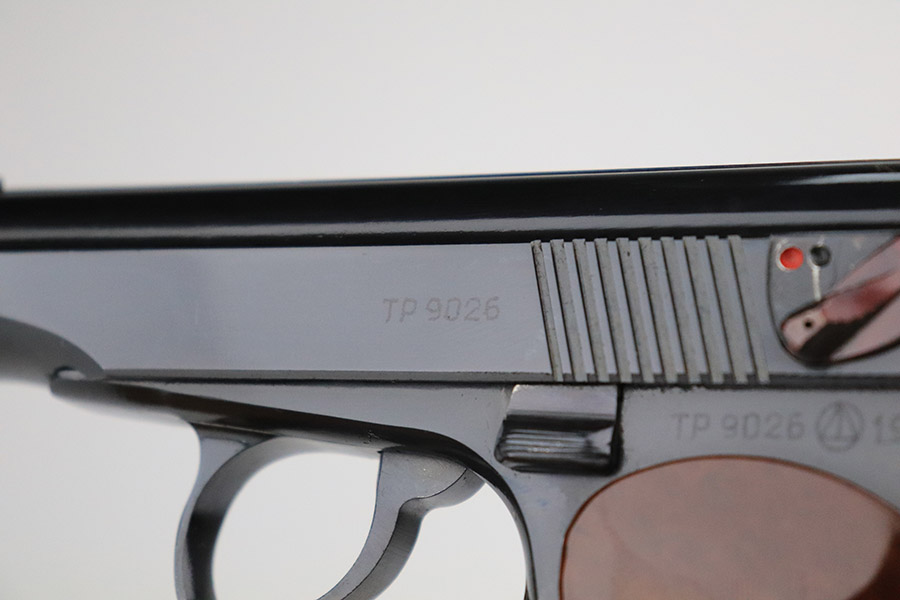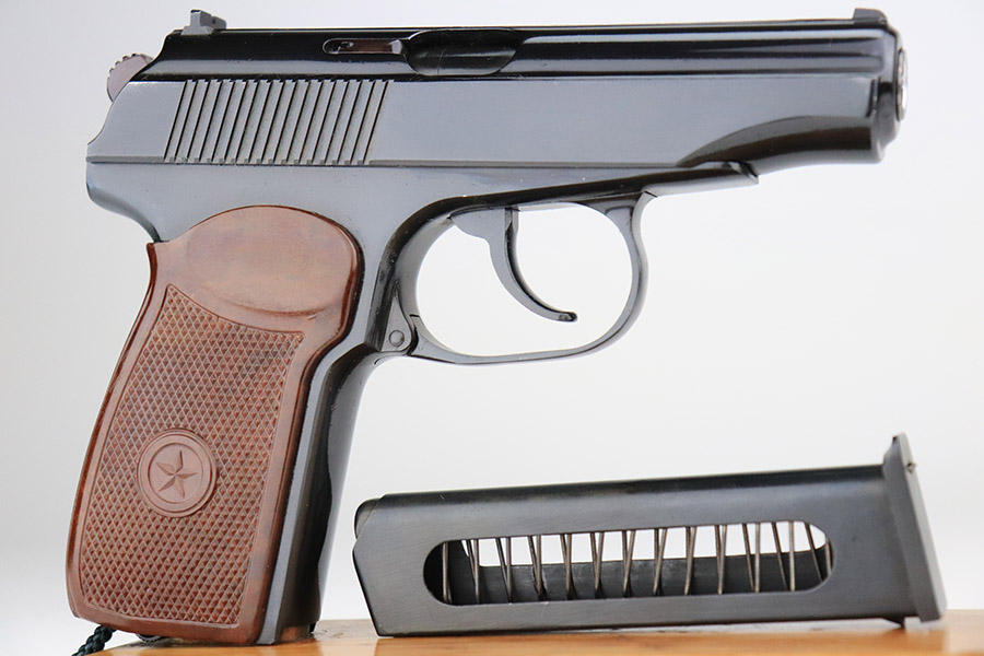 11/8/22 – This is a nearly unfired 1971 Russian military Makarov pistol in mint condition. It is NOT import marked. Makarov pistols had been produced in Russia in their original configuration since late 1950s with 1983 being the last year of production for the first variation guns. Very similar to Walther PP mechanically, it was chambered for a very potent Makarov 9x18mm caliber, which was closer to 9mm Para. The gun was very robust in construction in order to allow for a simple blowback design to handle such a potent load. At the same time, the gun was fairly light with excellent ergonomics. Used for many years by Russian military and police, many of these guns were imported into US in the 80s and all were import marked. Very few specimens are found that are not import marked and were probably brought into the country through diplomatic channels. Excellent bore and grips. This one is all matching and comes with a lanyard. Mint reddish plastic grips. The bore is like-new.