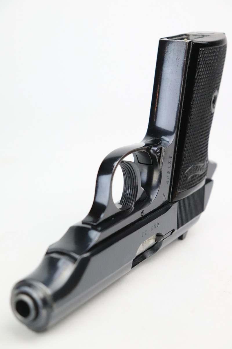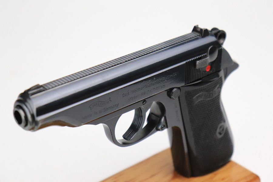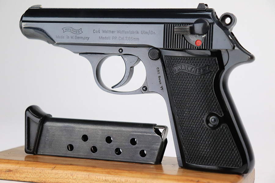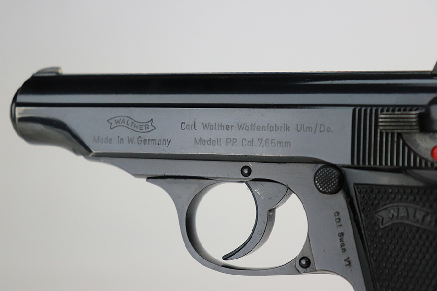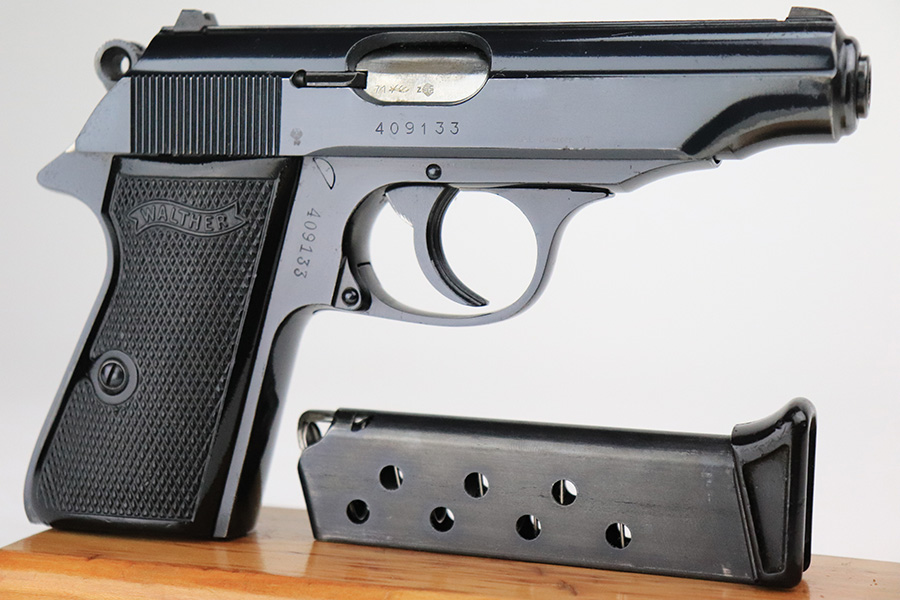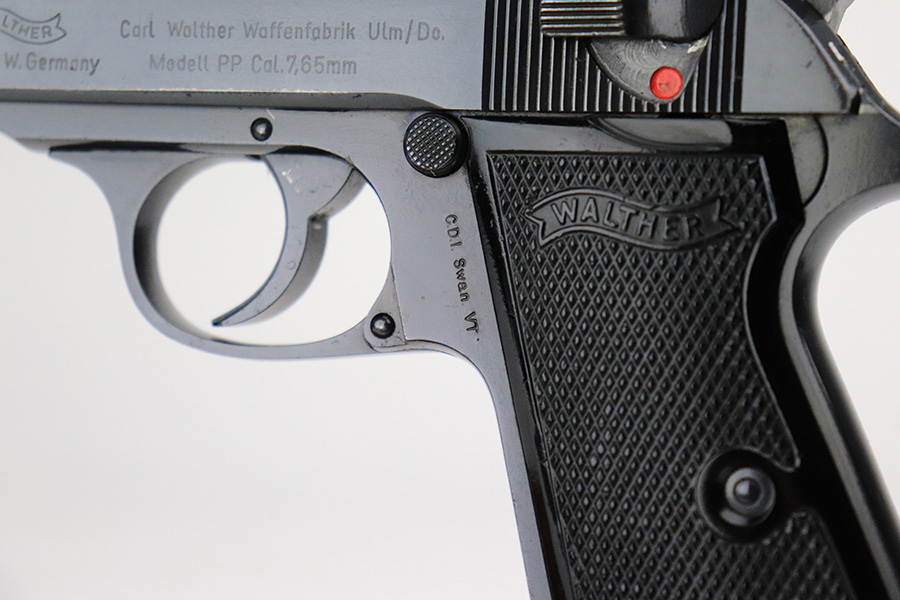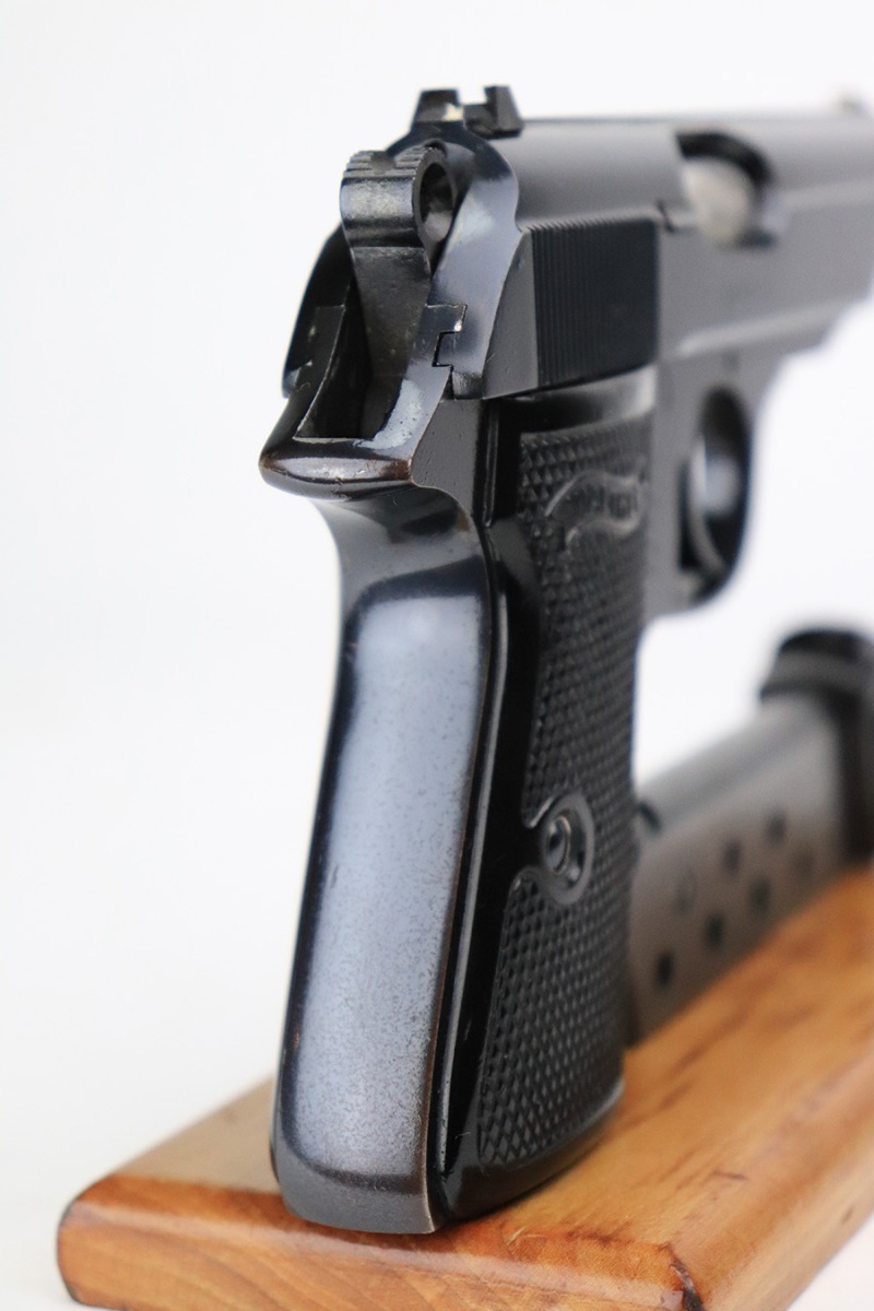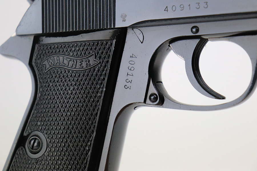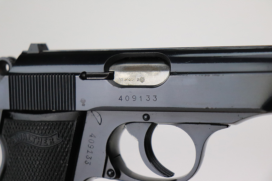 7/17/22 – This is an excellent example of a Walther PP sold in the commercial market in 1971. It is all matching and has the proper West German proofs. Two tiny import marks on the left side of the frame and right side of the slide. It has retained about 98% of its original finish. There is just very minor muzzle wear, pin-pricking on the back strap, and a few light handling marks on the front strap. Comes with very nice black plastic grips and a finger extension magazine. Minty bore.