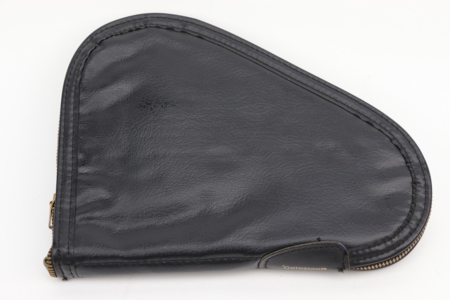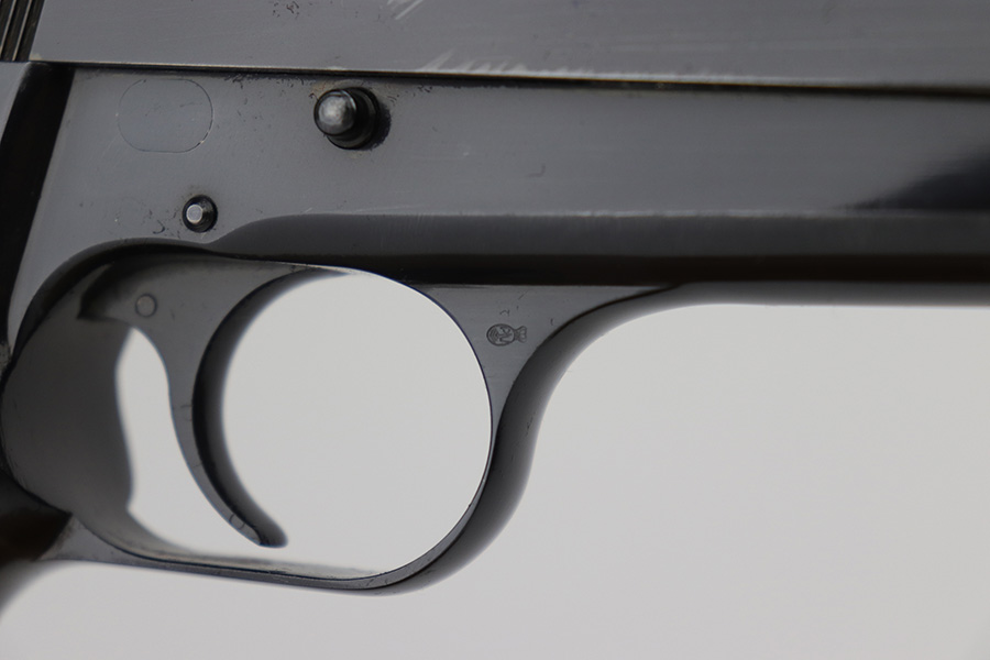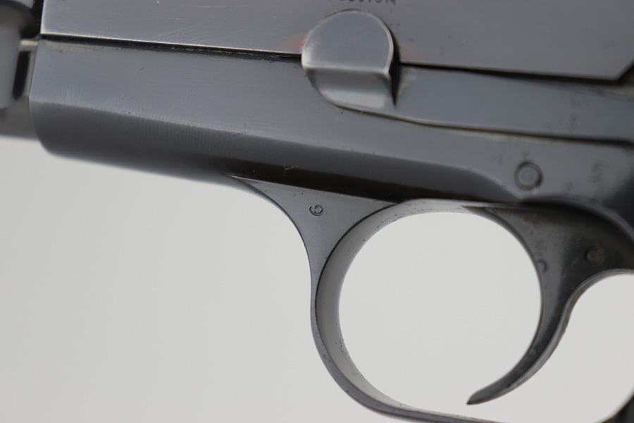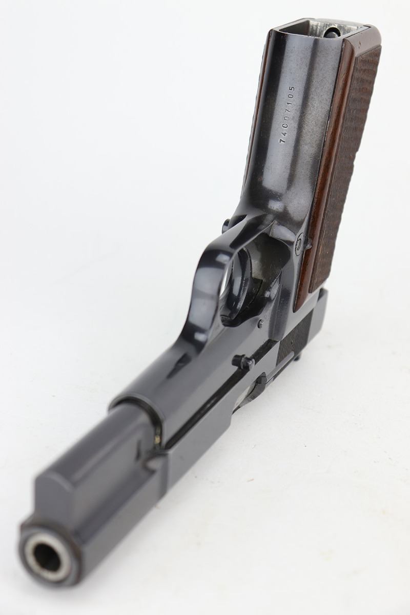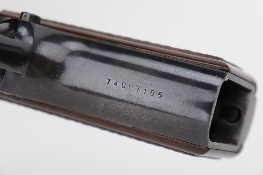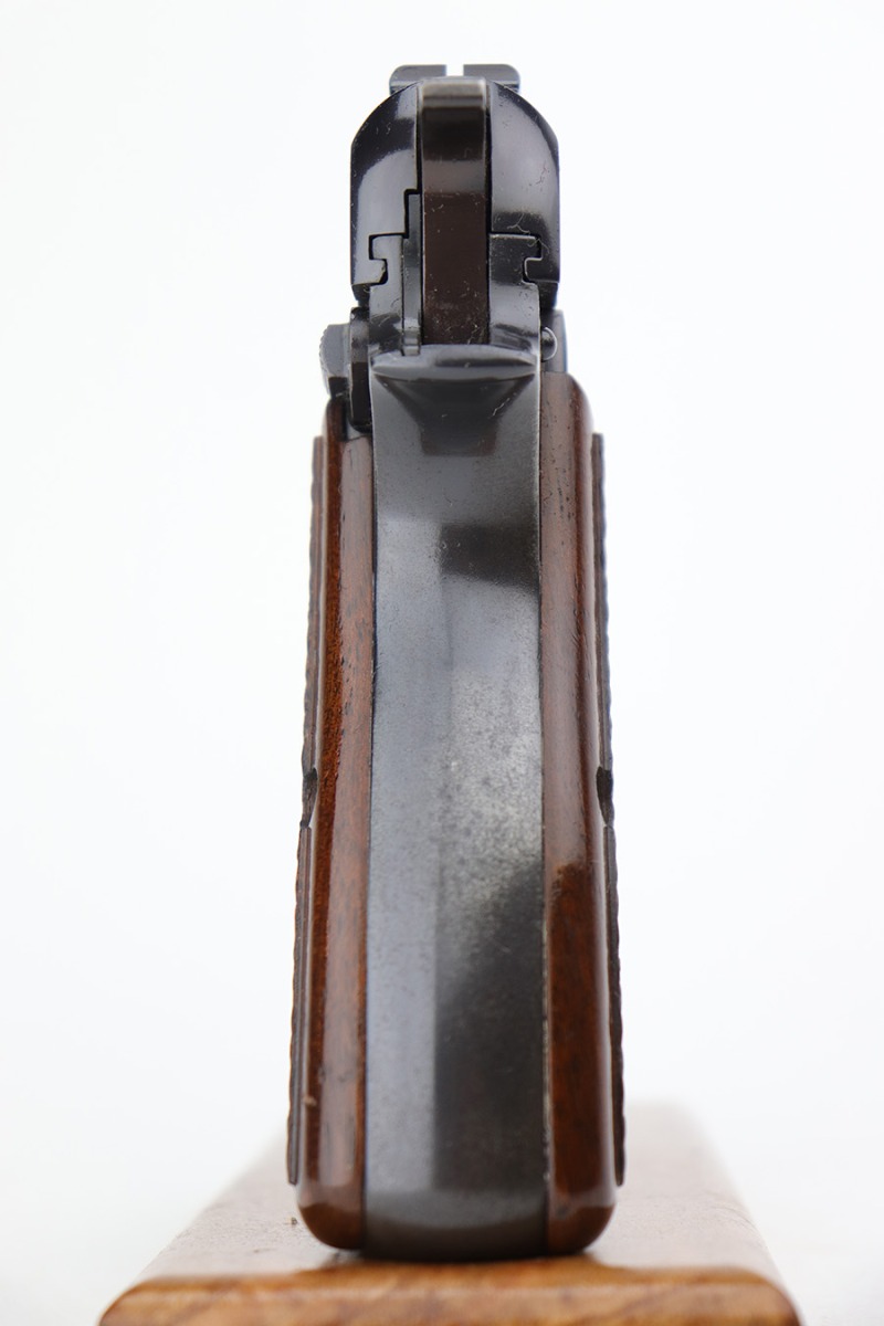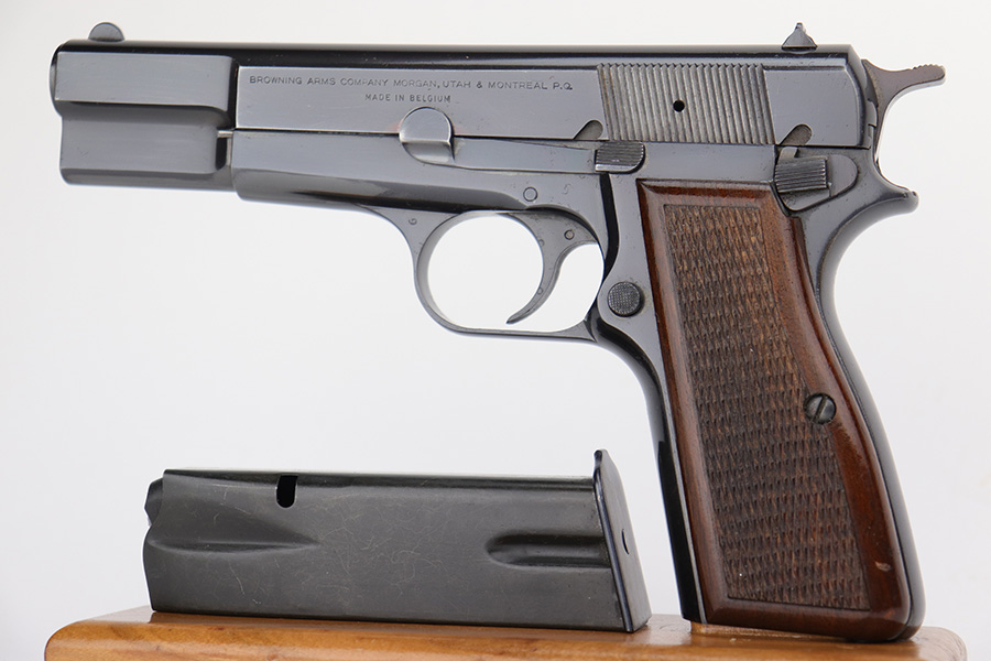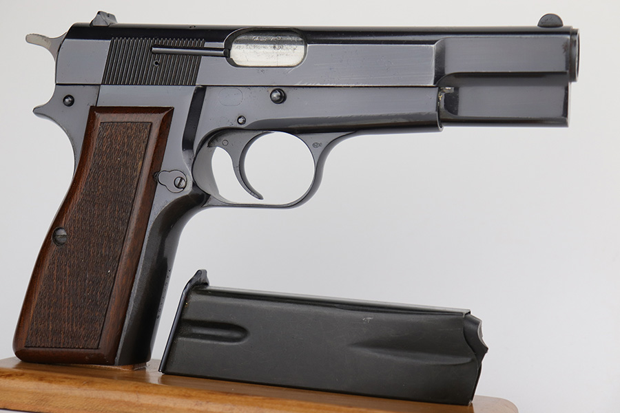 6/7/23 – This is a very nice example of an FN Browning Hi Power manufactured in Belgium in 1974 and chambered in 9mm. All matching with the proper Belgian proofs. Comes with its original Browning soft case and one magazine. The gun itself has retained about 95% of its original high polish finish. The majority of the wear comes in the form of thinning and light pin-pricking on the grip straps, so the profile views are actually minty. Fitted with excellent wood grips. The bore is minty.