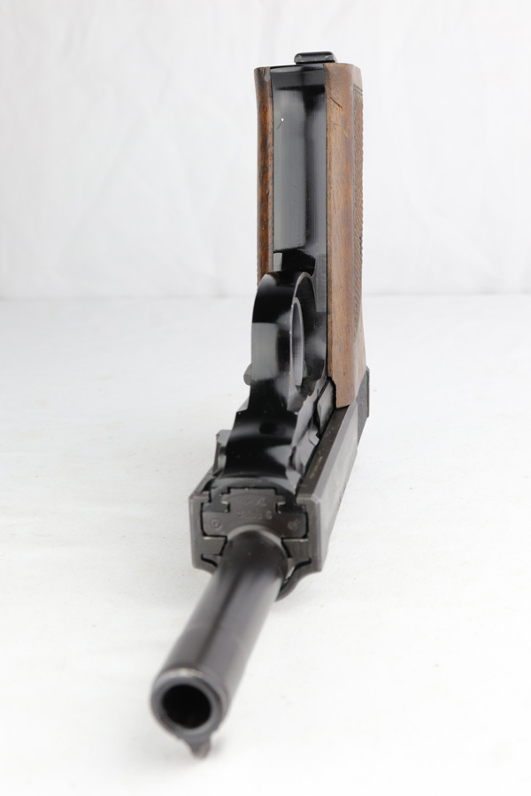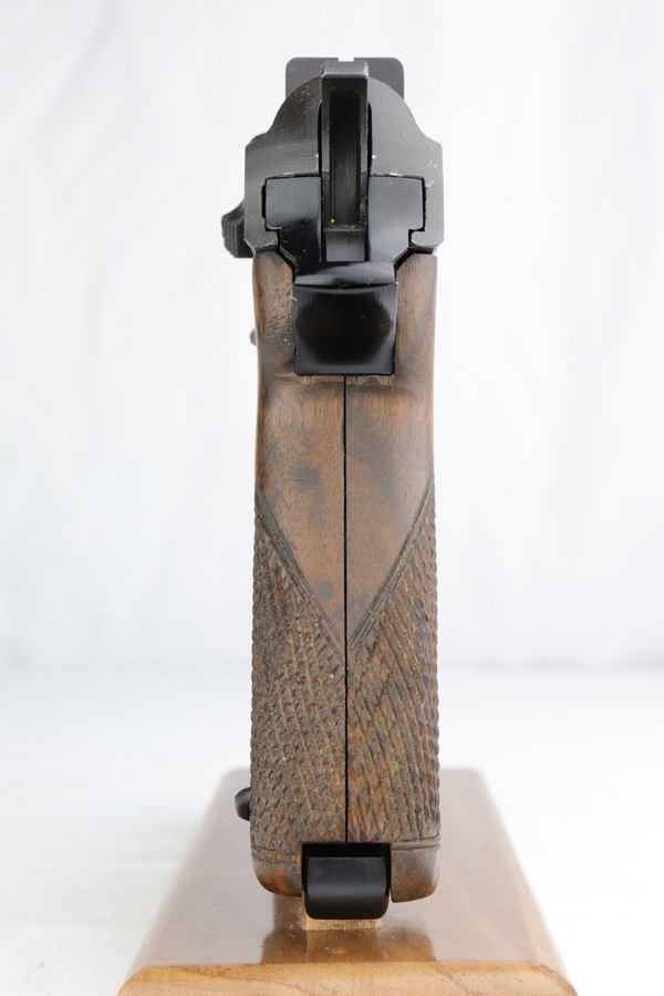 4/22/19 – From the Warren Buxton collection, this is a Walther P.38 with no serial number. Made in 1974, the pistol is in excellent original condition and marked ‘P 38’ on the slide at a time where these guns were being produced as the ‘P 1’. There is barely any bluing loss, but the right side slide does show some obvious pitting. Scarce, post-war factory grips. Minty bore. Small import mark under the slide.