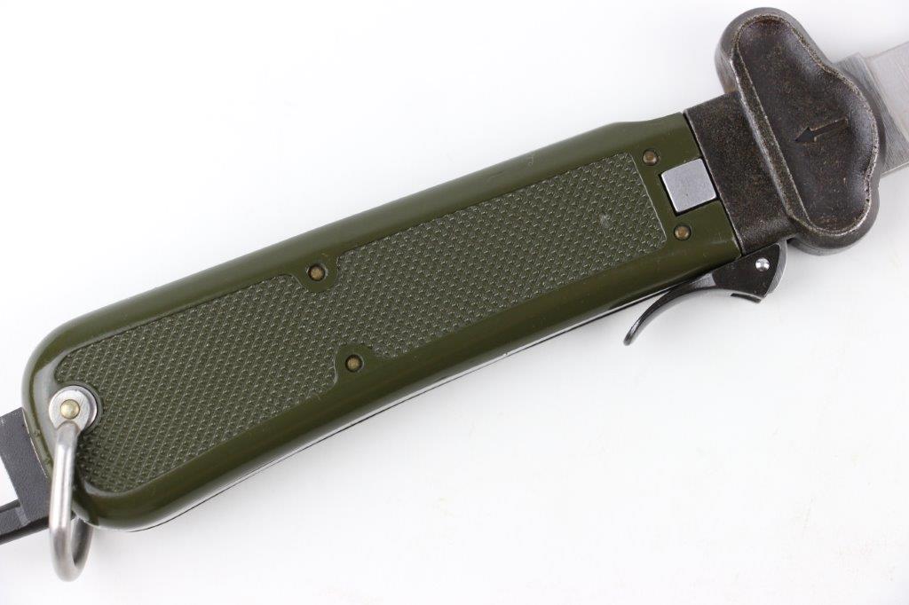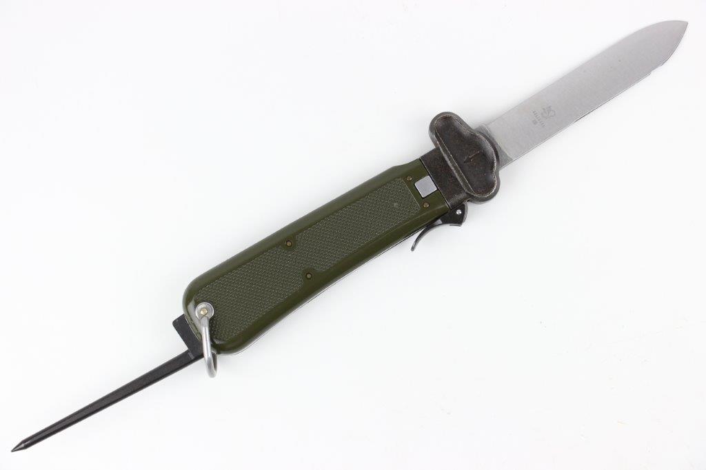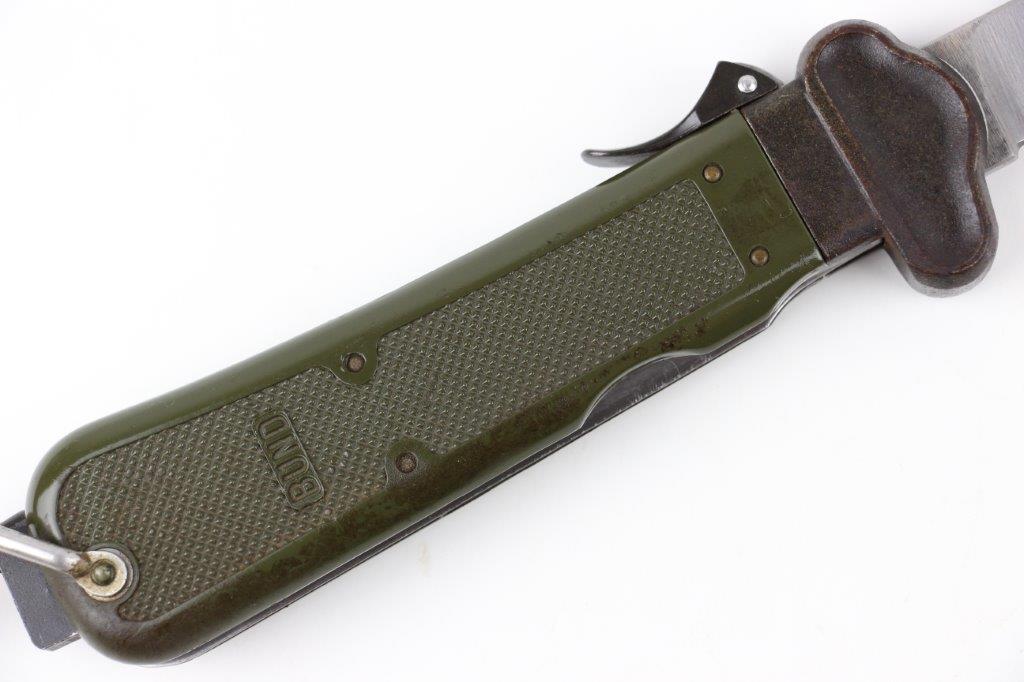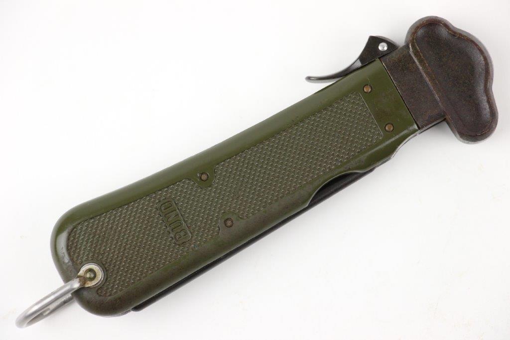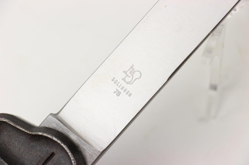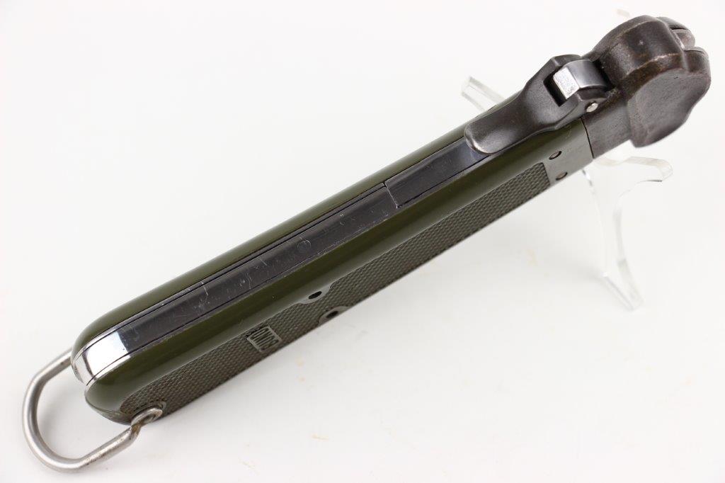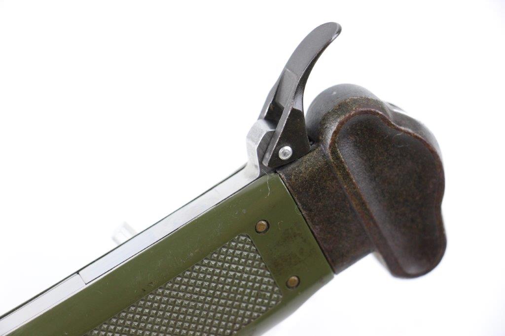 9/24/24 – This is an excellent condition West German Military Gravity Knife. The blade is maker marked with an Eickhorn logo and “Solingen 75” underneath, for 1975. Beautiful cross graining visible throughout and a clean factory sharp edge. A few very mild surface scratches on either side. Smooth action with functional release lever and side-folding spike. The mouth of the knife has natural patina but all of the blued parts still retain almost all of the original finish. A very clean, collectible German gravity knife.