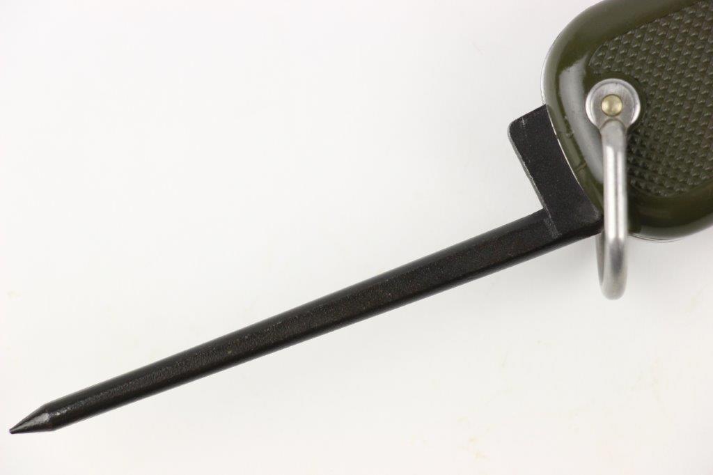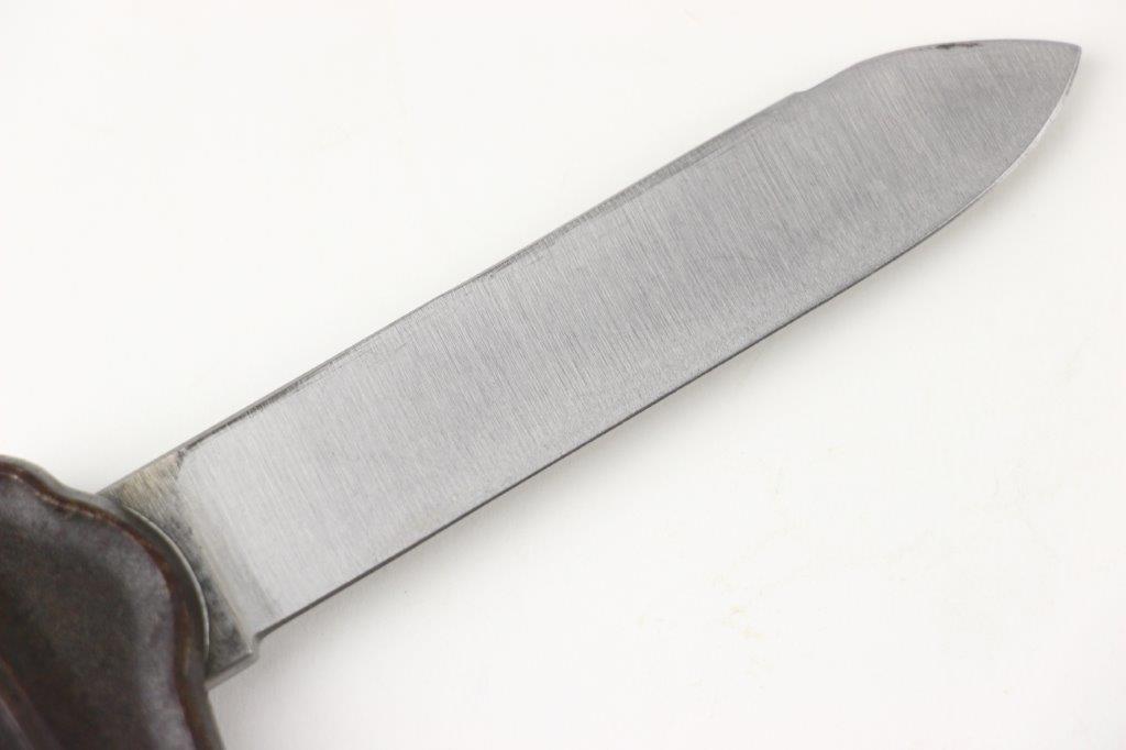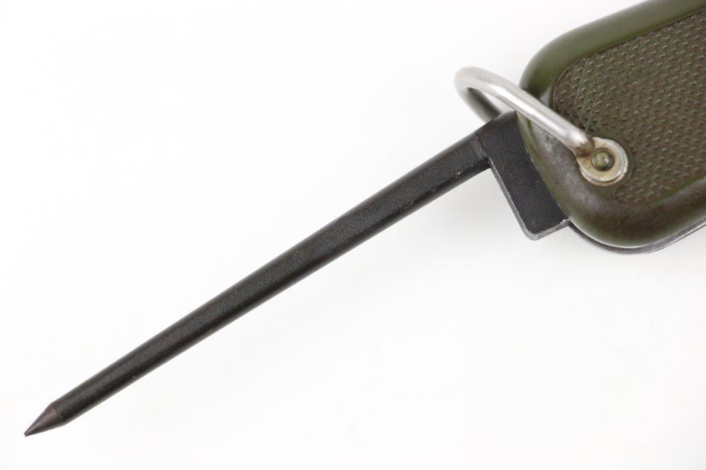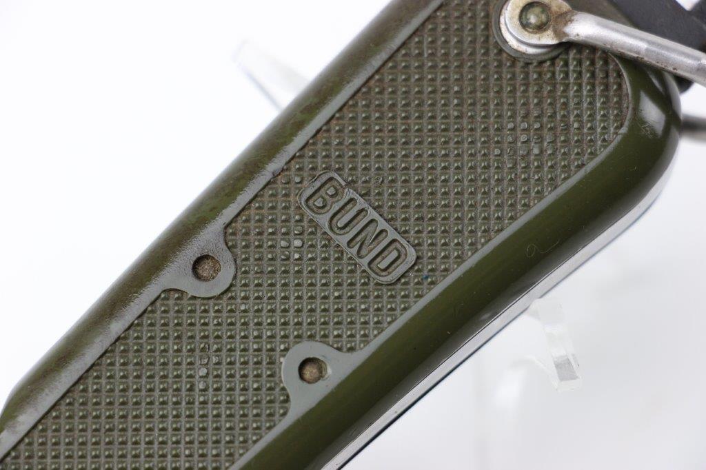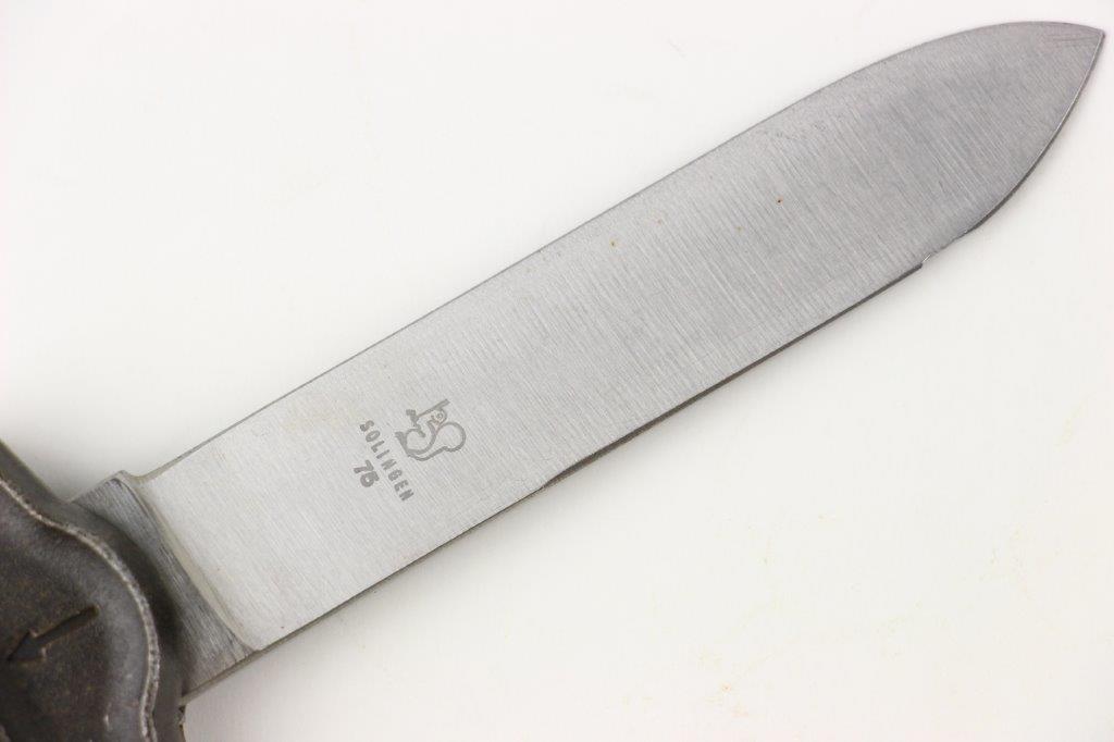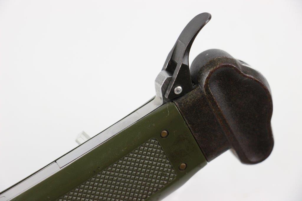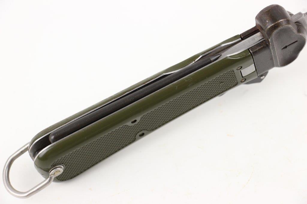 9/24/24 – This is an excellent condition West German Military Gravity Knife. The blade is maker marked with an Eickhorn logo and “Solingen 75” underneath, for 1975. Beautiful cross graining visible throughout and a clean factory sharp edge. A few very mild surface scratches on either side. Smooth action with functional release lever and side-folding spike. The mouth of the knife has natural patina but all of the blued parts still retain almost all of the original finish. A very clean, collectible German gravity knife.
