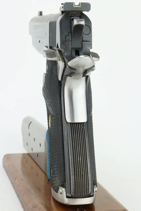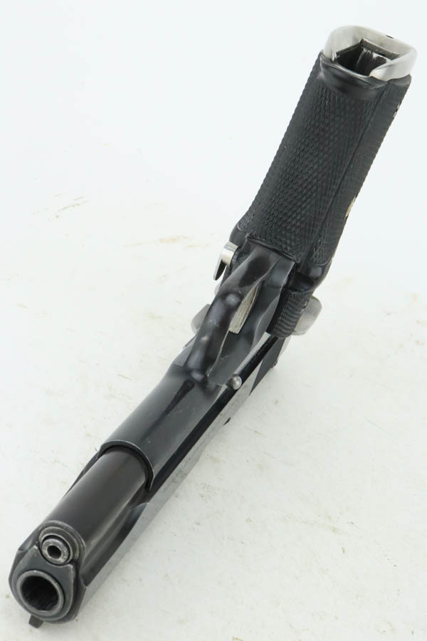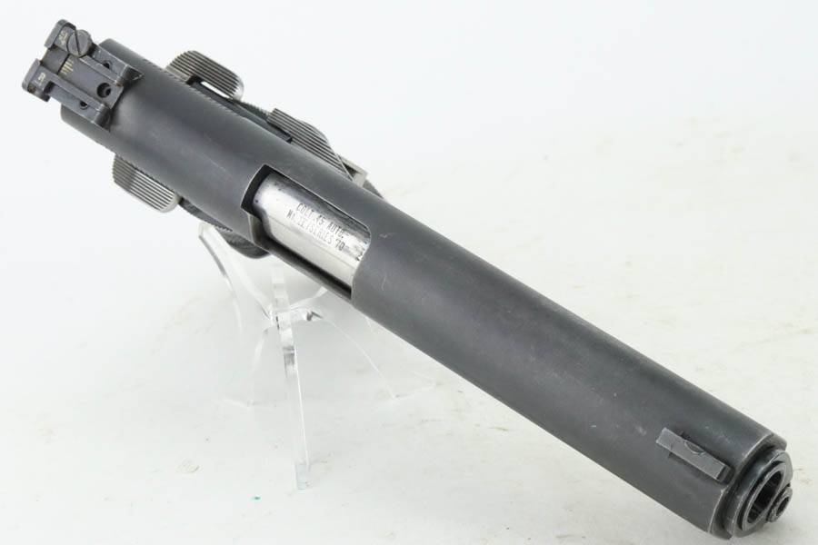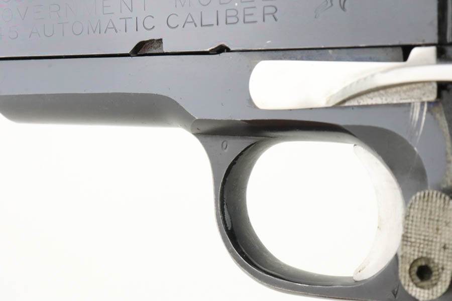 6/24/24 – This is a very nice example of a Colt Government Model MK IV Series from 1976. Chambered in .45 ACP. Most of the small parts have been upgraded, including the trigger, mag release, thumb safety, slide stop, hammer, and grip safety. Magazine well flare was added. Comes with a nice finger extension magazine and is fitted with a black rubber Pachmayr grip. There is minor high edge wear and a small area of minor discoloration at the left front of the slide. Excellent, shiny bore.