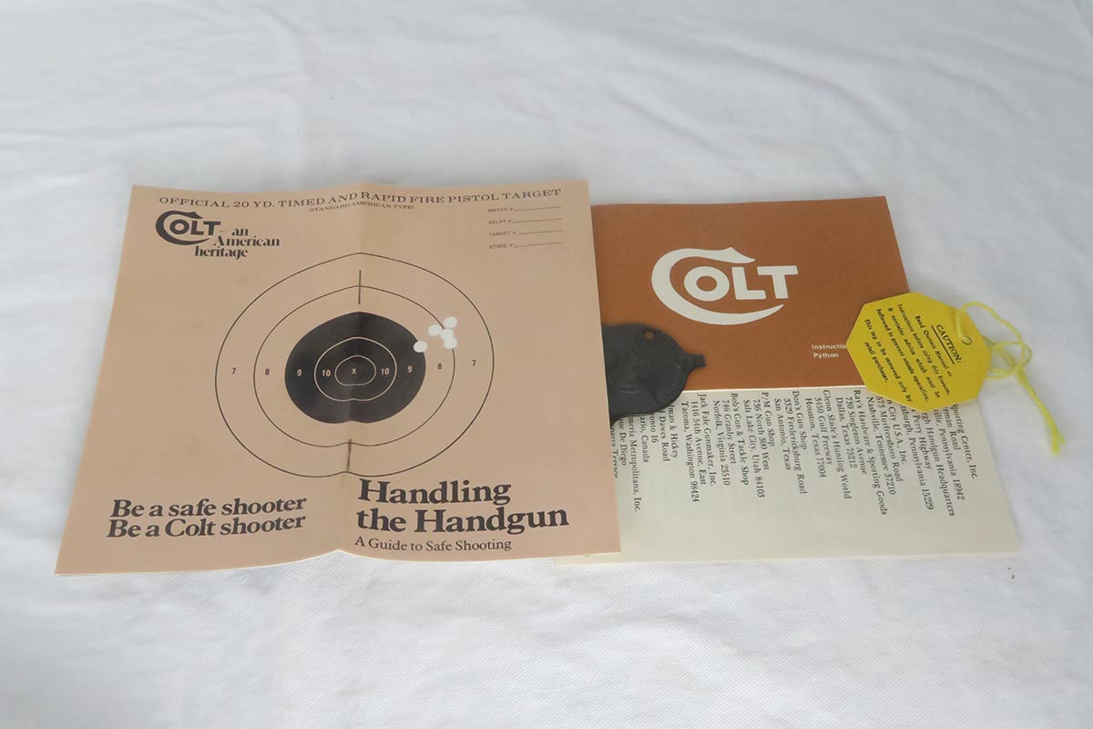 2/12/18 – “As new in the box” Colt Python from 1975-1976. It is essentially unused, and we doubt that it has been fired after leaving the factory. Only a minor roll mark. The blueing is deep and lustrous. Comes with an original box and all the paperwork, including a screwdriver tool.
