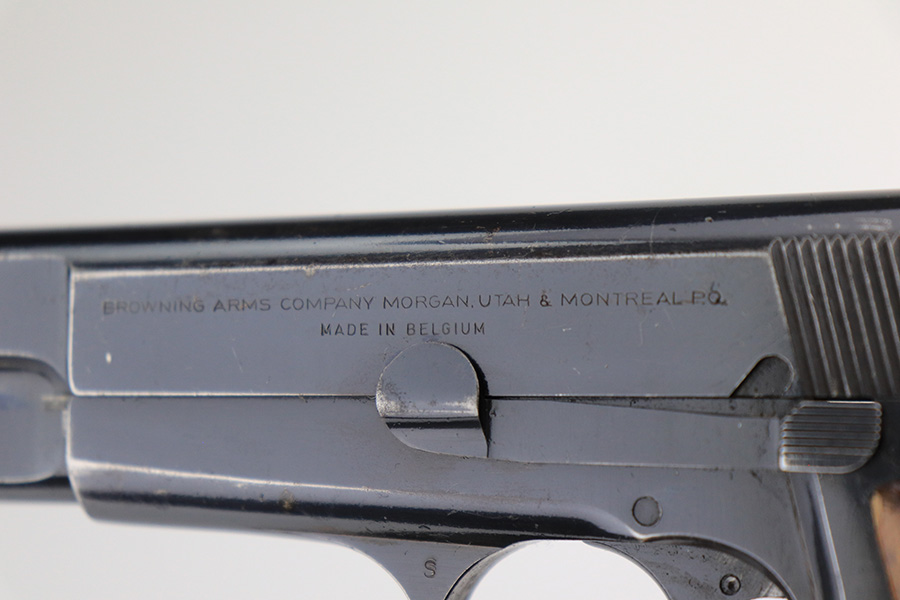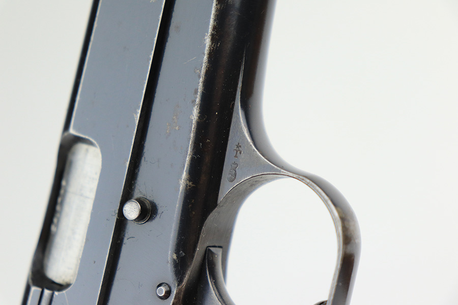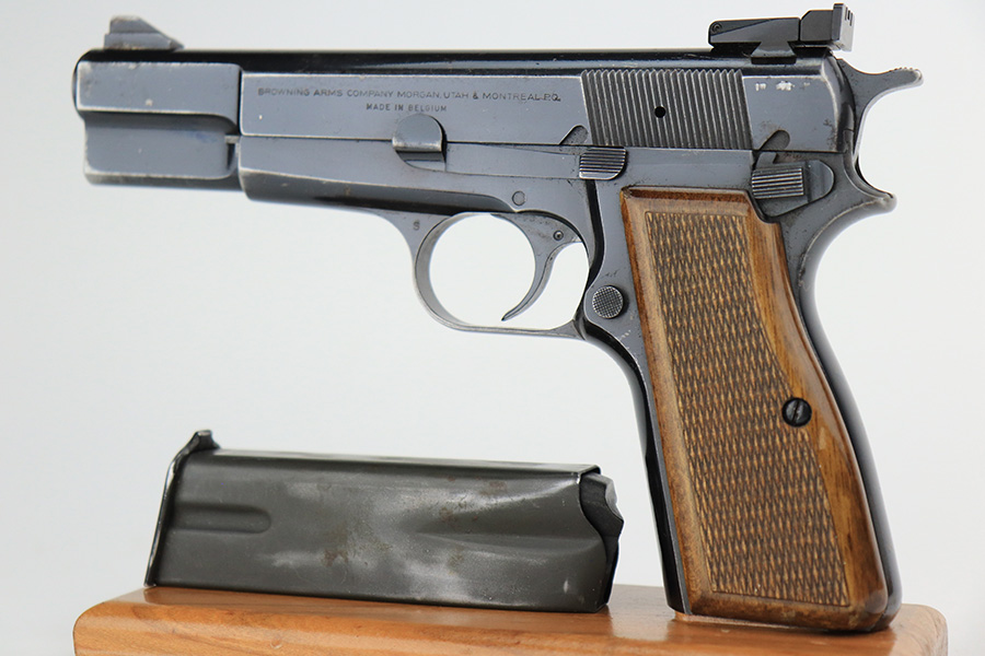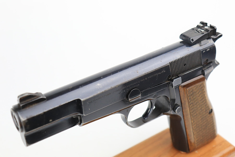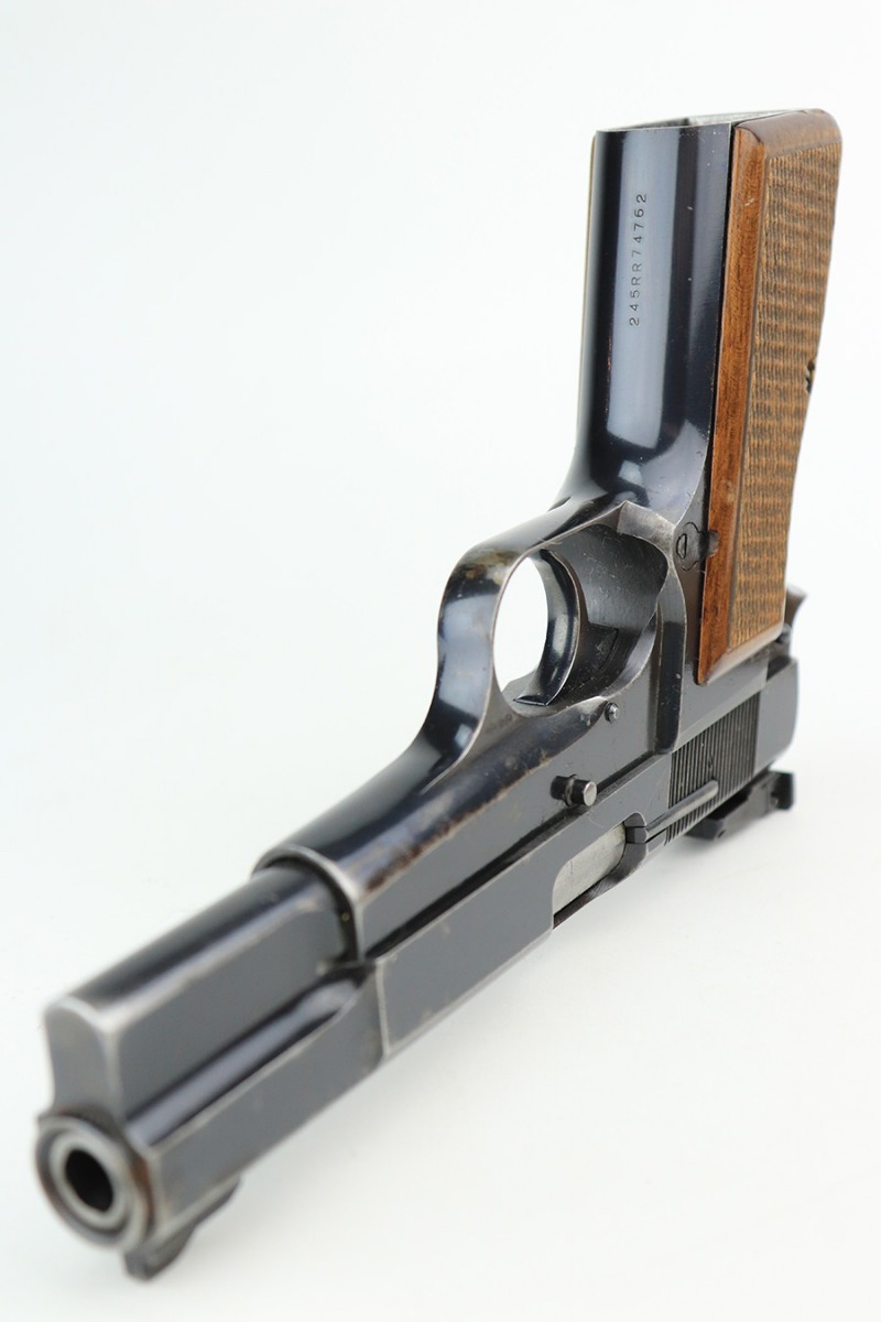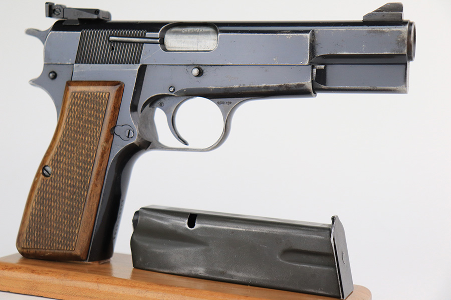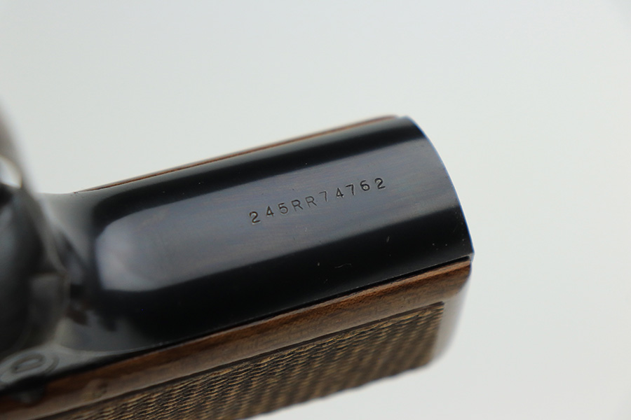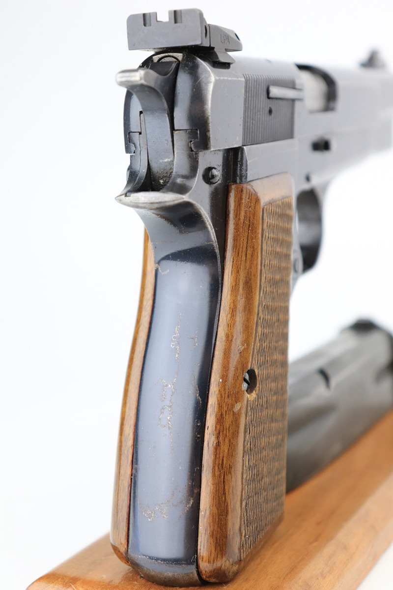 4/22/22 – This is a very nice example of an FN Browning Hi Power made in Belgium in 1977. The gun is all matching, has the proper Belgian proofs, and has an adjustable rear sight. It has retained about 93% of its original high polish bluing. Most of the wear is around the muzzle and concentrated around the high edges of the slide. Small spots of discoloration and a few light scratches along the sides and top of the slide. Wear on the underside of the trigger guard. There is some splotchy discoloration on the back strap. Comes with excellent wood grips and a proper magazine. Excellent, shiny bore.