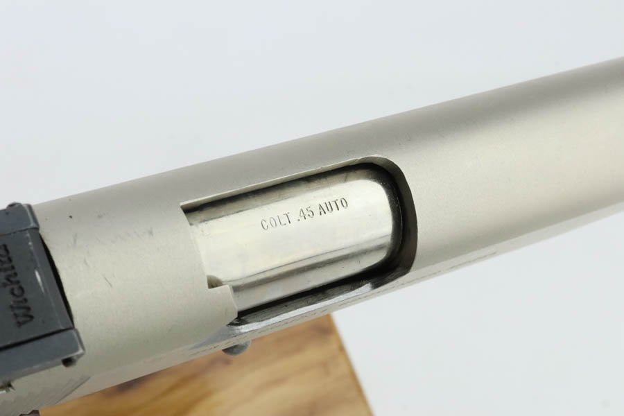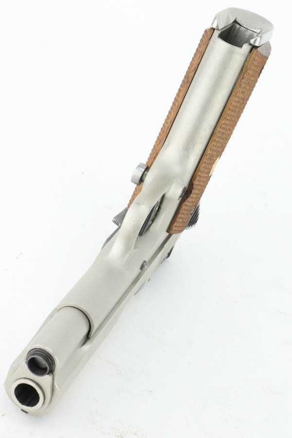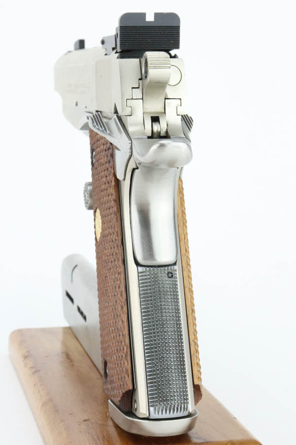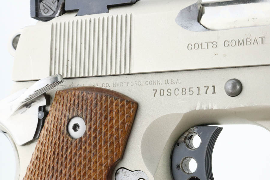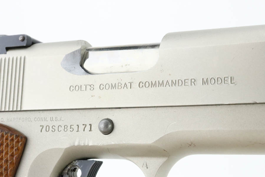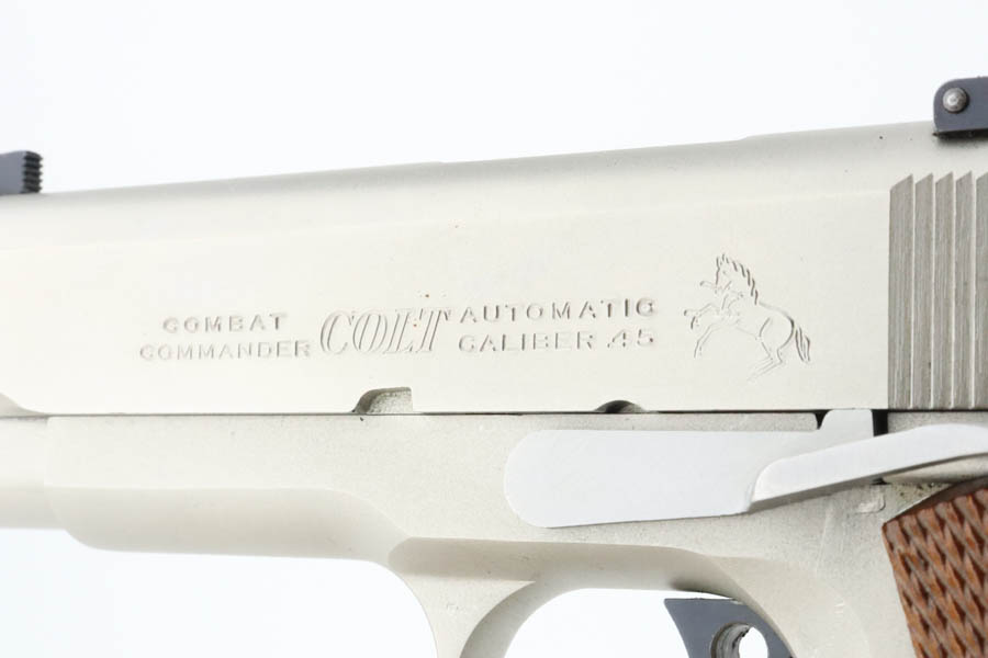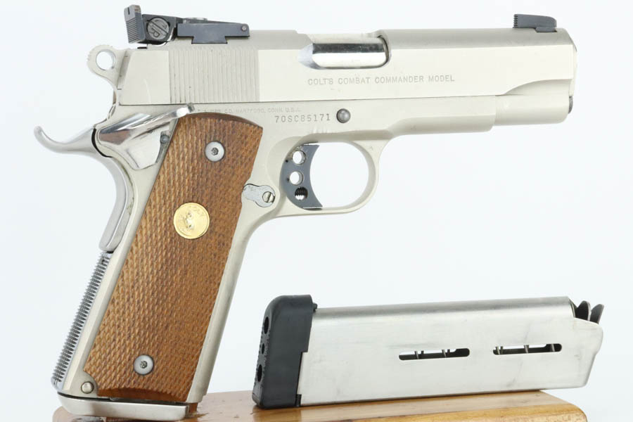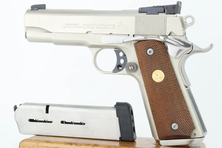 6/24/24 – This is a very nice example of a Colt Combat Commander from 1982. Chambered in .45 ACP with a nice satin nickel finish. Most of the small parts have been upgraded, including the trigger, mag release, thumb safety, slide stop, rear sight, and grip safety. Magazine well flare was added. Comes with a nice finger extension magazine and is fitted with checkered wood grips. There is very little finish loss, but there are tiny scratches and scuffs throughout. Minty bore.