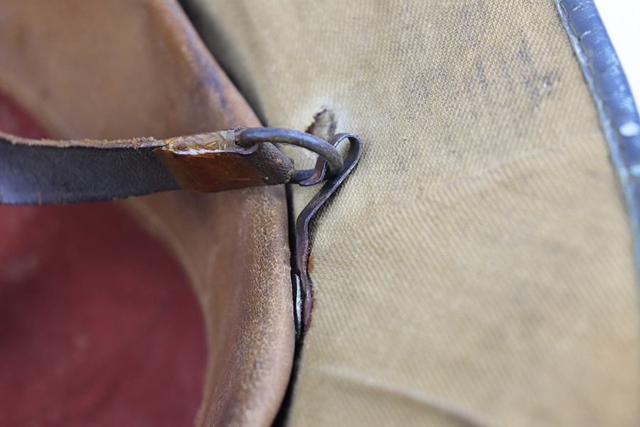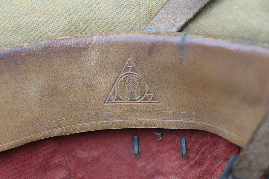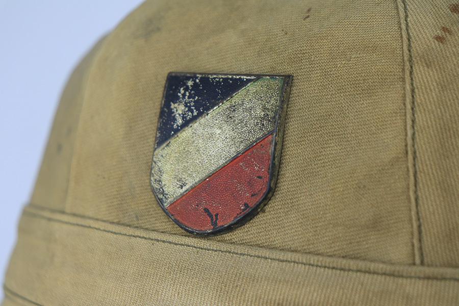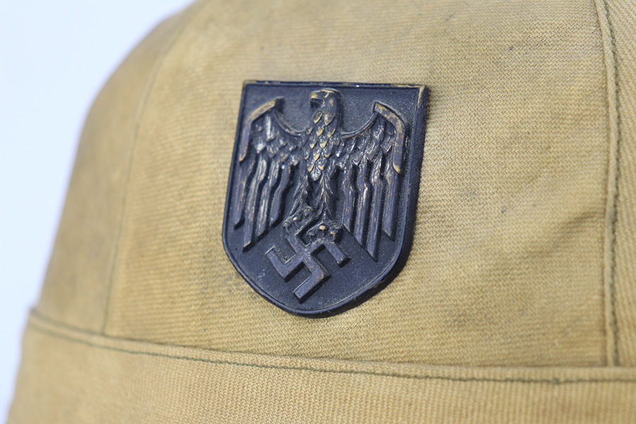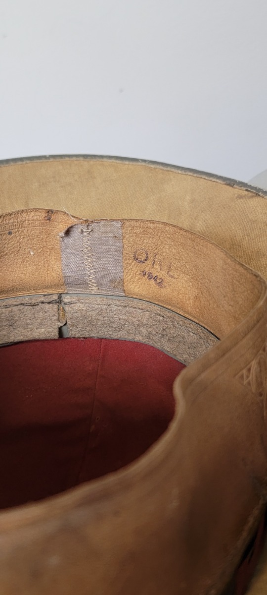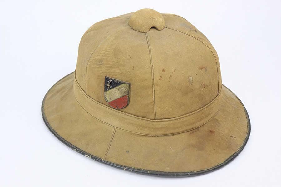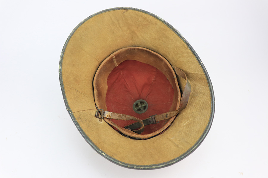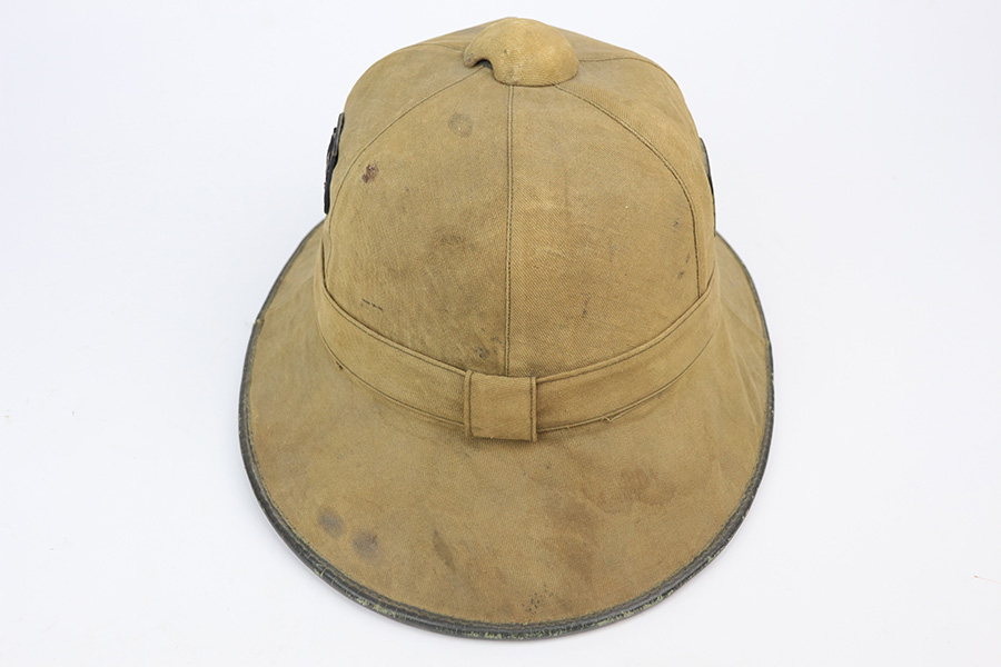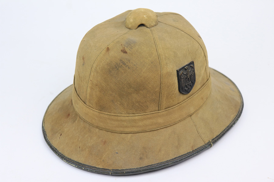 1/19/22 – This is an original 1st model Pith helmet from WW2. These helmets were used by the DAK and the 1st model helmets are more scarce than the 2nd model Pith helmets. The 1st model has a cloth exterior and a molded cork brim. This example is in very good overall condition with some honest wear from use and aging. The exterior has a few small spots of discoloration and light surface scuffs but no major issues. The stitching is all tight and original. There’s considerable aging and surface wear on each of the two exterior decals but they’re both original and in tact. The interior is fairly clean and shows aging and color fading throughout. The interior of the leather liner is 1942 dated and ink stamped by the maker. Also comes with the original leather chin strap. Size 55.
