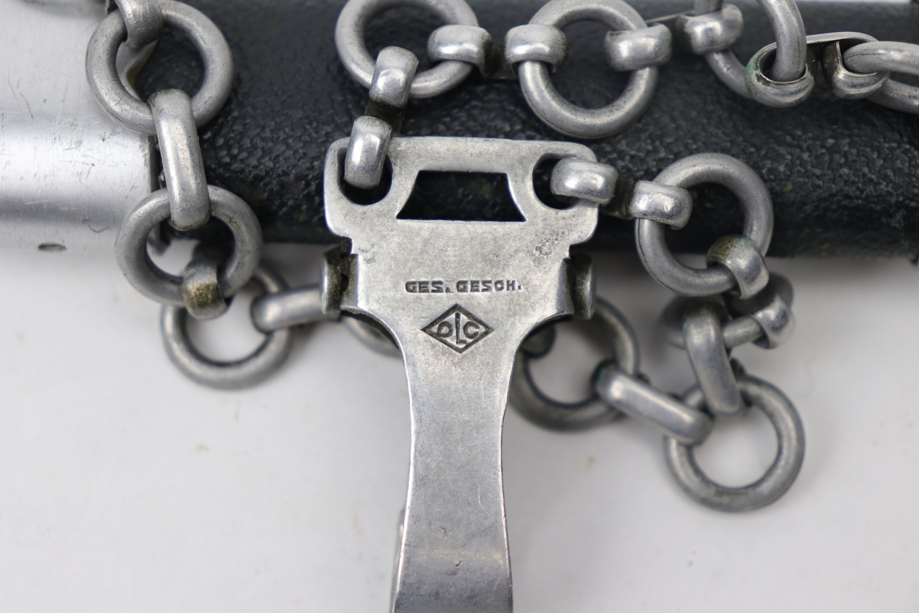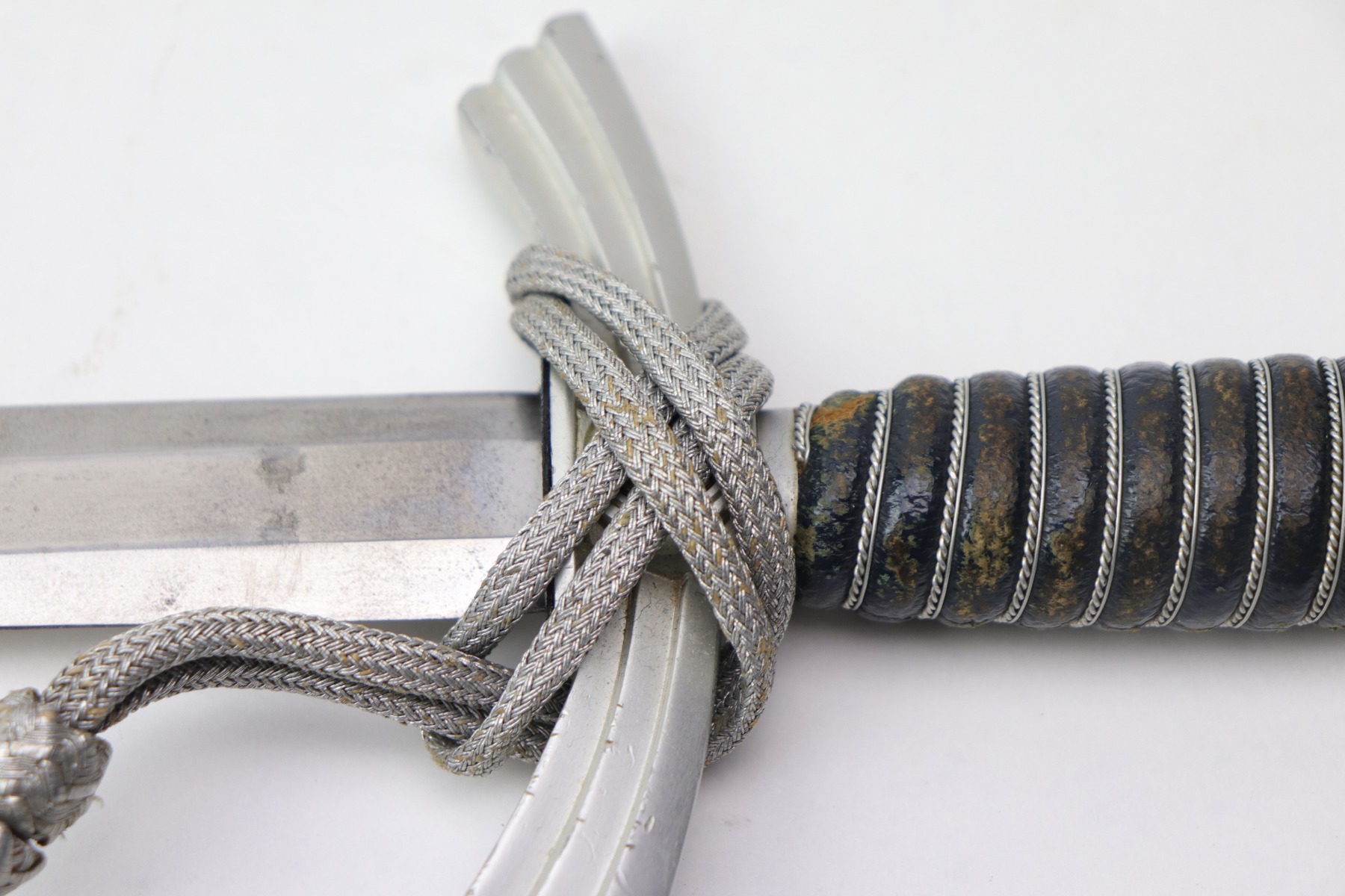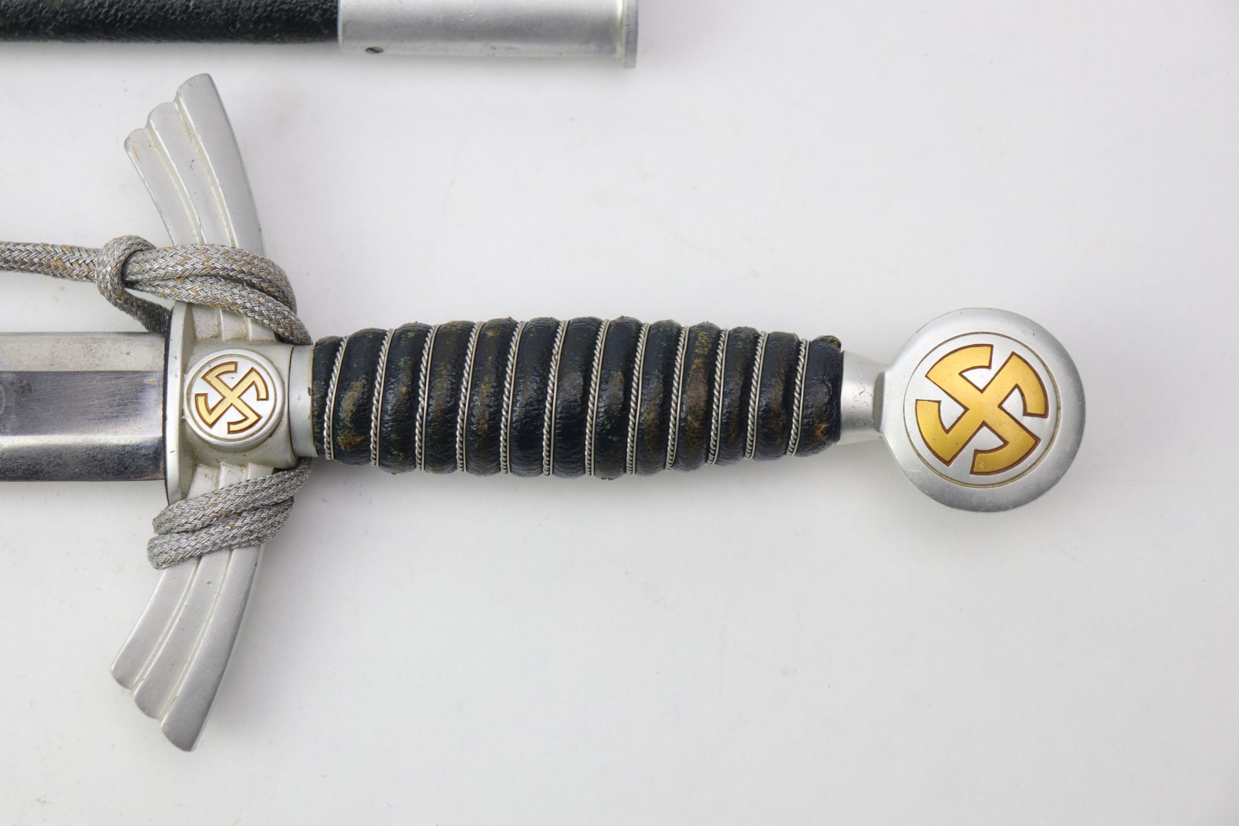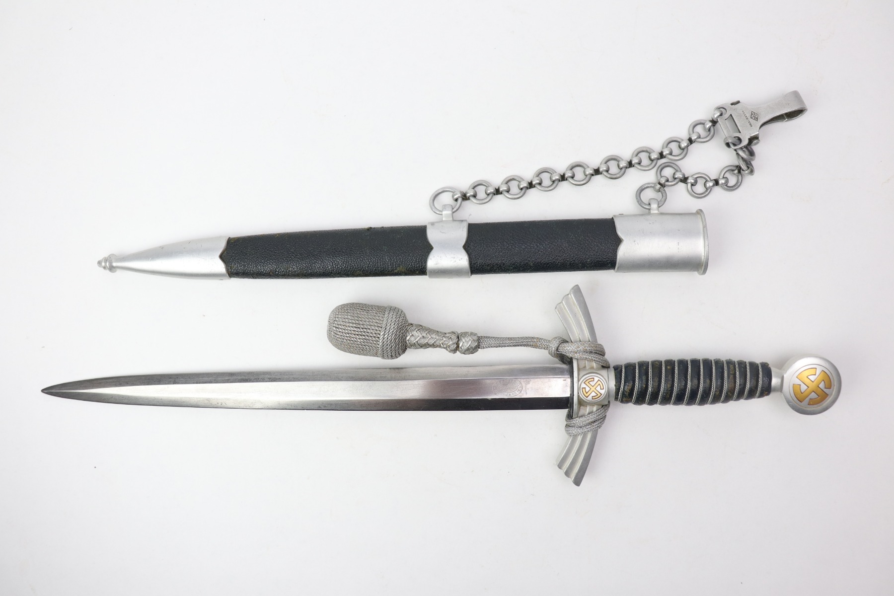 8/13/20 – This is a 1st Model Luftwaffe Dagger. This particular dagger is aluminum and stamped F & A Helbig Steinback KR.M on the blade. The scabbard has a dagger knot and strong chain stamped with maker mark. The blade has some scabbard wear due to use. The dagger handle is faded in places. Overall excellent condition.