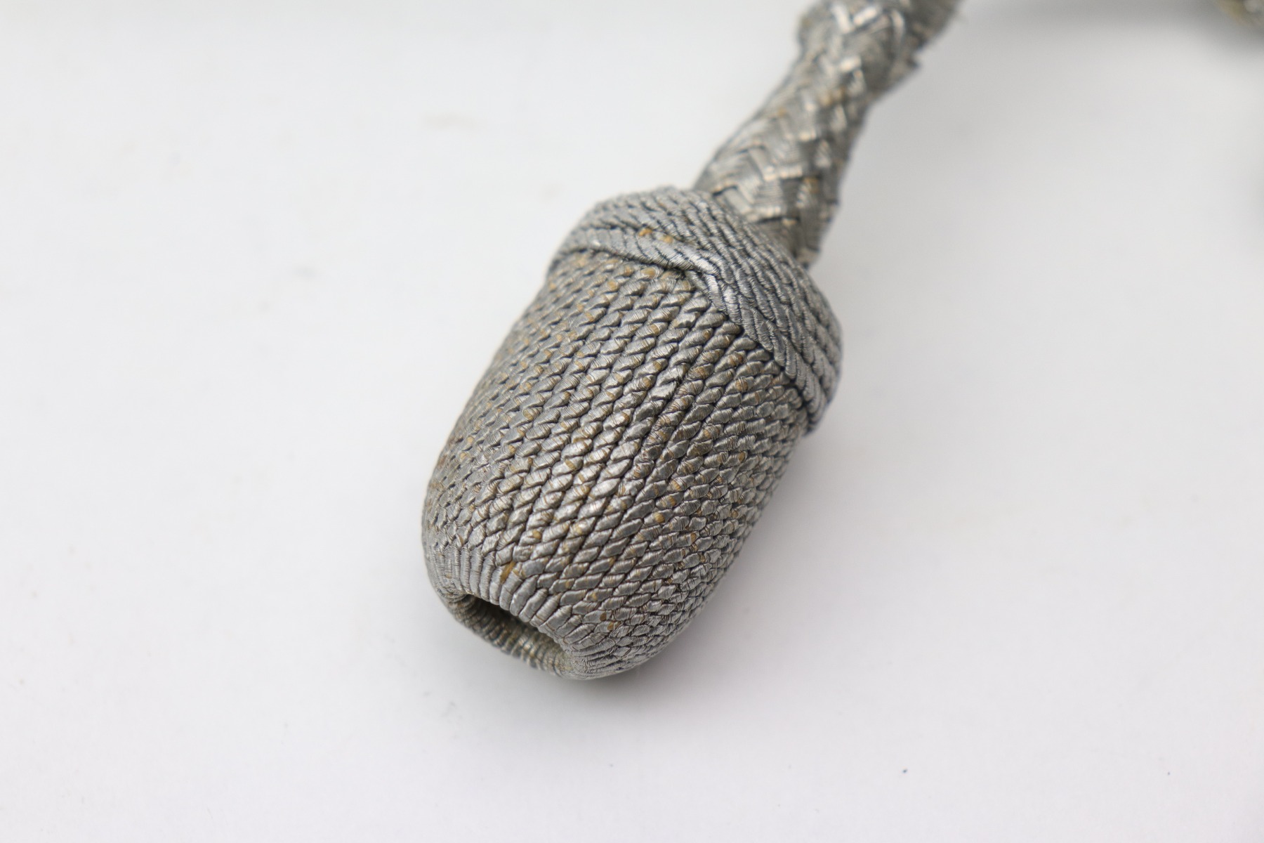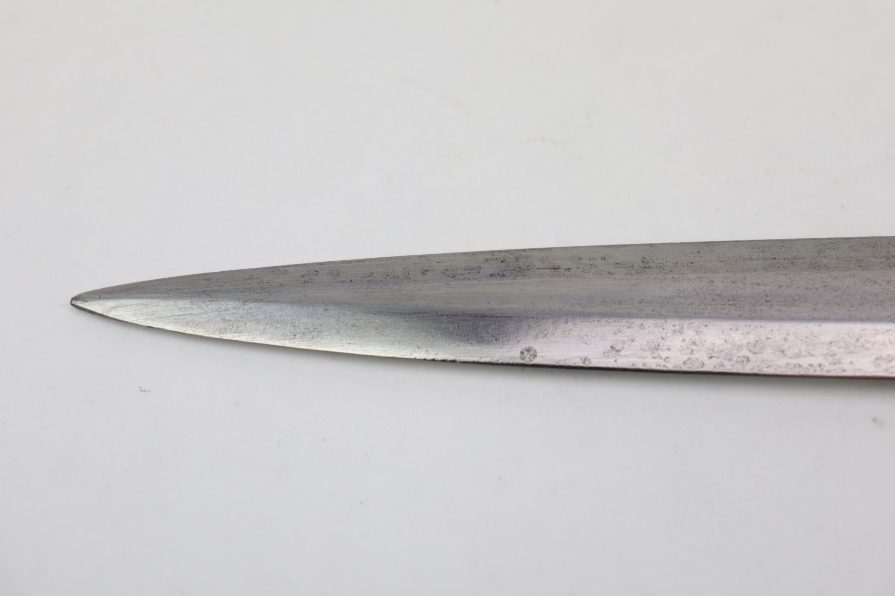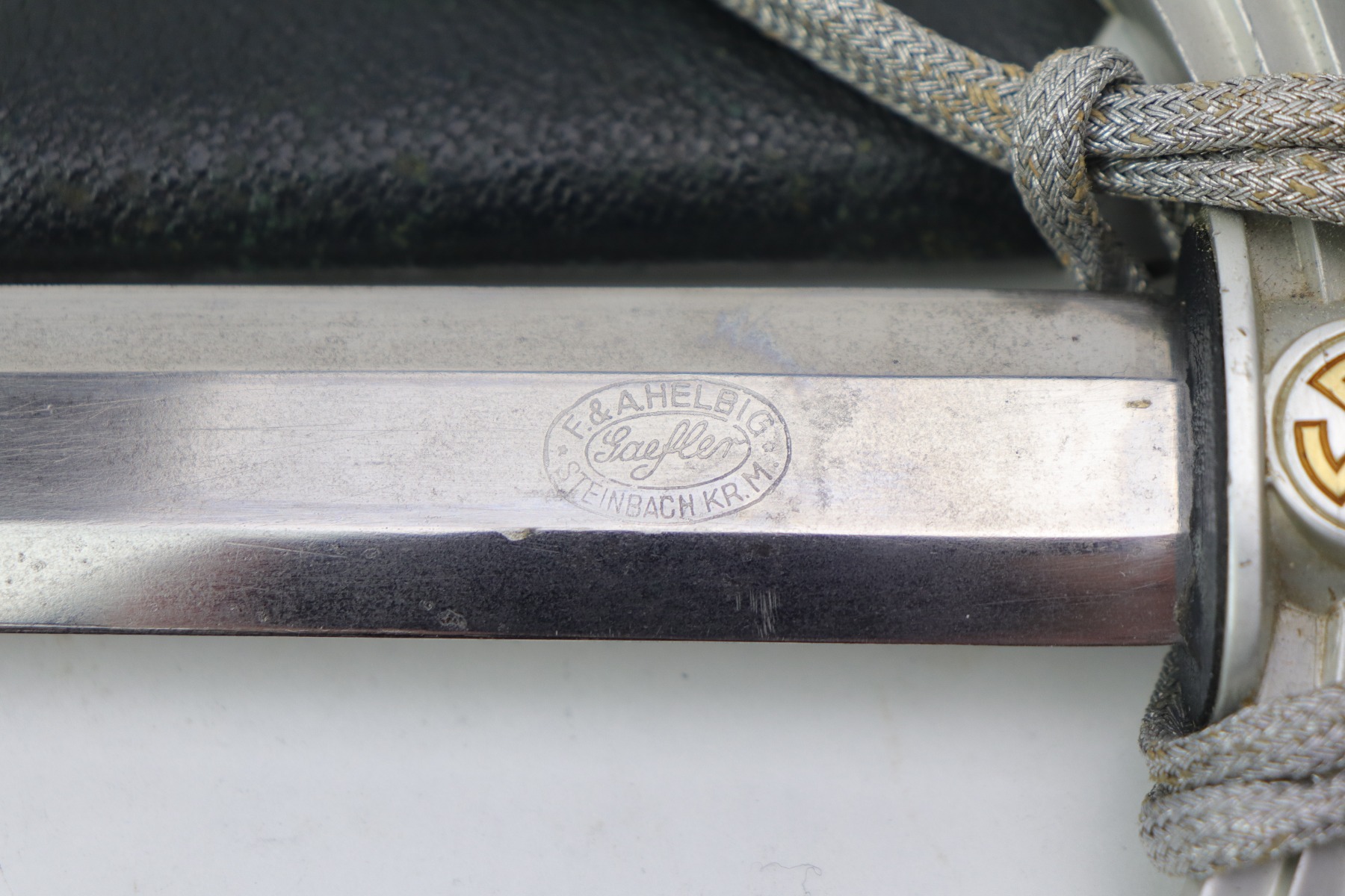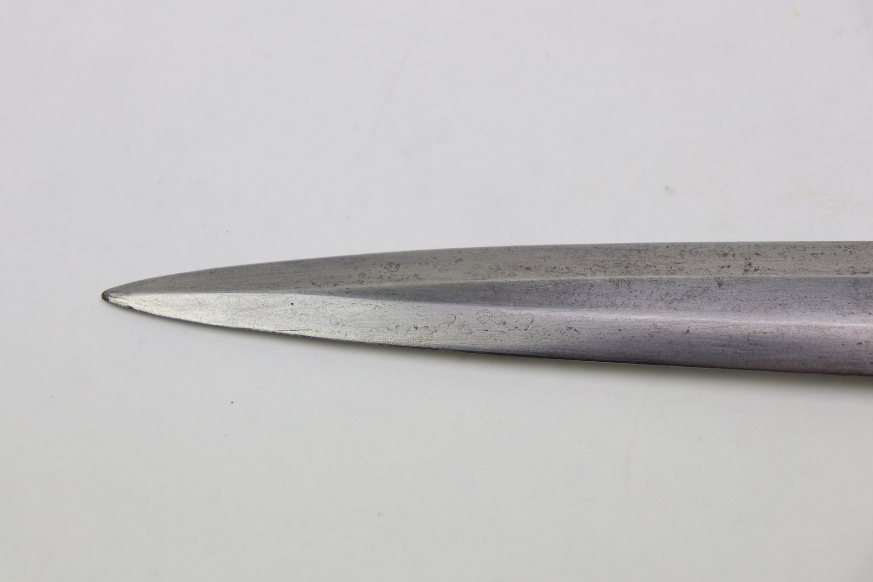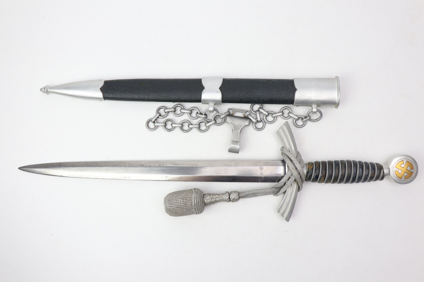 8/13/20 – This is a 1st Model Luftwaffe Dagger. This particular dagger is aluminum and stamped F & A Helbig Steinback KR.M on the blade. The scabbard has a dagger knot and strong chain stamped with maker mark. The blade has some scabbard wear due to use. The dagger handle is faded in places. Overall excellent condition.