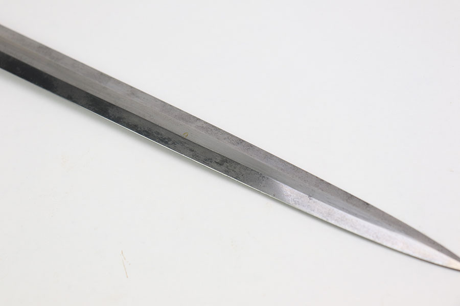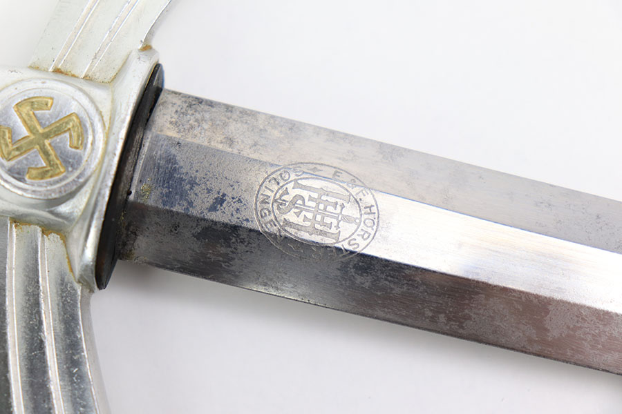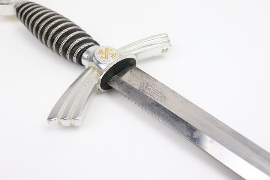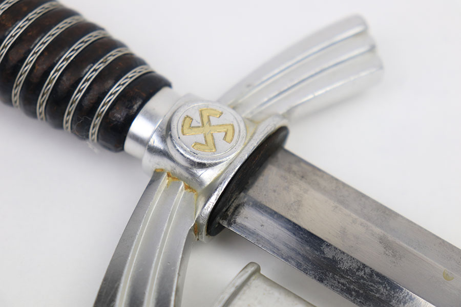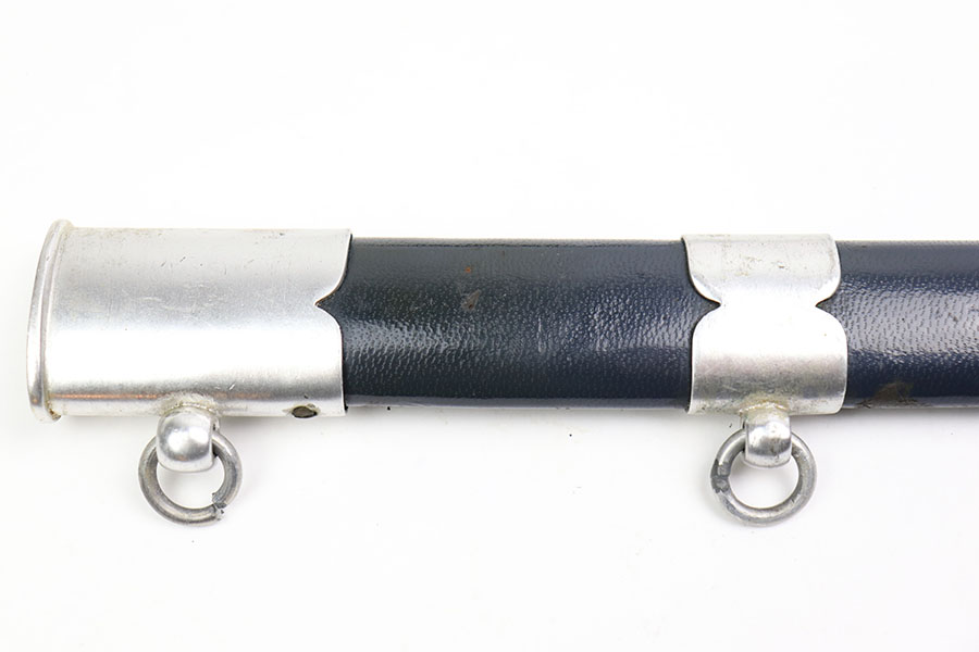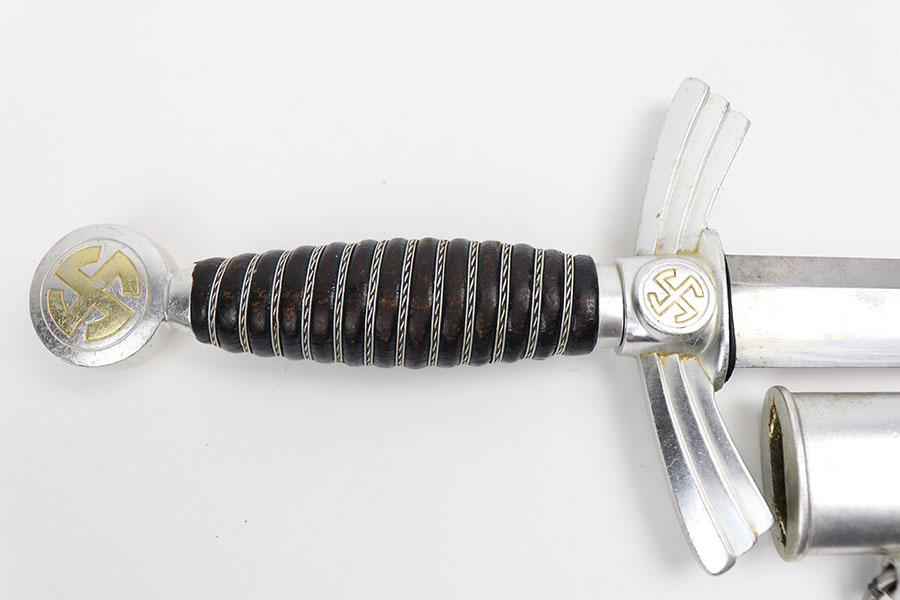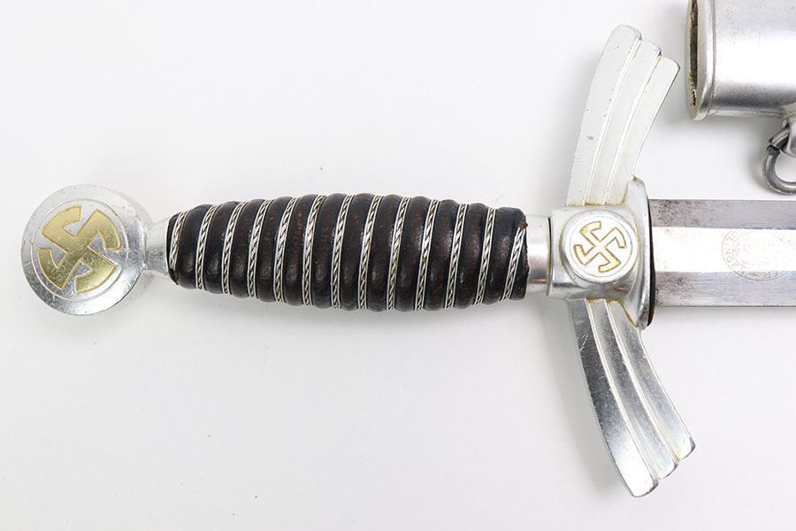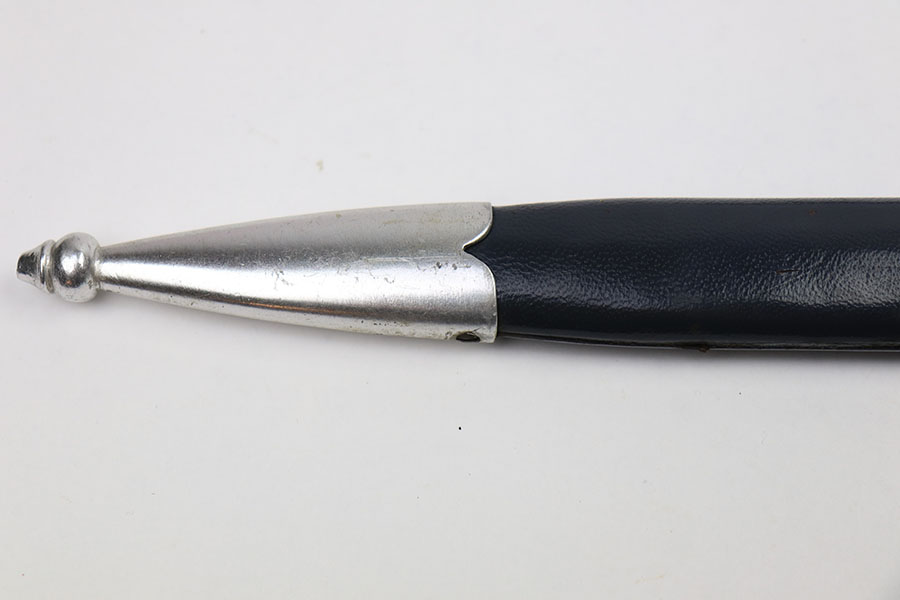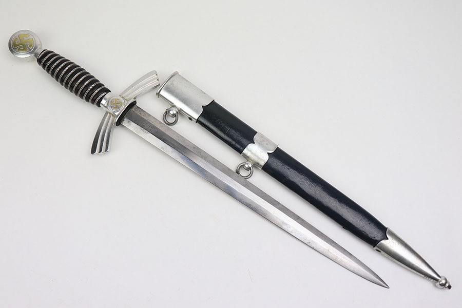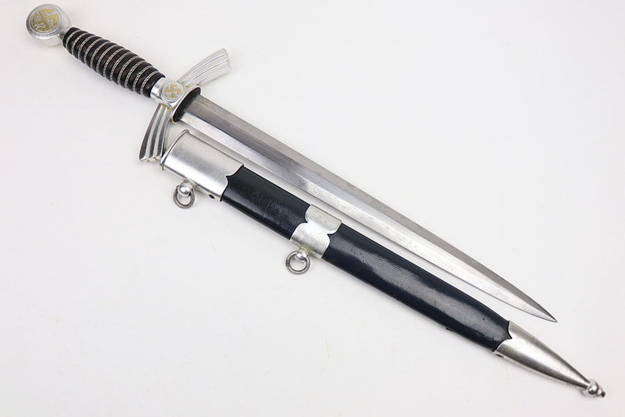 1/13/21 – This is an original 1st model Luftwaffe dagger from WW2. The dagger is maker stamped on the blade by E.&F. Holler. The blade has some light surface wear, but no major damage. No signs of sharpening. The leather handle is in great condition as well with some light surface discoloration but no cracking. The scabbard is also excellent with very nice blue leather and aluminum fittings.