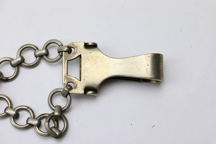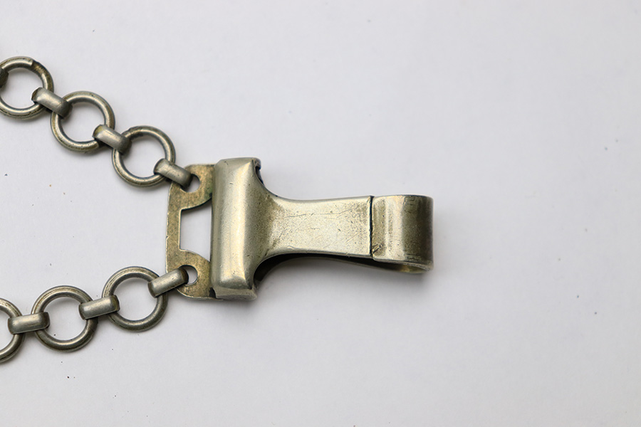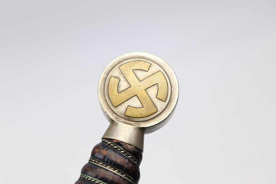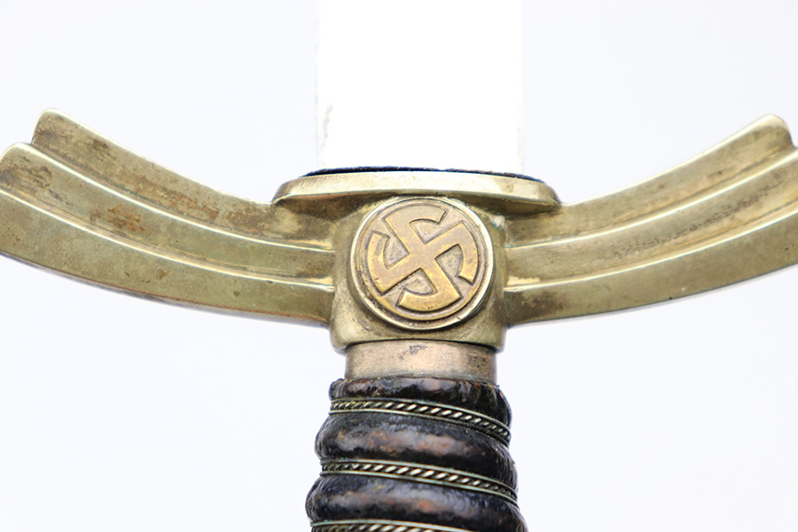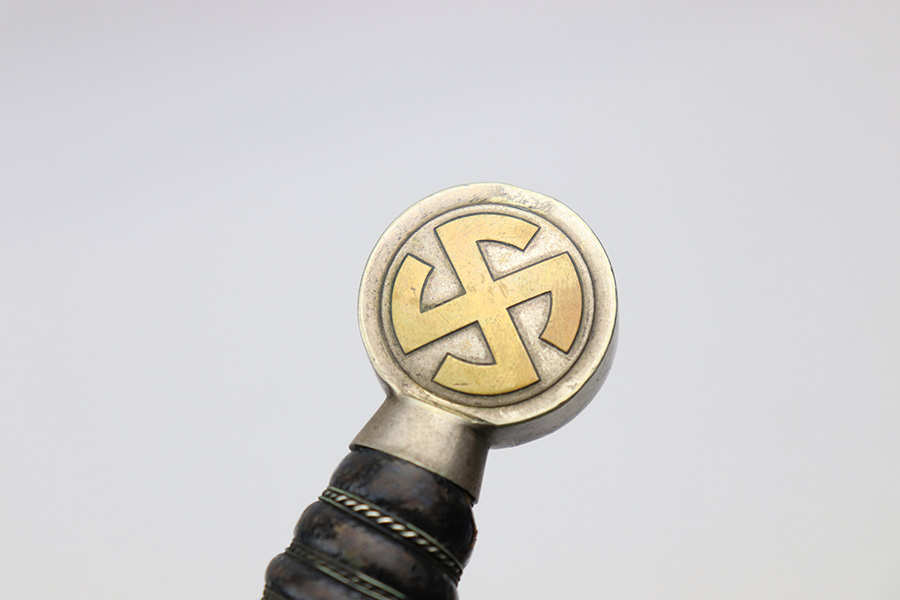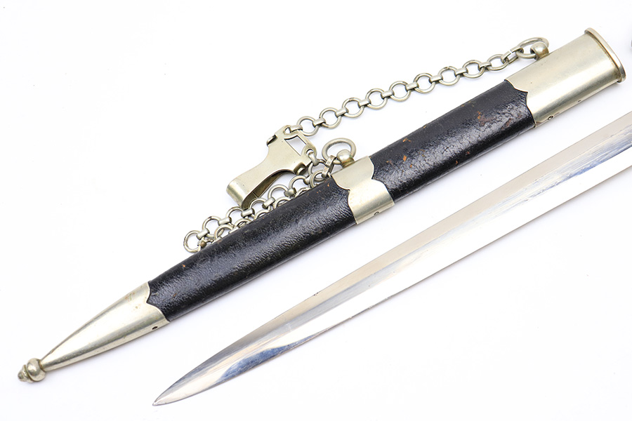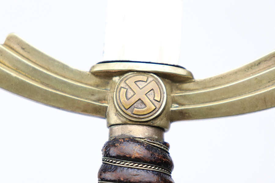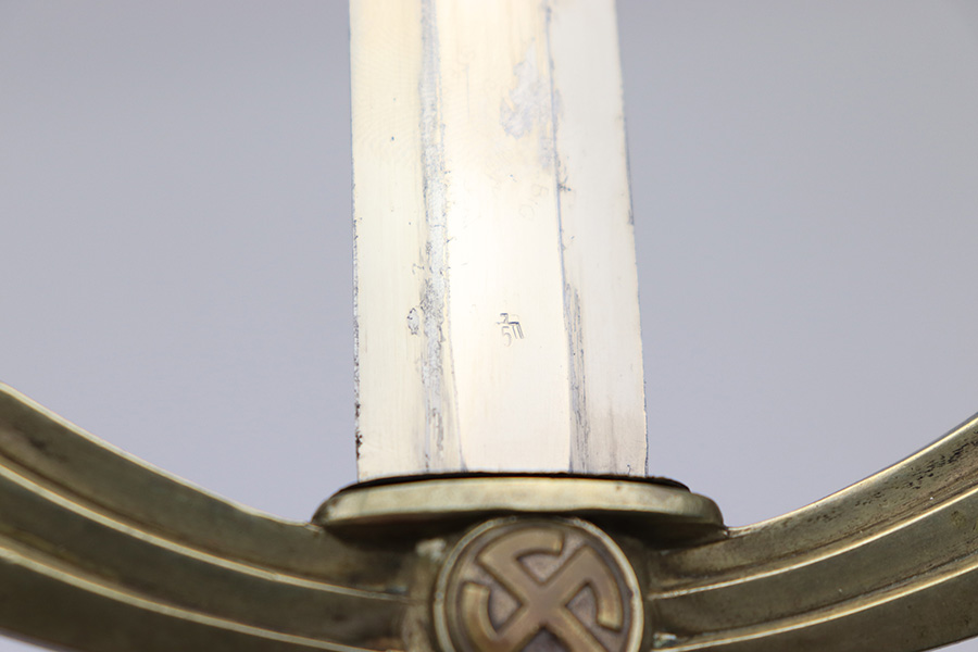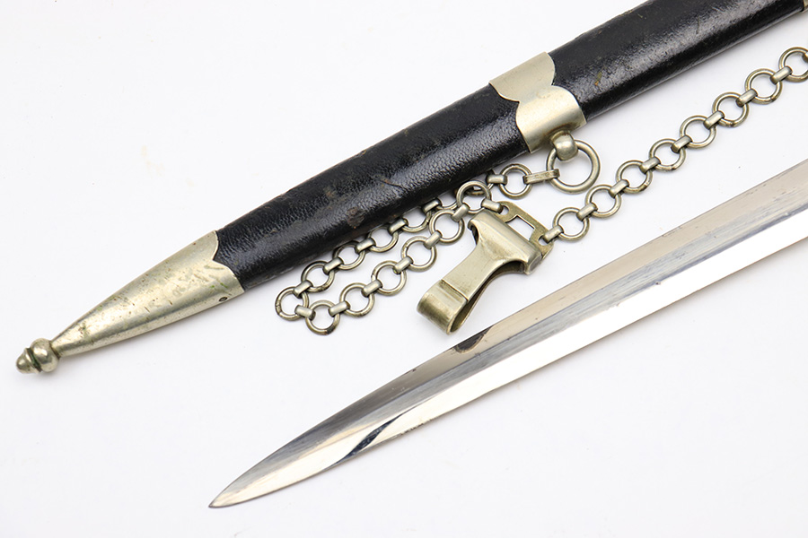 3/22/22 – This is an original, early WW2 production 1st model Luftwaffe dress dagger. The dagger come with an original scabbard and chain hanger. The hanger clip is unmarked, and the chain has some mild surface oxidation but no major issues. The scabbard has nice leather with some mild surface wear. The metal fittings on the scabbard are all intact. The blade is shiny and in great overall condition. No signs of sharpening, nor any rust or pitting. There is a Luftwaffe proof stamp on one side of the blade, and no maker stamps. There’s some normal patina on the hand guard and pommel, as well as on the handle, but no major issues.
