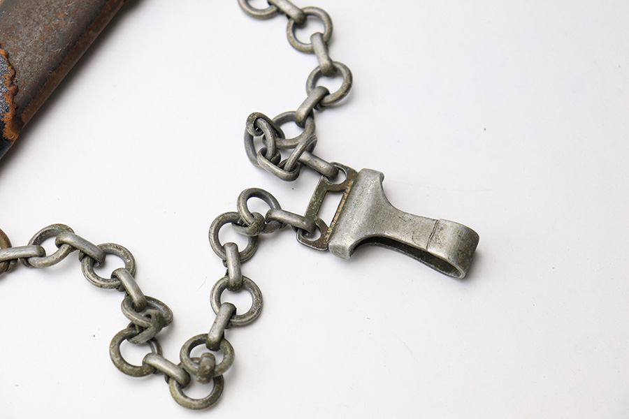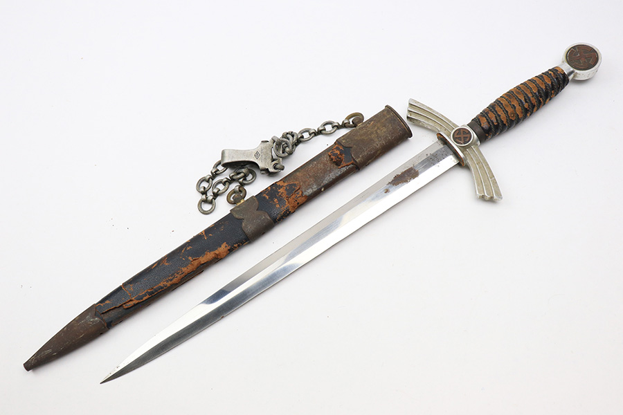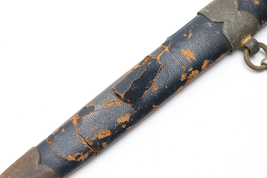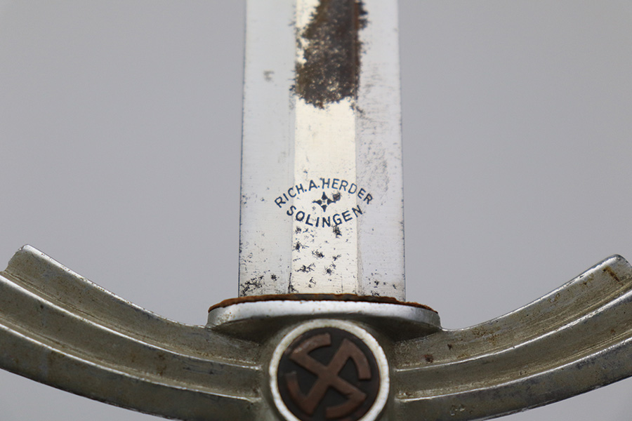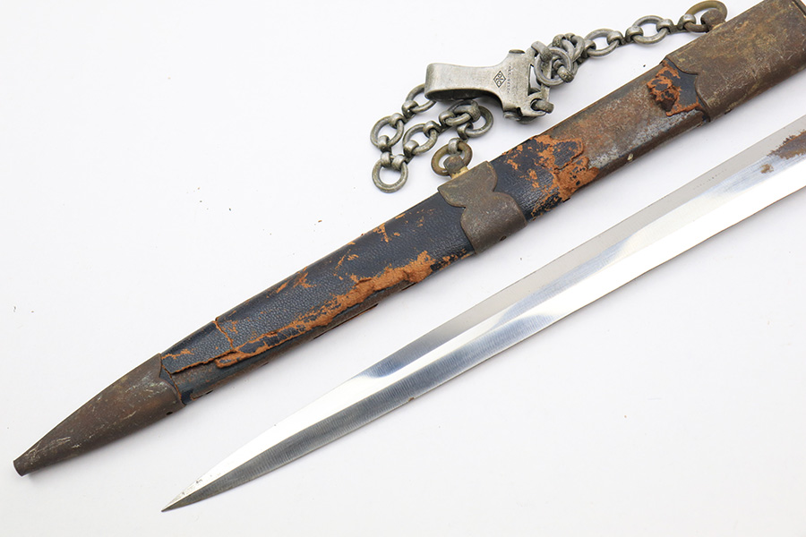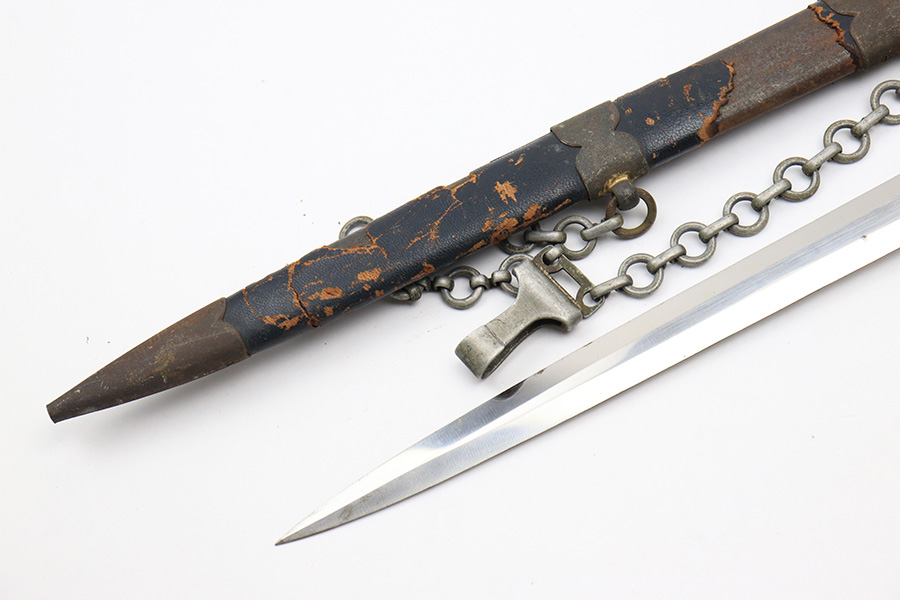 12/30/22 – This is an original early Luftwaffe dagger. This type 1 dagger comes with an original scabbard and chain hanger. The blade is maker stamped by Rich. A. Herder, and has very nice cross graining. There are no signs of sharpening, but there are some spots of rust on each side of the blade. The leather stopper is still present, but shows cracking and wear. The handle shows similar surface scuffing and wear throughout the leather. Still more leather wear is found on the scabbard, where the leather has cracking and is missing from certain areas completely. The metal on the scabbard has a dark patina throughout and shows aging. The toe of the scabbard is missing one screw as shown in photos. The hanger is OLC maker stamped.