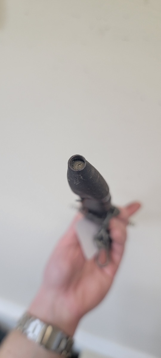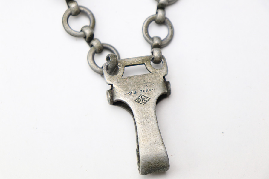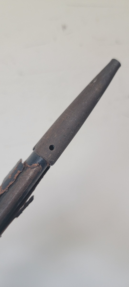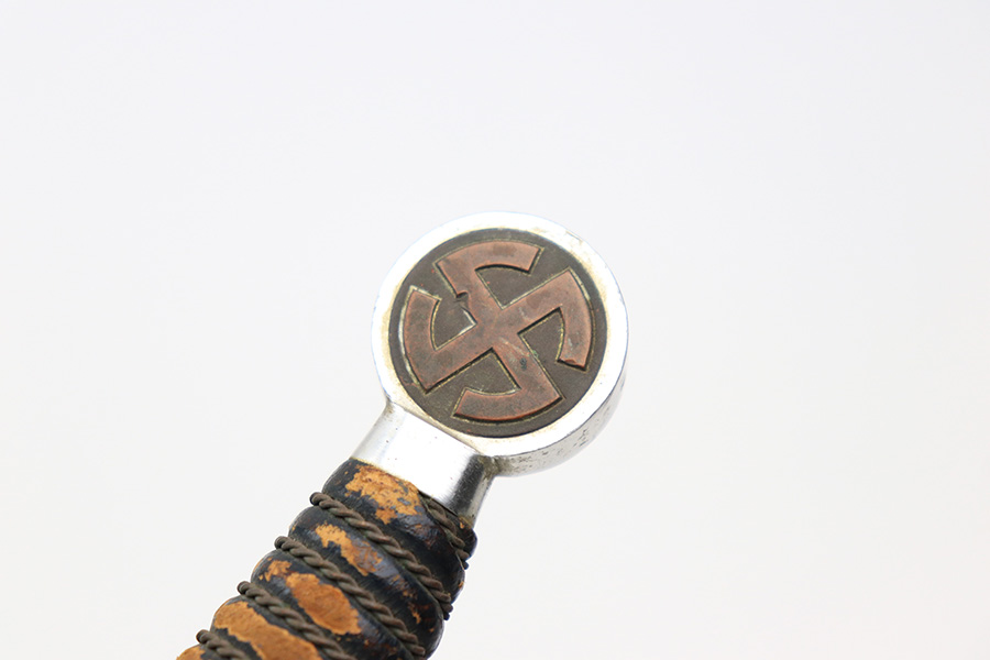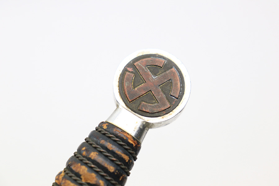 12/30/22 – This is an original early Luftwaffe dagger. This type 1 dagger comes with an original scabbard and chain hanger. The blade is maker stamped by Rich. A. Herder, and has very nice cross graining. There are no signs of sharpening, but there are some spots of rust on each side of the blade. The leather stopper is still present, but shows cracking and wear. The handle shows similar surface scuffing and wear throughout the leather. Still more leather wear is found on the scabbard, where the leather has cracking and is missing from certain areas completely. The metal on the scabbard has a dark patina throughout and shows aging. The toe of the scabbard is missing one screw as shown in photos. The hanger is OLC maker stamped.