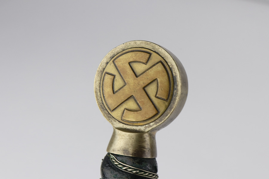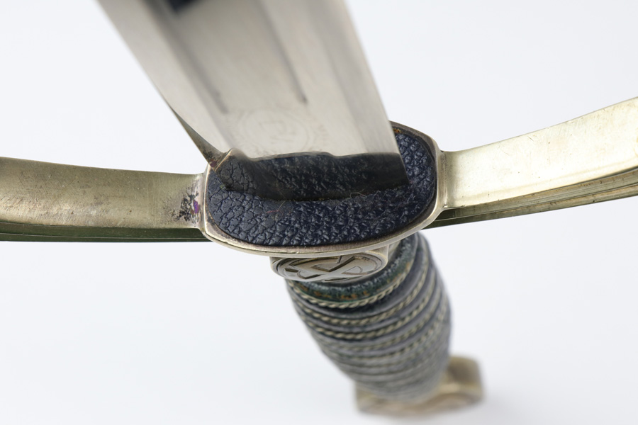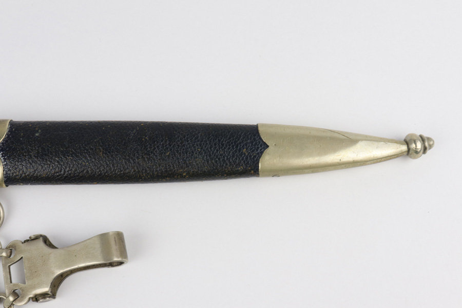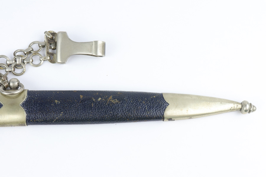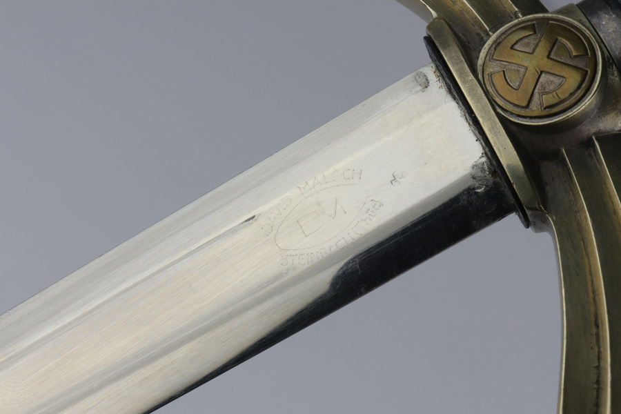 7/3/19 – This is an original 1st model Luftwaffe dagger, complete with the original scabbard and chain. The hanger and chain are unmarked but look aged and feel original. The scabbard has light paina on the metal fittings, and a slight bend at the tip. Leather is in tact. The blade is clean and excellent, but the maker marking is unusually weak. This maker reads “David Malsch , Steinbach (Thur)”. The leather handle is excellent. We believe this is original despite the weak maker marking.