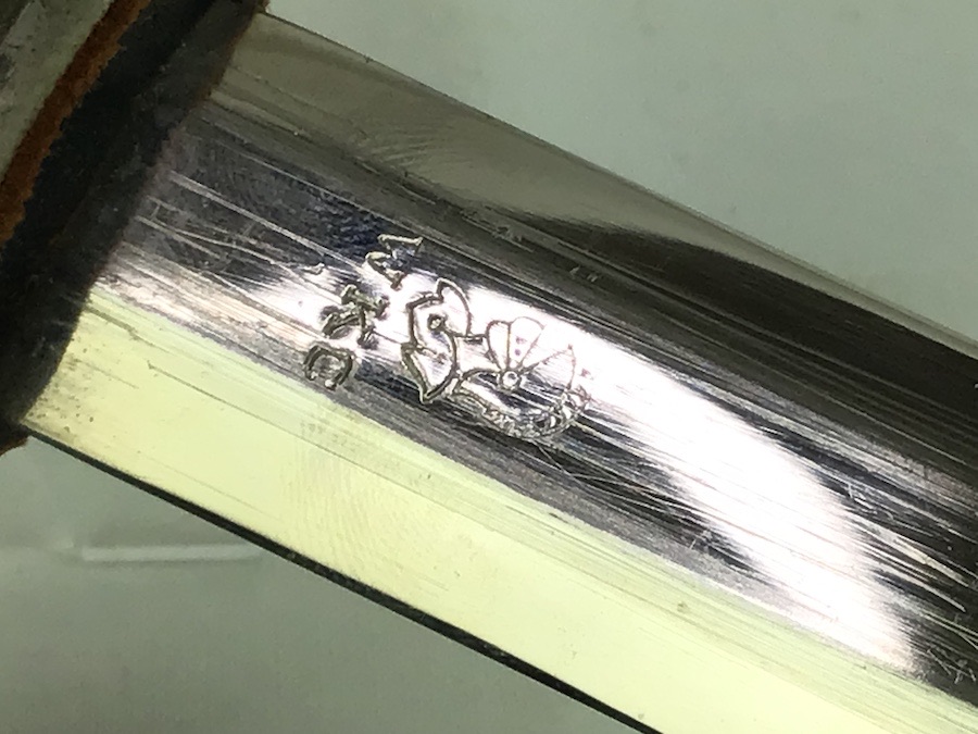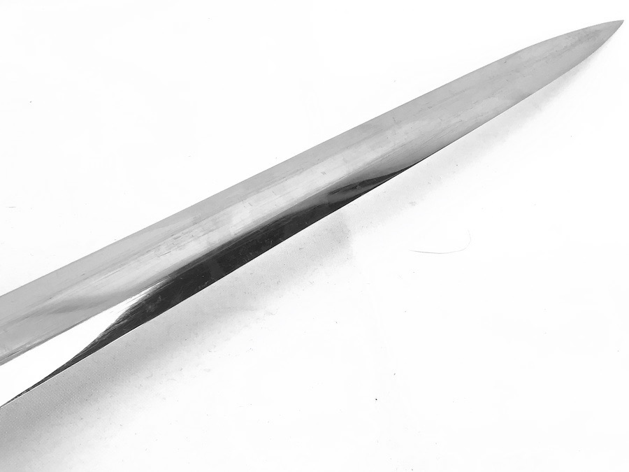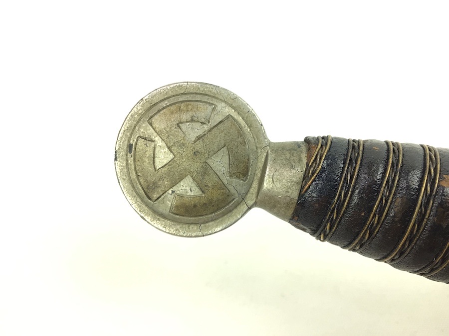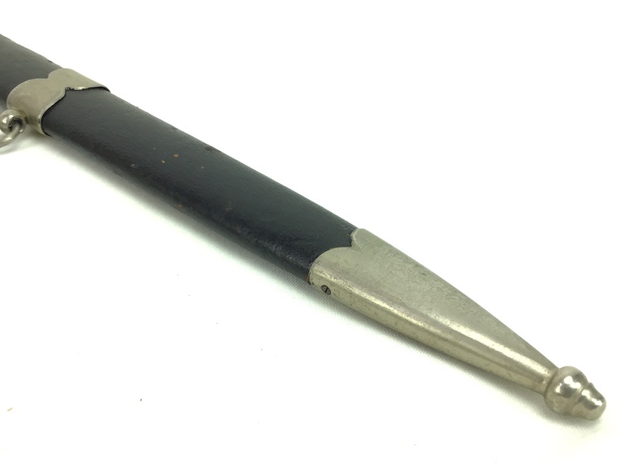 8/24/24 – This is an original, early / pre WW2 1st model Luftwaffe dagger. The dagger is all original and comes with an original scabbard and chain hanger. The blade is maker stamped by WKC on the base of one side. There are no other markings on the blade. There’s some mild oxidation and dark spotty discoloration but overall the blade is in great shape with no signs of sharpening. The leather handle has some fading of the blue leather but is completely in tact with a tight weave. The metal hand guard and pommel both show patina throughout. The scabbard is in great overall condition despite some normal discoloration, aging, and use wear. The chain hanger is original and OLC maker stamped on the closure clasp.