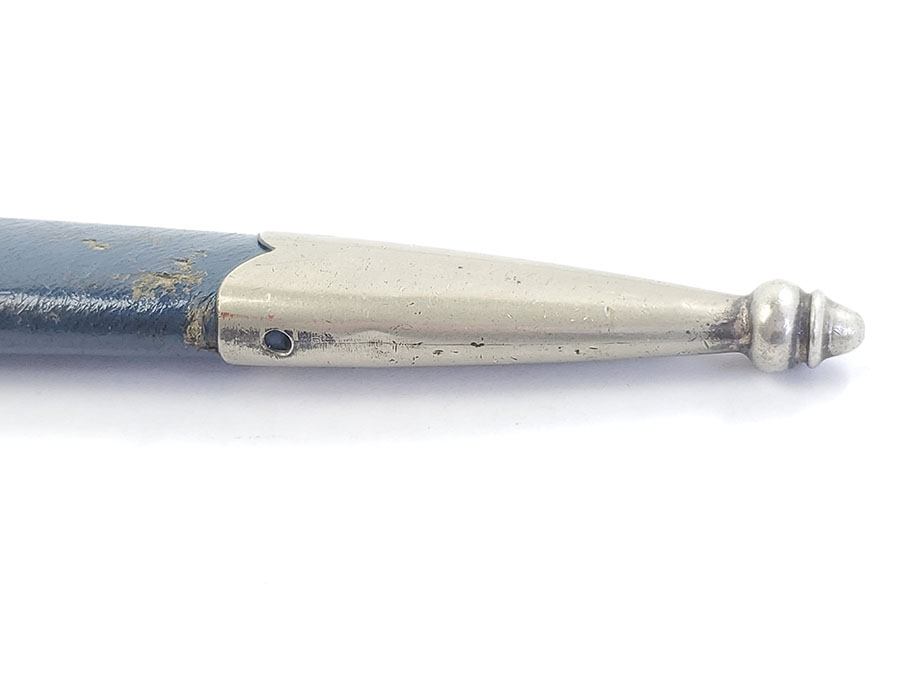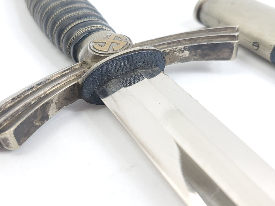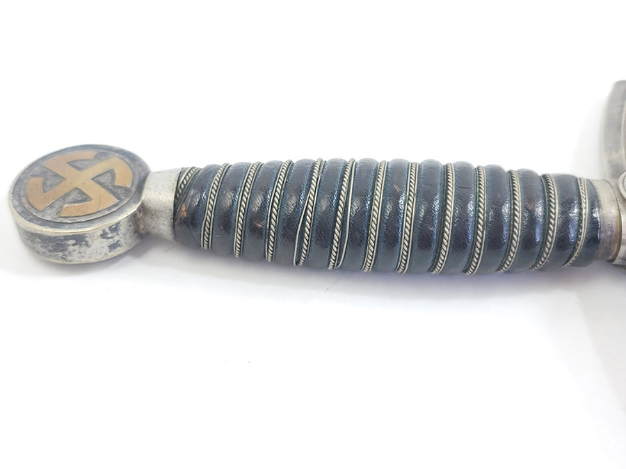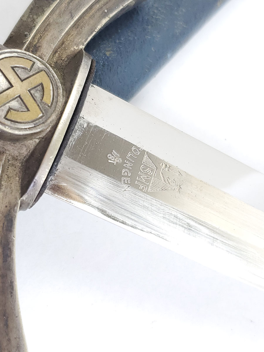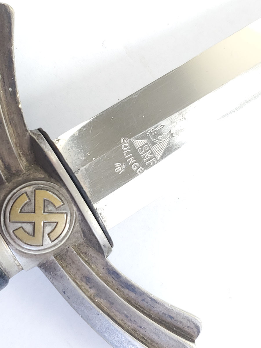 6/9/20 – This is an original 1st model Luftwaffe dagger made by SMF. The dagger comes with an original scabbard and chain, as shown. Overall this piece is in excellent condition. The blade is shiny and clean with only very minor scabbard wear. The reverse side is SMF maker marked. The hand guard has some small areas of dark discoloration, but no major issues or wear. The stretched leather handle has light fading of the blue finish, but no major issues. The scabbard has some small scuffs on the leather. The chain is unmarked but has a strong clasp. One chain link is missing, replaced with old metal wire.