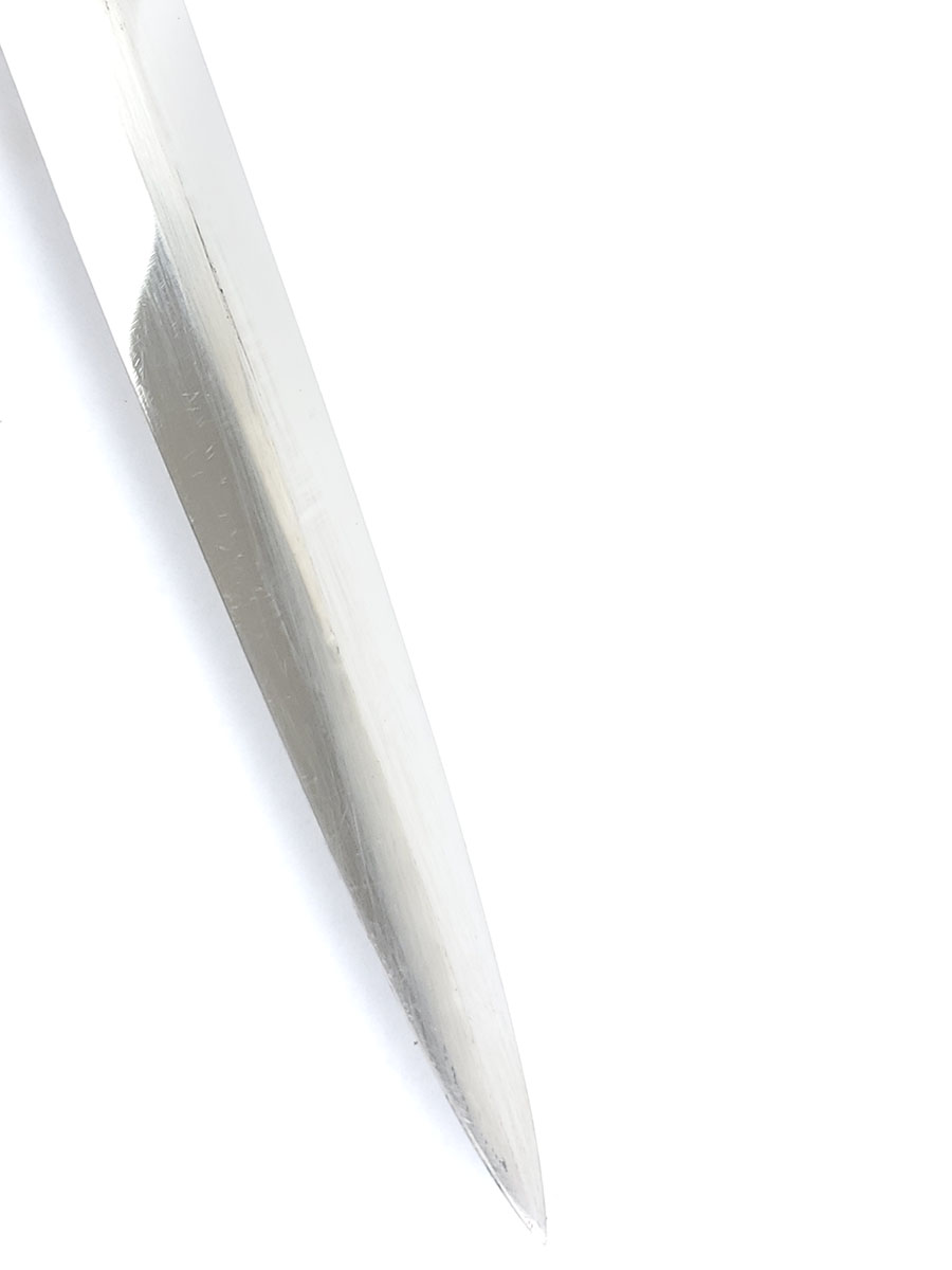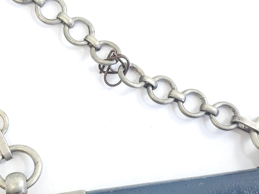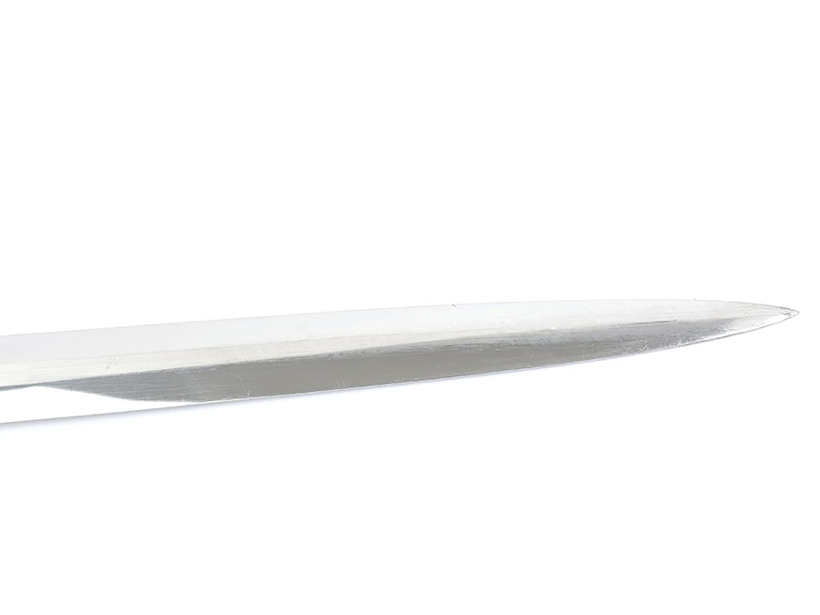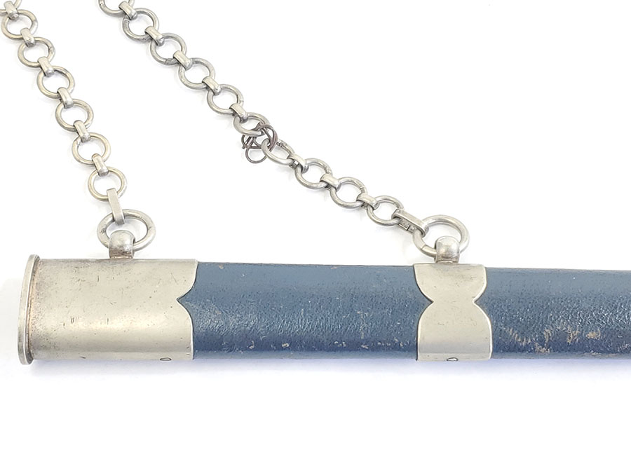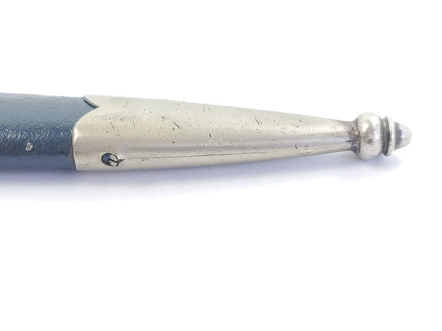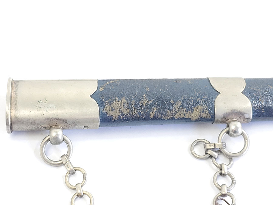 6/9/20 – This is an original 1st model Luftwaffe dagger made by SMF. The dagger comes with an original scabbard and chain, as shown. Overall this piece is in excellent condition. The blade is shiny and clean with only very minor scabbard wear. The reverse side is SMF maker marked. The hand guard has some small areas of dark discoloration, but no major issues or wear. The stretched leather handle has light fading of the blue finish, but no major issues. The scabbard has some small scuffs on the leather. The chain is unmarked but has a strong clasp. One chain link is missing, replaced with old metal wire.