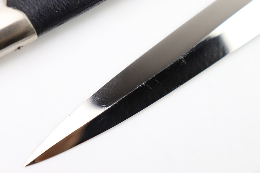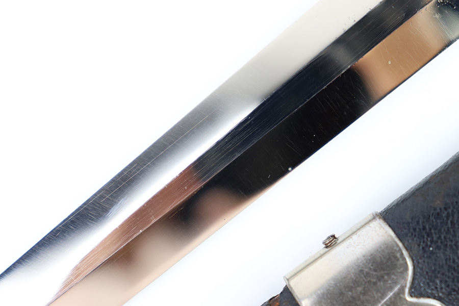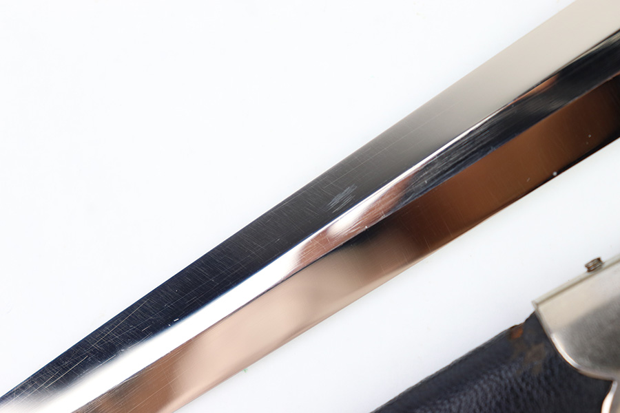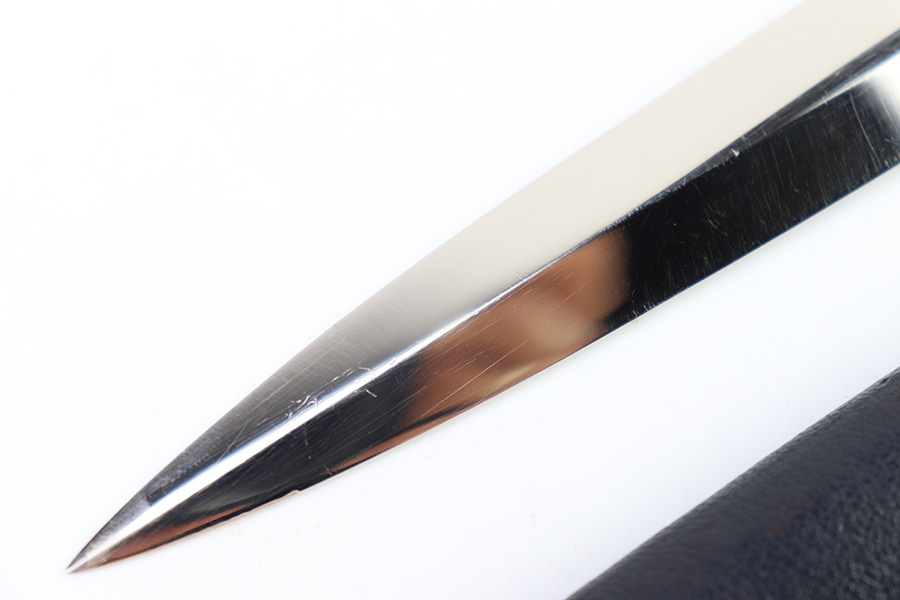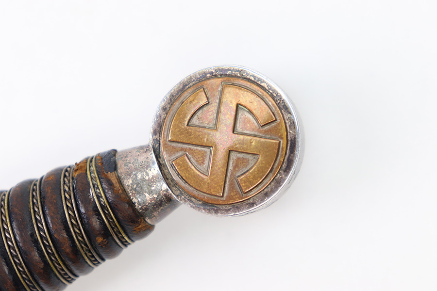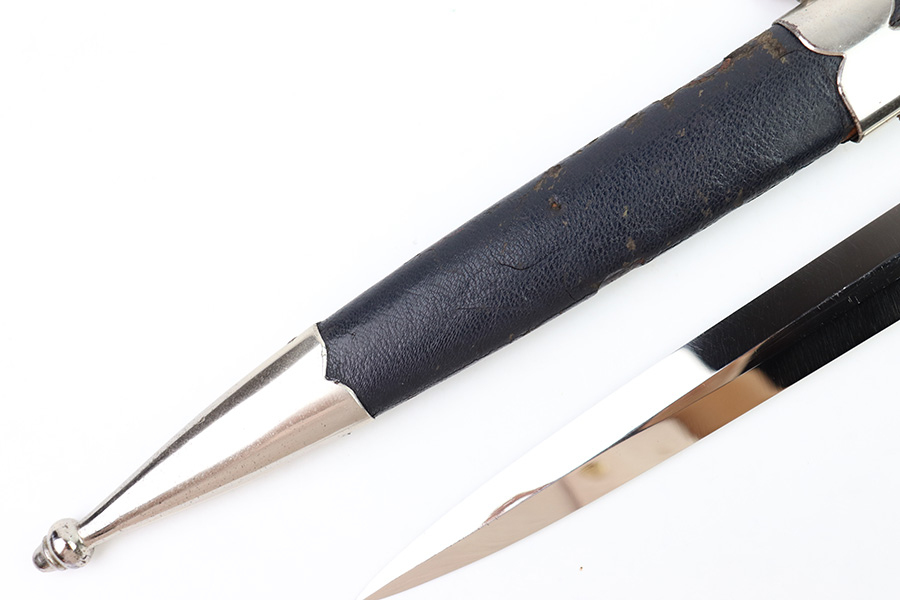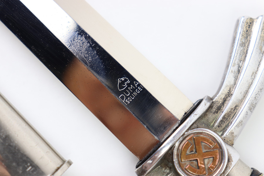 8/15/22 – This is an original, early variation 1st model Luftwaffe dagger. The dagger comes with an original scabbard and chain hanger, as shown. The blade is maker stamped by PUMA on one side, and has an excellent shiny finish throughout. There’s some mild surface speckling / oxidation but this is only in a few small spots. No signs of sharpening. The hand guard and pommel show similar surface patina throughout but the bronze coloring is still intact around the swastika logos. The handle has surface wear and natural handling deterioration, but no excessive damage. The scabbard has some areas of missing leather, but overall is in great condition. The hanger is maker stamped by OLC as shown. A very nice early example.
