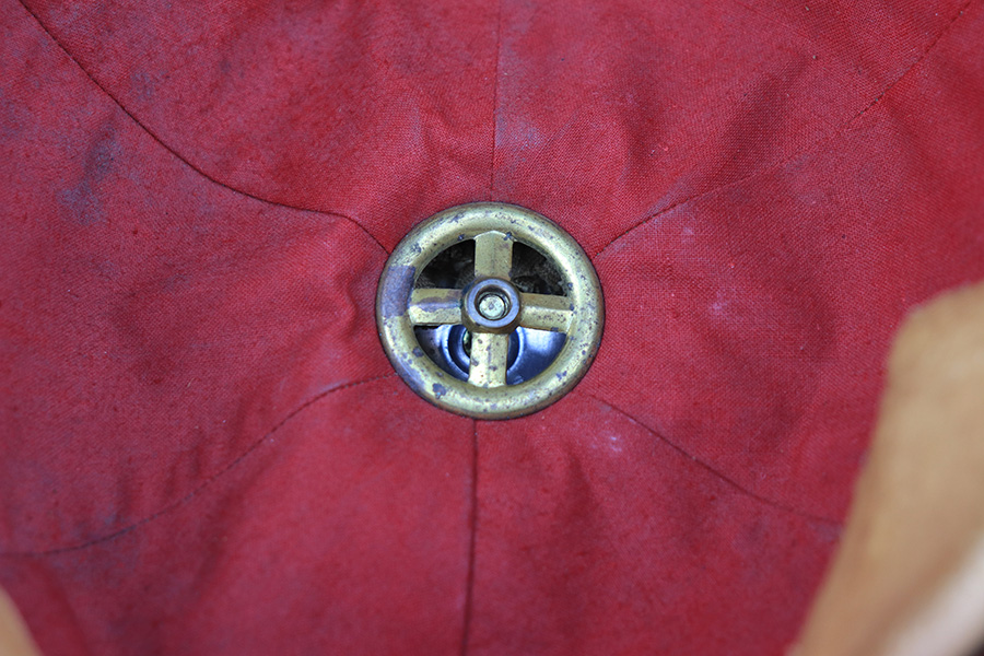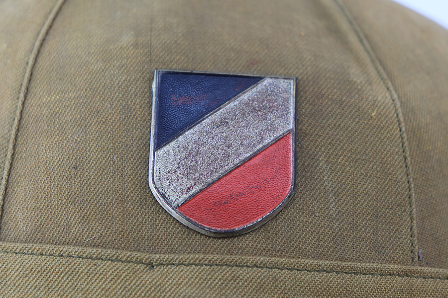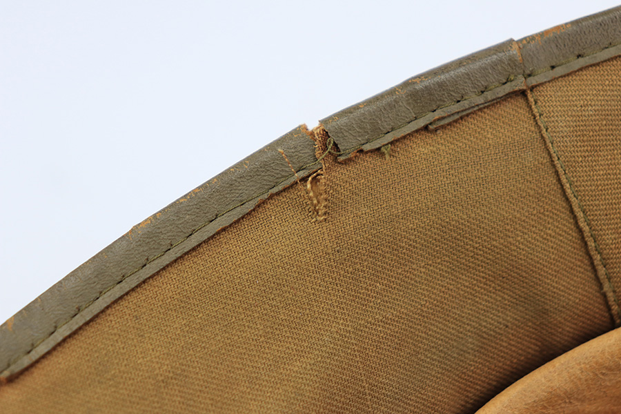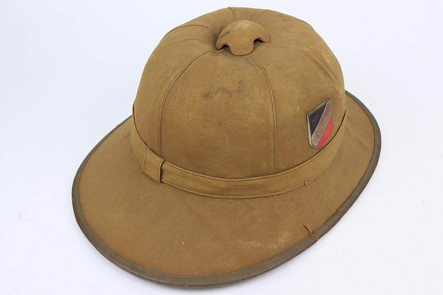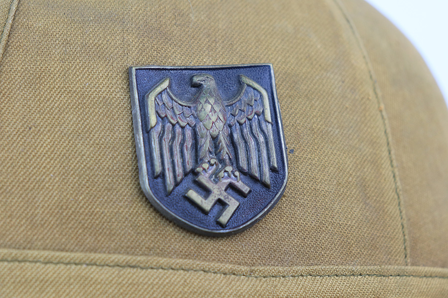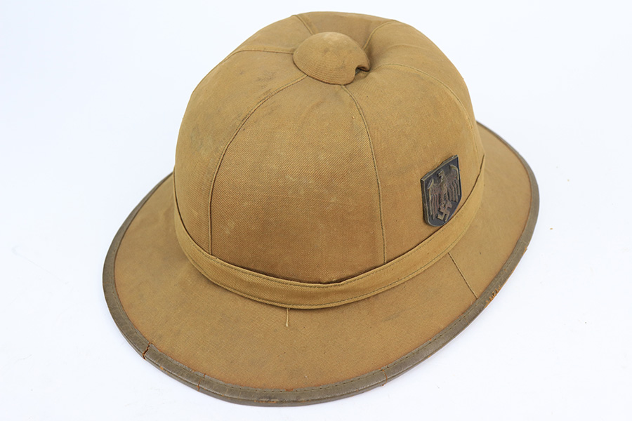 1/24/22 – This is an original 1st model Pith helmet from WW2. These helmets were used by the DAK and the 1st model helmets are much more scarce than the 2nd model Pith helmets. The 1st model has a cloth exterior and a molded cork brim. This example is in good overall condition with some honest wear from use and aging. There are two small cracks in the cork brim. The top of the helmet is also somewhat dilapidated. The interior is fairly clean and JHS maker stamped. Both exterior decals are in good condition. The eagle logo is only attached by one of the two fastening pins and can swivel as a result. Price reduced based on condition.