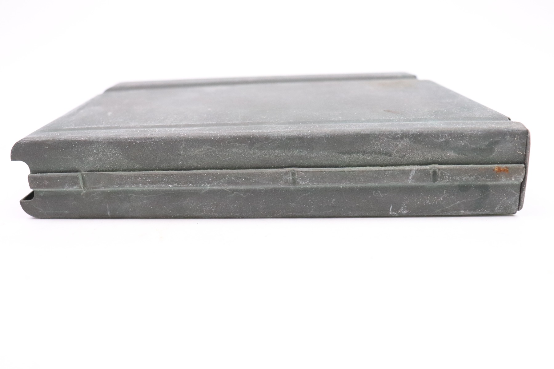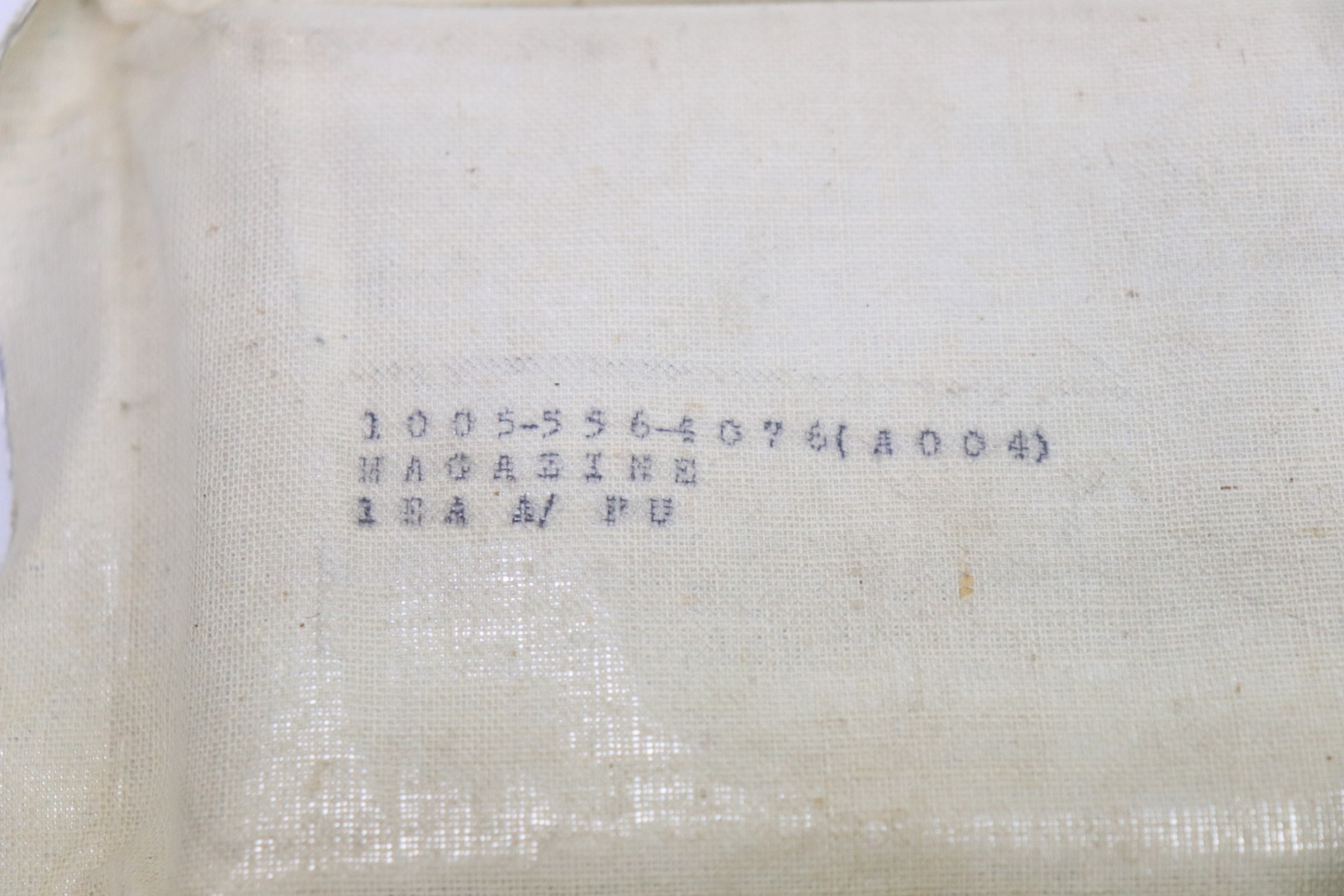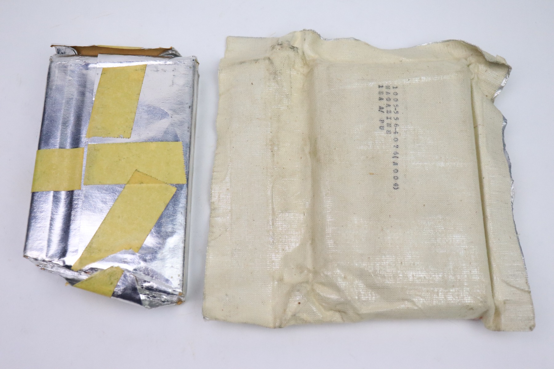 12/1/22 – This is a pair of BAR M1918 magazines. The magazines both come in their original wrapping, as shown. We opened / unwrapped one of the magazines for photos, and this magazine had no markings or stamps but is in great overall condition with some mild surface discoloration as shown. The spring is strong and excellent. We assume these both hold 20 rounds of .30-06 ammunition. The magazine with unopened wrapping is dated 1960 on the exterior in ink.