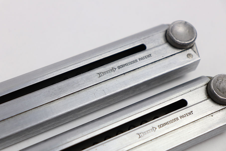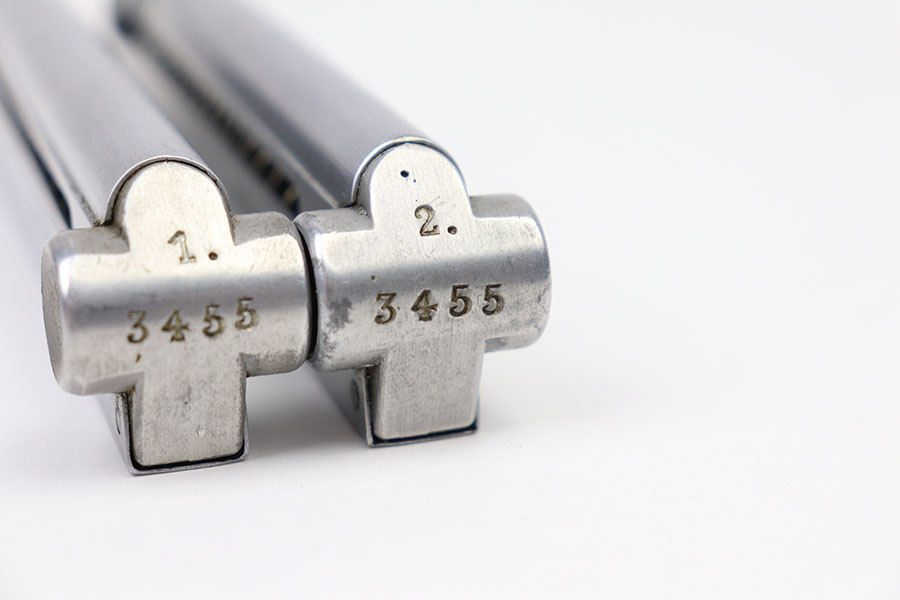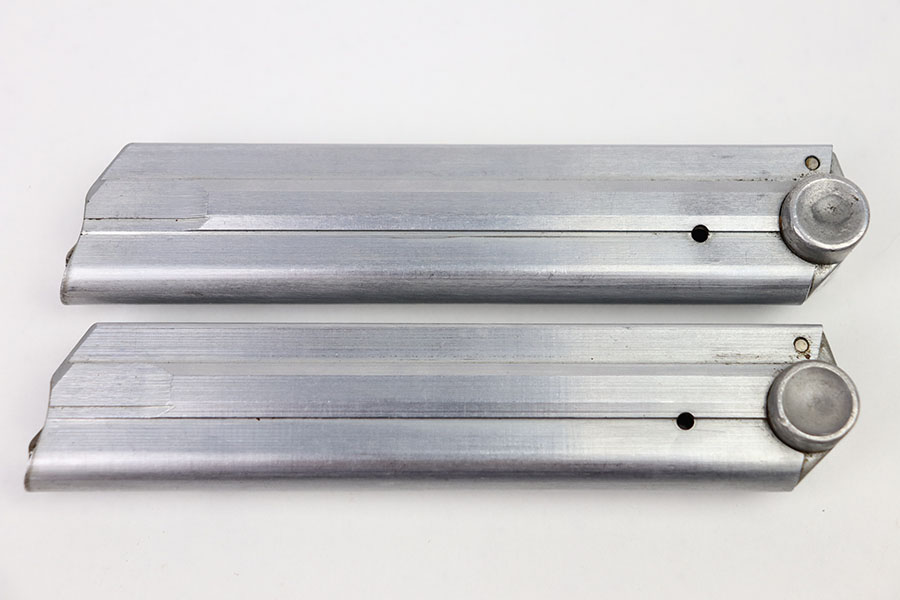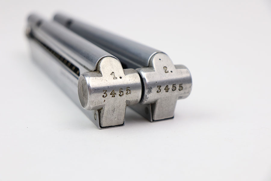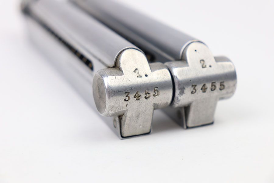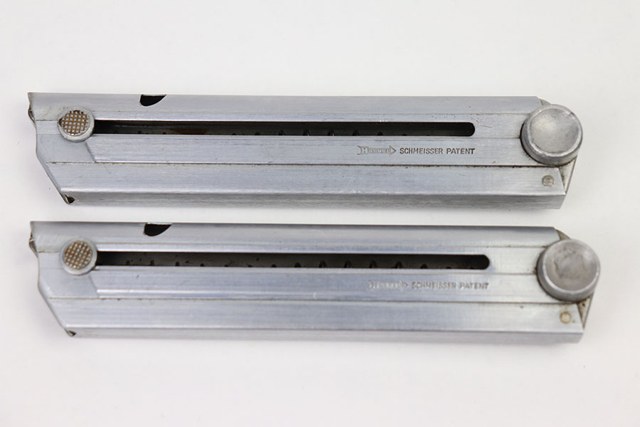 3/25/21 – This is an original matching numbered pair of Police Luger magazines. Both magazines are in mint condition with a Haenel maker stamp on the side of the frame. The base of each magazine is serial numbered and numbered “1”, and “2” for the main and spare magazines. The springs are strong and fully functional.