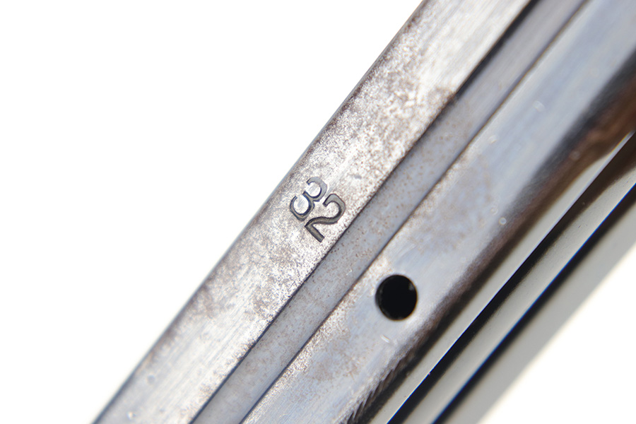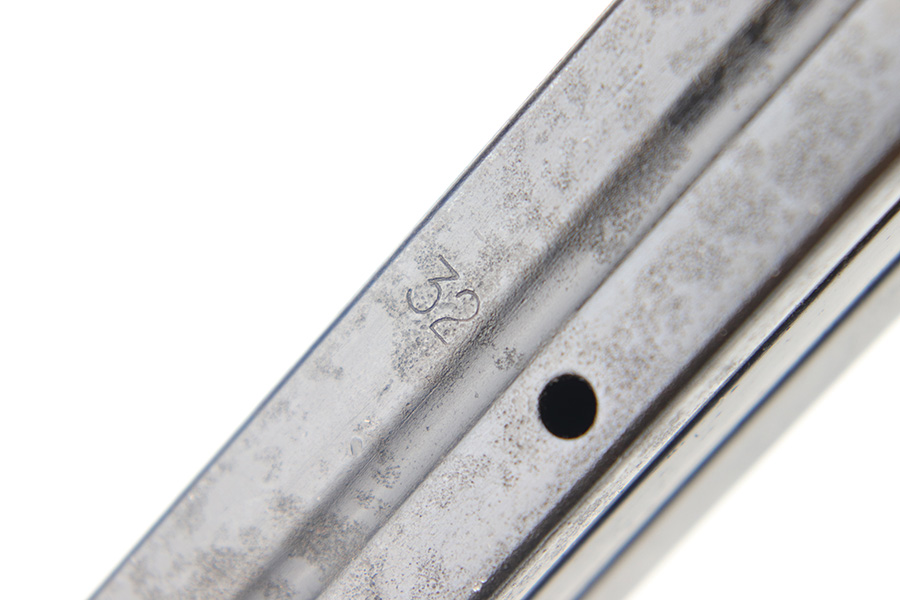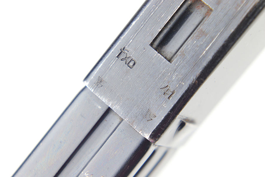3/23/23 – This is a pair of original MP 40 magazines from WW2. Each magazine is 1941 dated on the spine with waffen proofs and a 3-letter maker code. One magazine is “ayf” and the other is “fxo”. The magazines are in good condition with most of the original blued finish intact, but there is some mild surface patina on each magazine. Each magazine also has a few small areas of surface rust as shown in photos. The springs are strong and fully functional, each holding 32 rounds of 9mm.