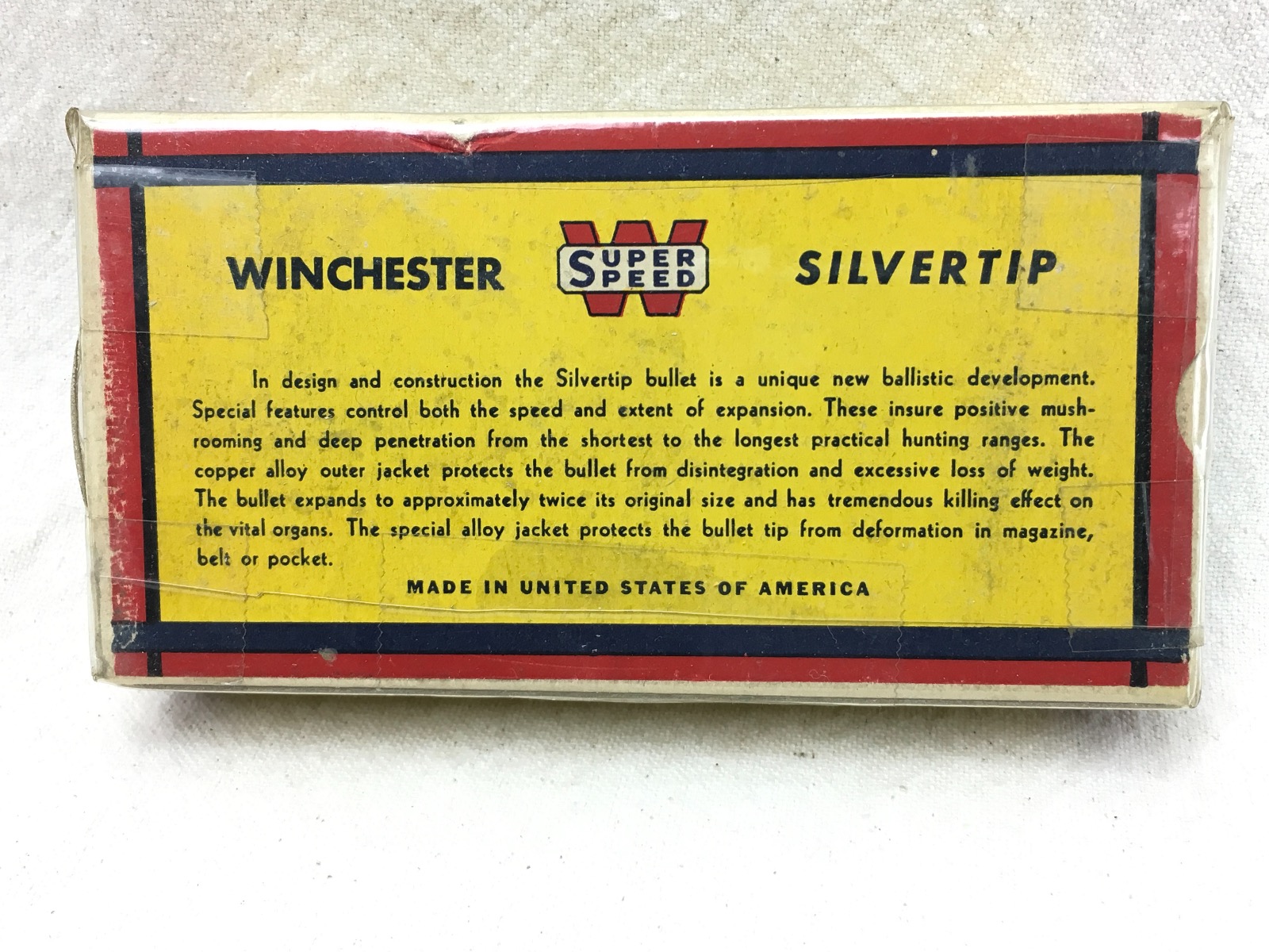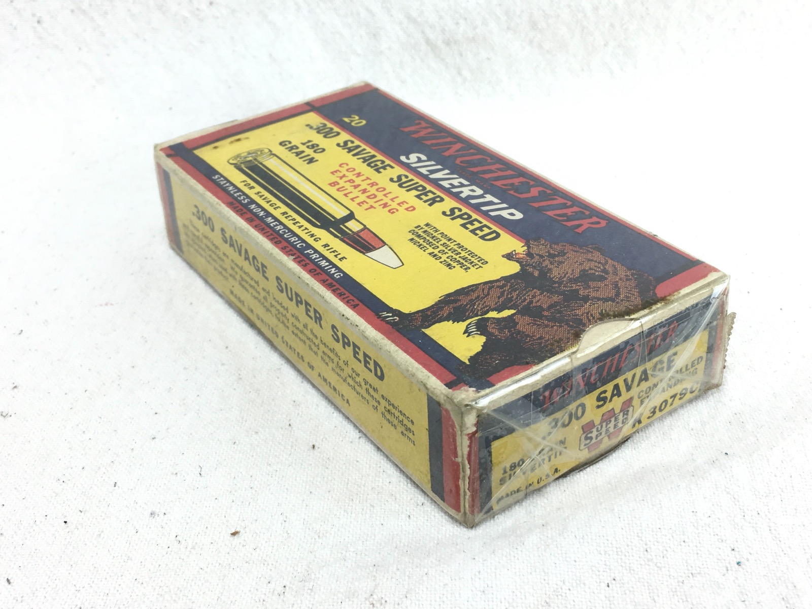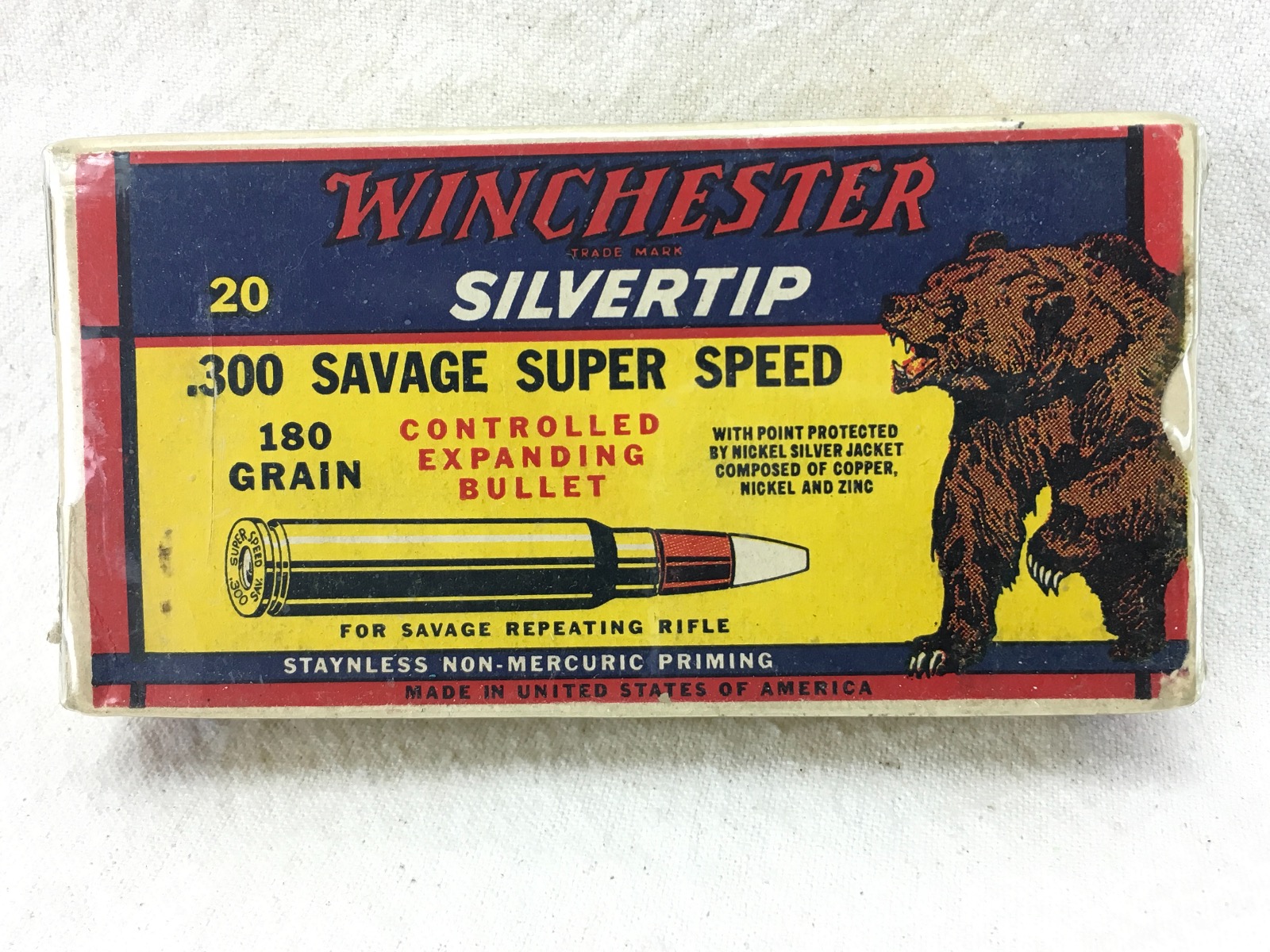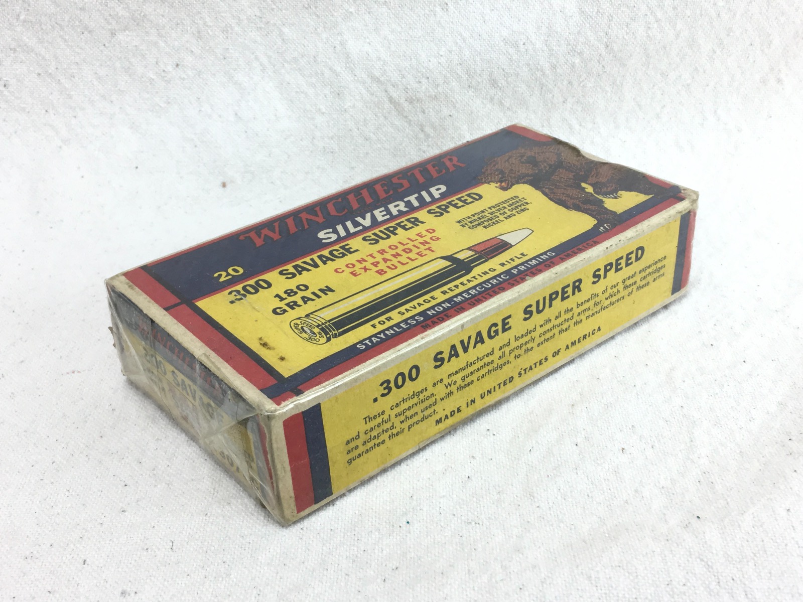1/9/19 – This is a full, original box of Winchester Silvertip .300 Savage cartridges. This “Grizzly Bear” box is in shrink wrap and in excellent condition. This is one of the most collectable styles of Winchester boxes. These are hard to find, especially in this condition. This example shows bright color and great graphics. Hardly any edge wear. All cartridges are original to the box. Only Two boxes available. Price is for one box.