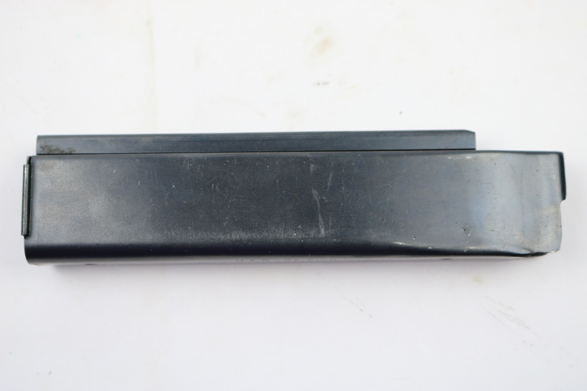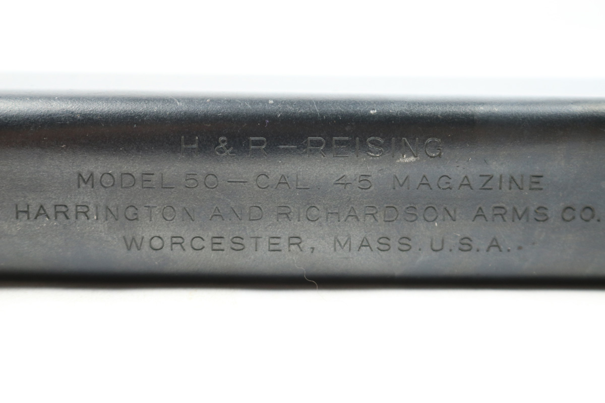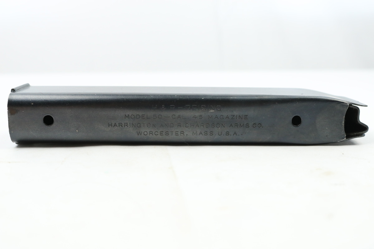 8/24/18 – This is an original early WW2 production 20 round Reising magazine. The magazine has an earlier blued finish and is in excellent condition. Fully functional, and holds 20 rounds of .45 ACP. Made by Harrington & Richardson. Guaranteed original.