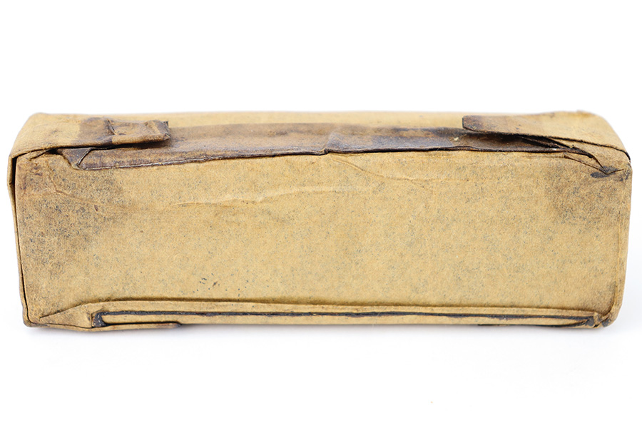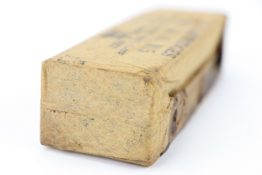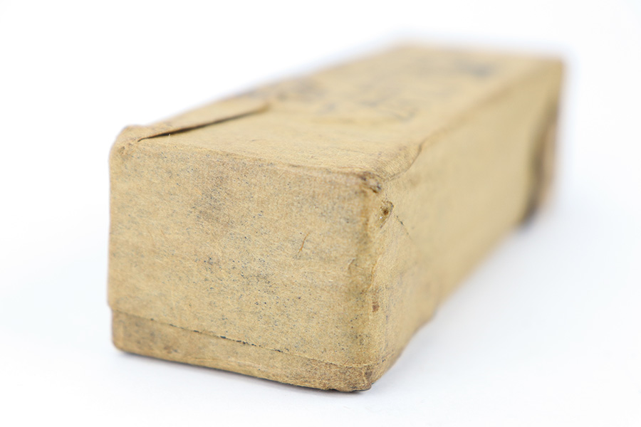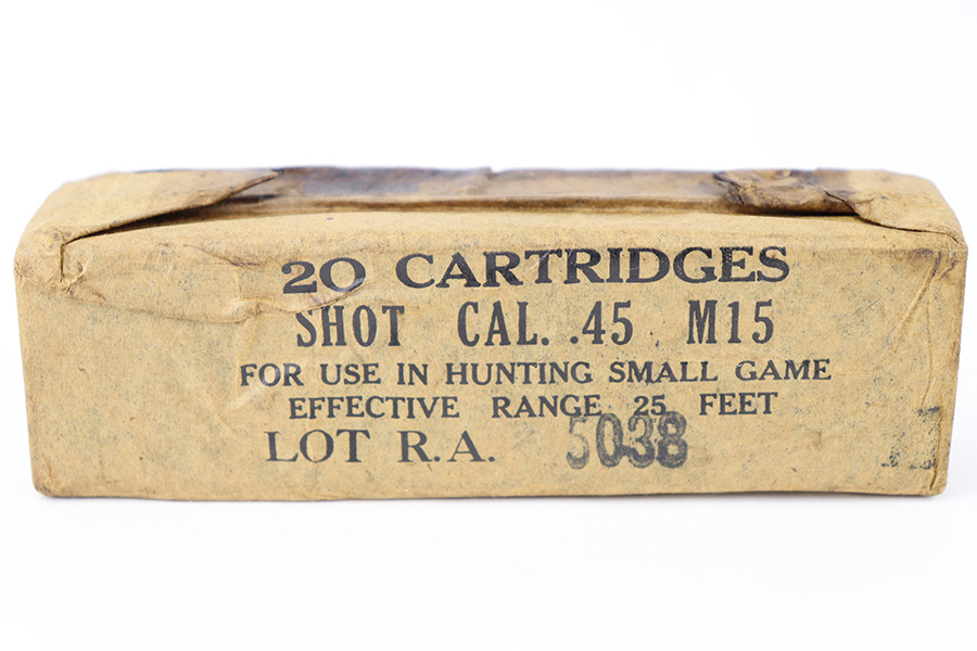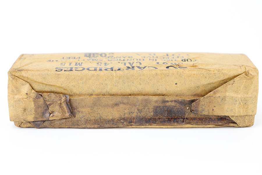 1/2/24 – This is a vintage box of US .45 caliber pistol ammo. The box is unopened with the original label still intact. There’s some mild surface wear and aging on the exterior. The style of label and ink stamped lot number indicates this as commercially sold ammunition from the WW2 era.