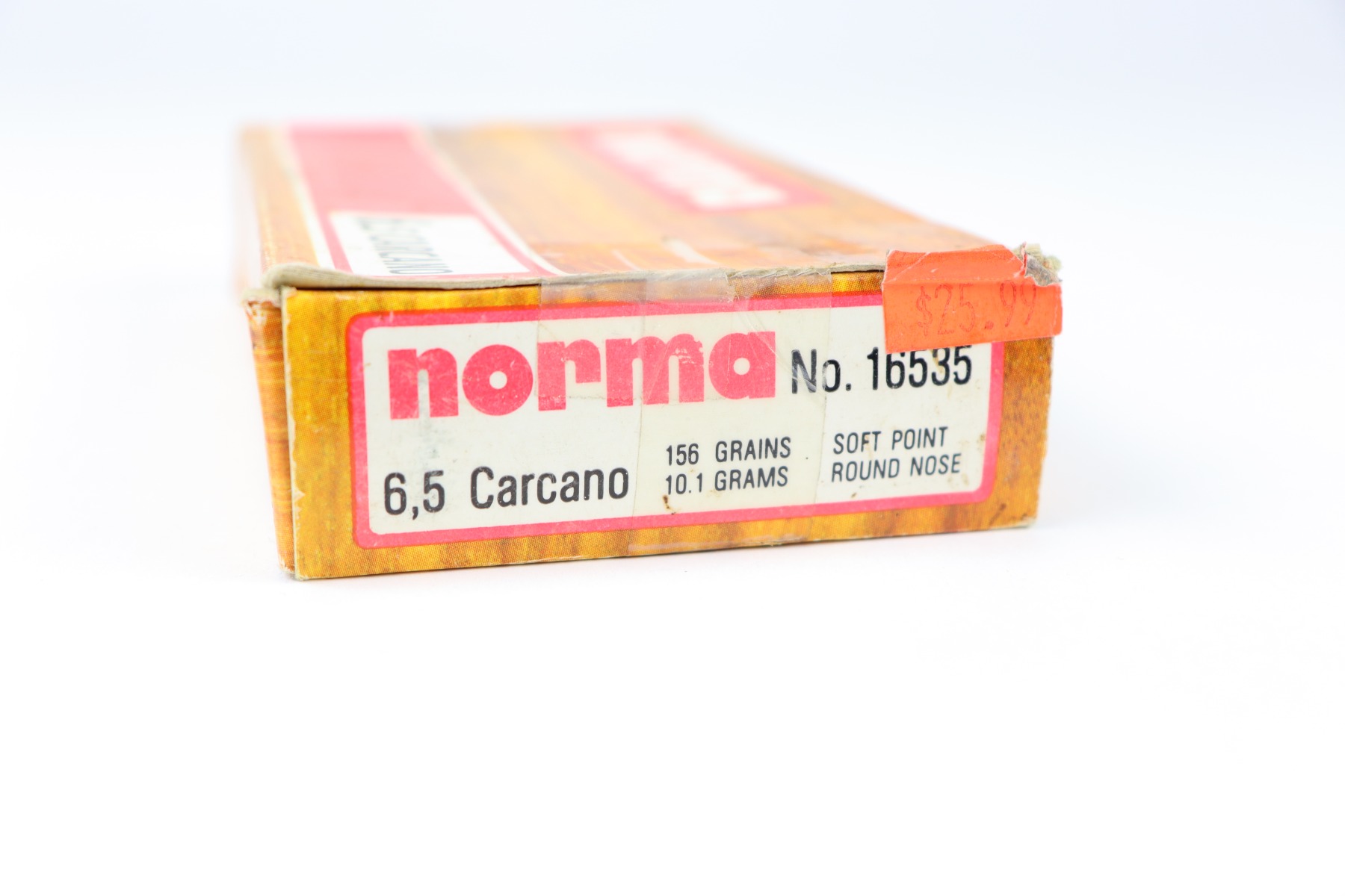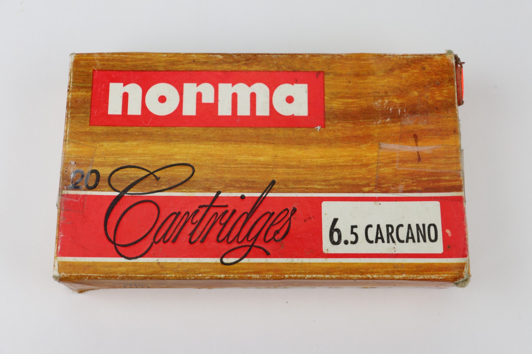 9/29/23 – This is a box of 20 rounds of Norma 6.5mm Carcano rifle ammunition. Great condition.