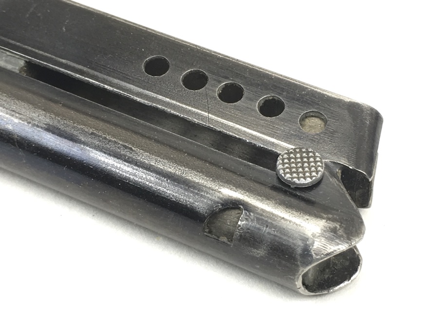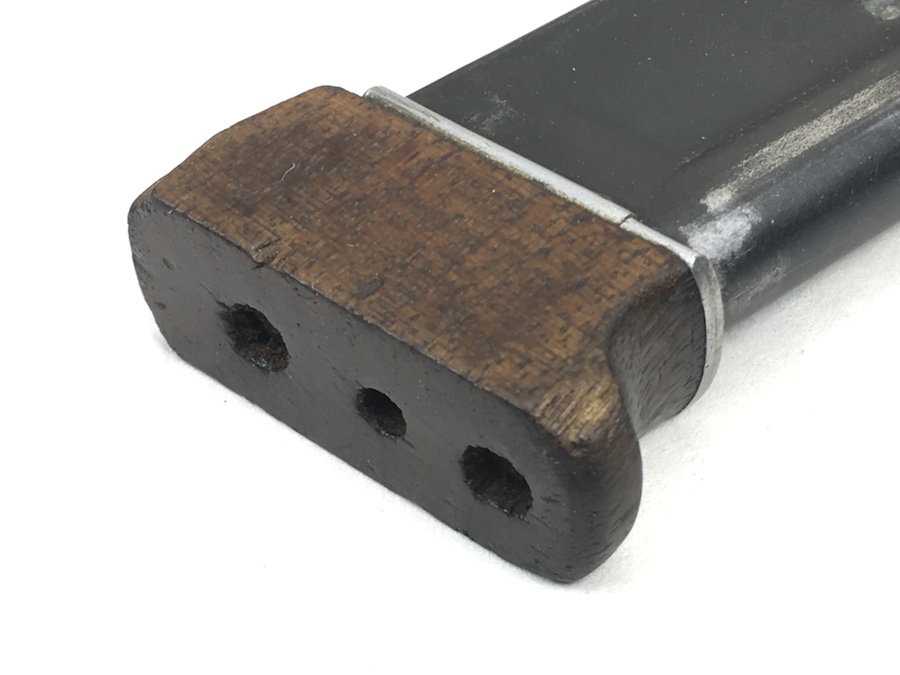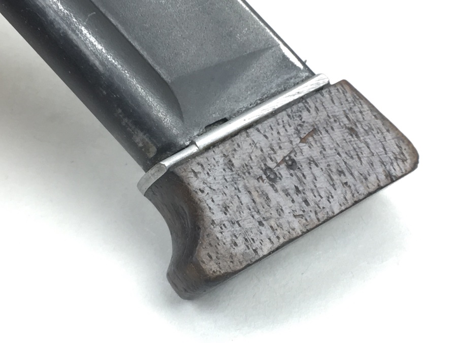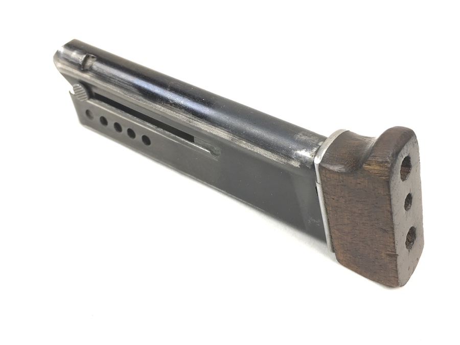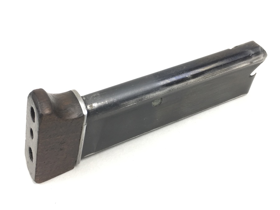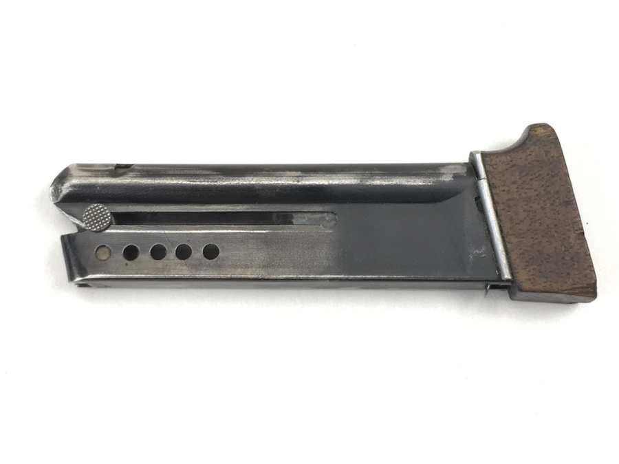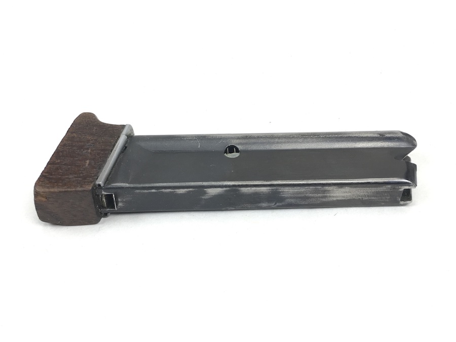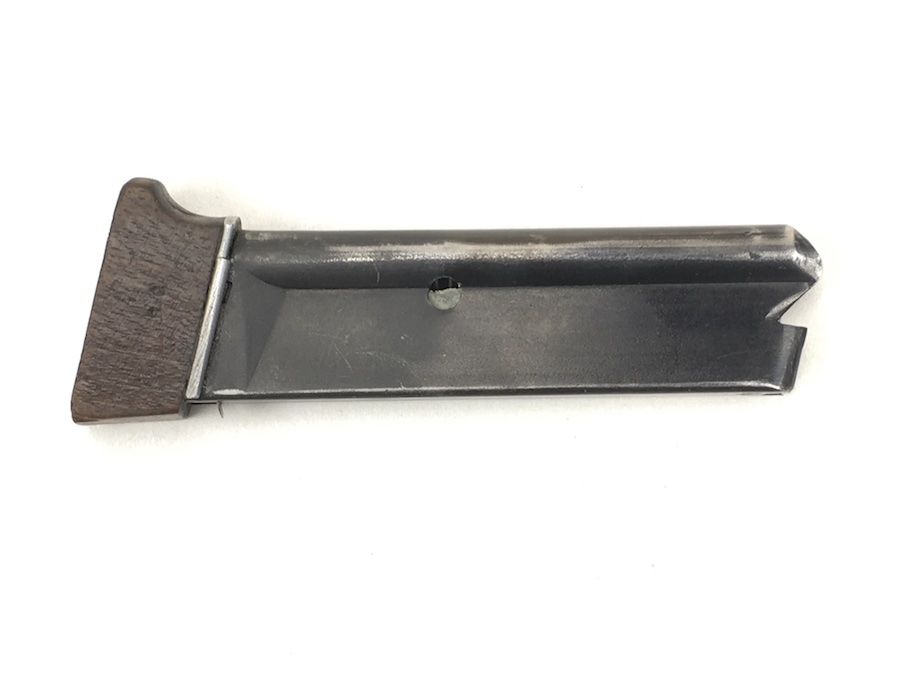 7/1/19 – This is an original Walther Olympia magazine in .22 caliber. This was for the early style pistols. These are fairly rare magazines. This magazine has a hardwood base and the numerals “08” stamped on the side. There are 2, very small chips on the base. The magazine frame has no rust or pitting. Minimal bluing wear. Strong, smooth spring. Holds 6 rounds. There is a lead “plug” in the bottom of the magazine to restrict the capacity. Guaranteed original and fully functional.